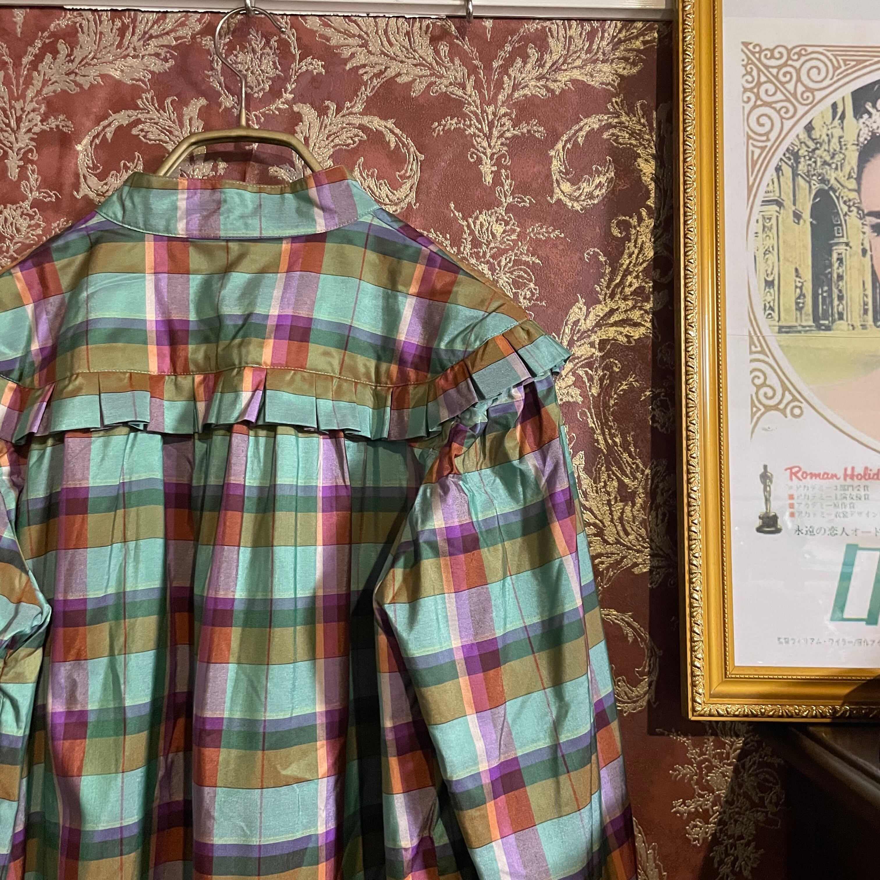 ミント、紫、オレンジ、黄色のチェック柄ブラウスです。