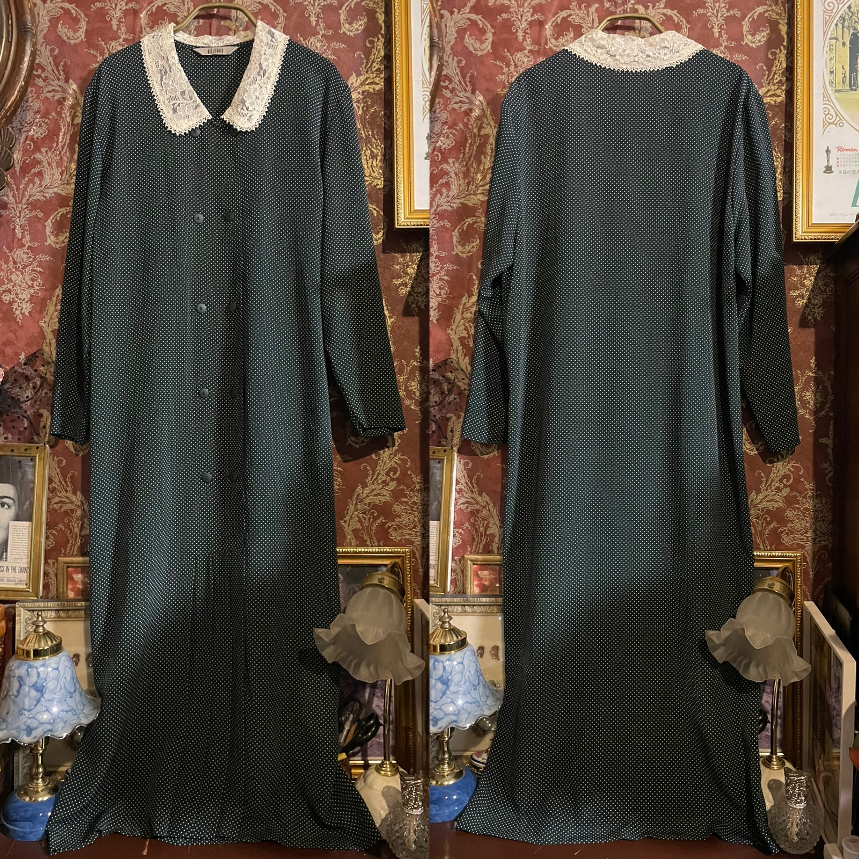 モスグリーンをベースに、白のピンドット柄のワンピースです。
