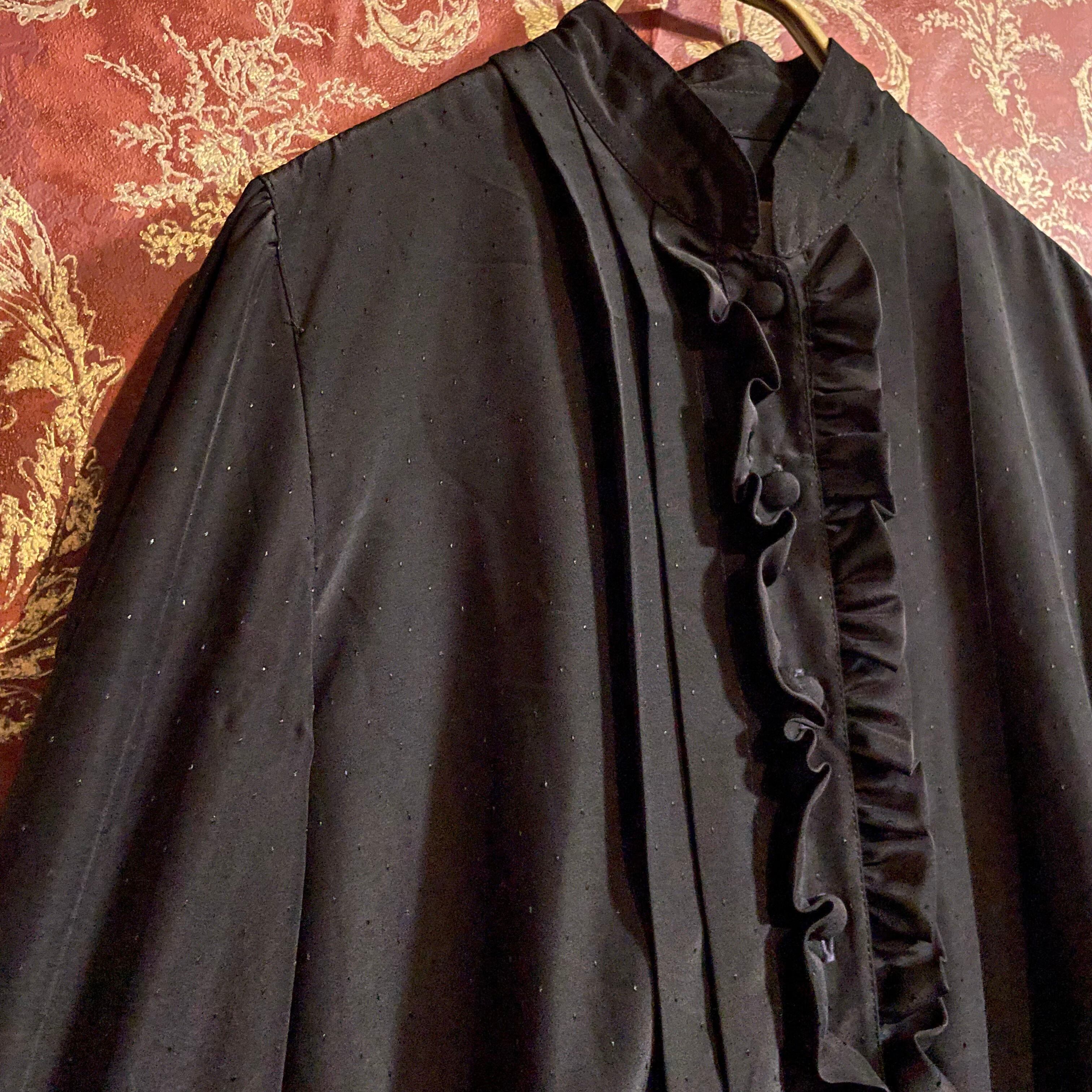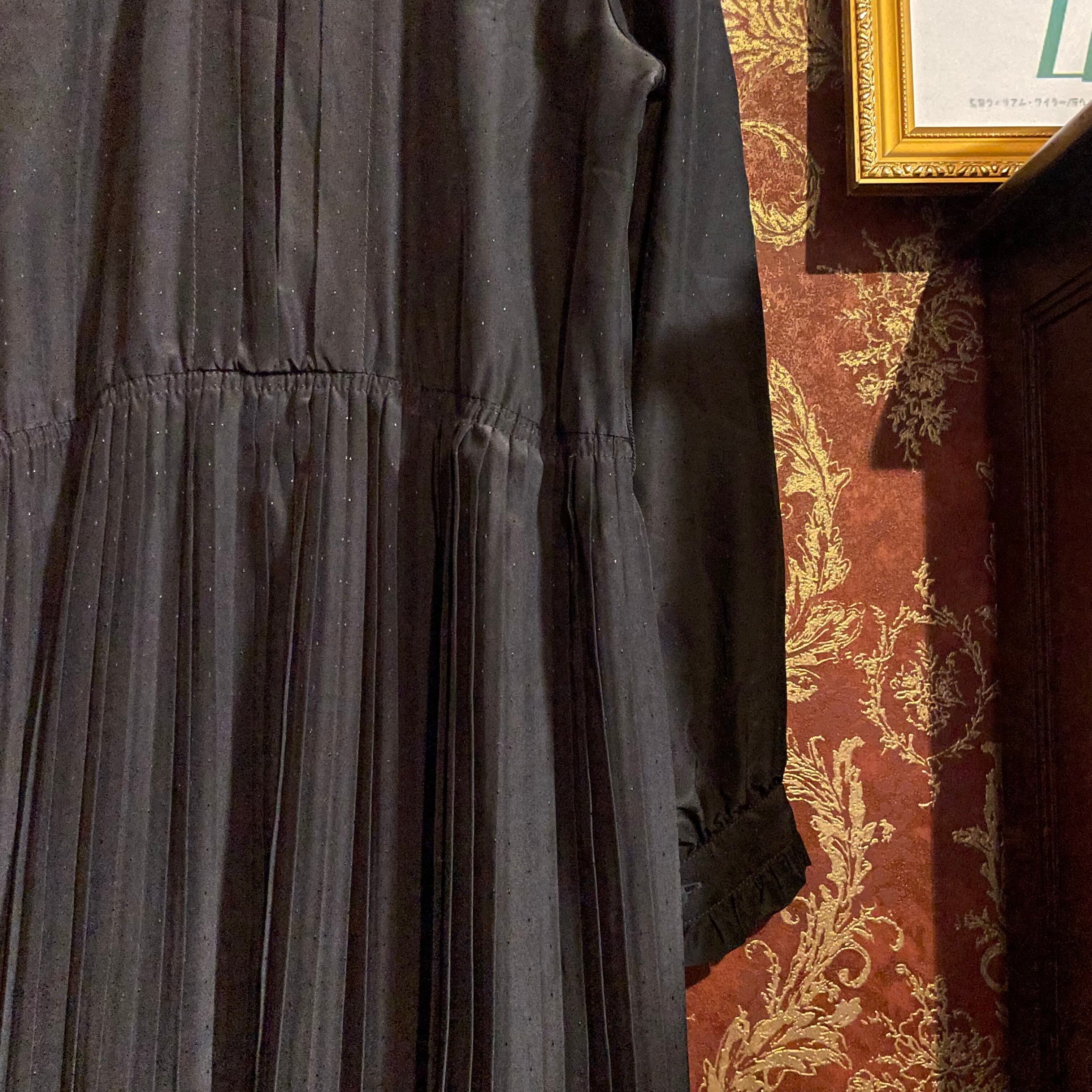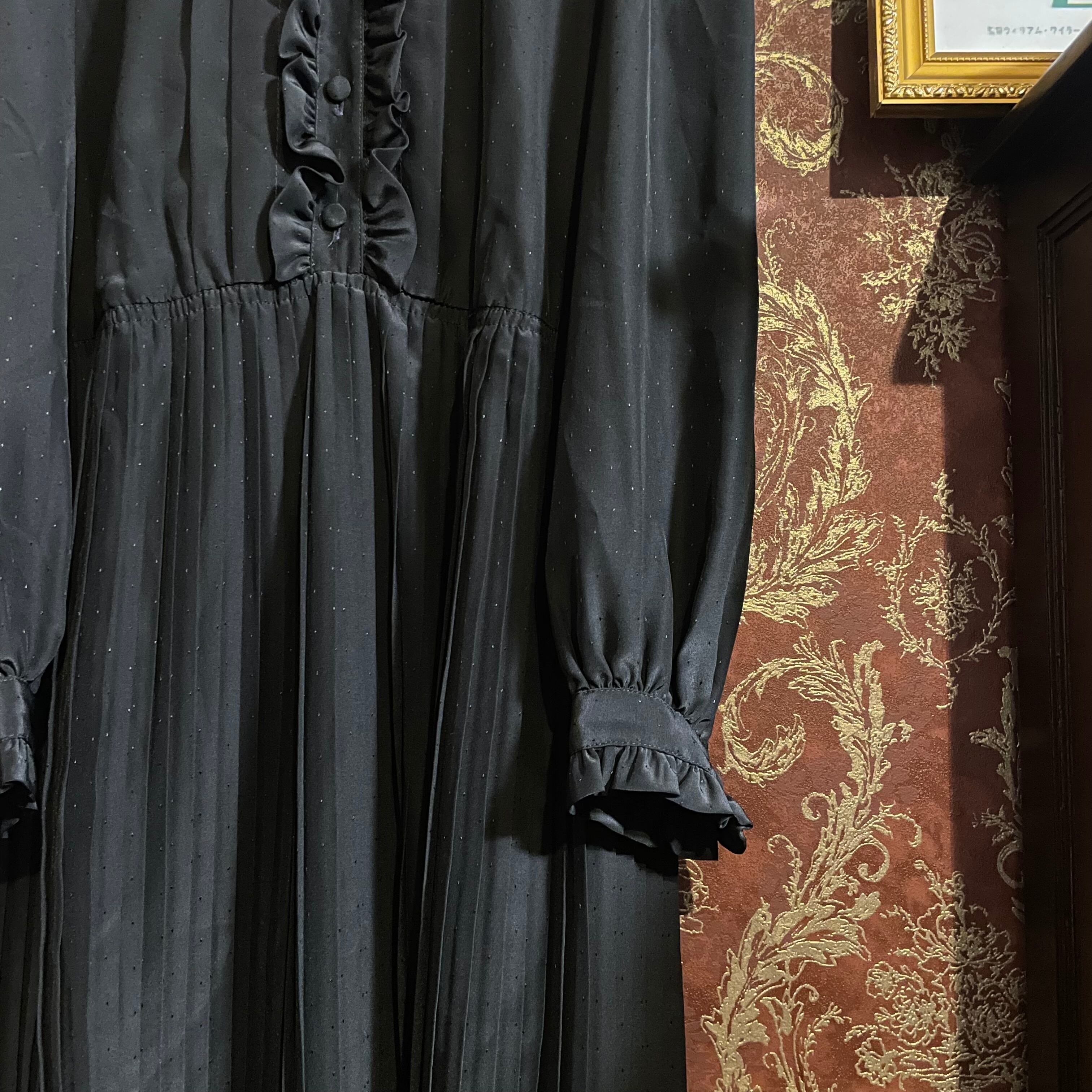 前立てと袖口には共布のフリルが付けられていて、スカート部分は細かなプリーツです。