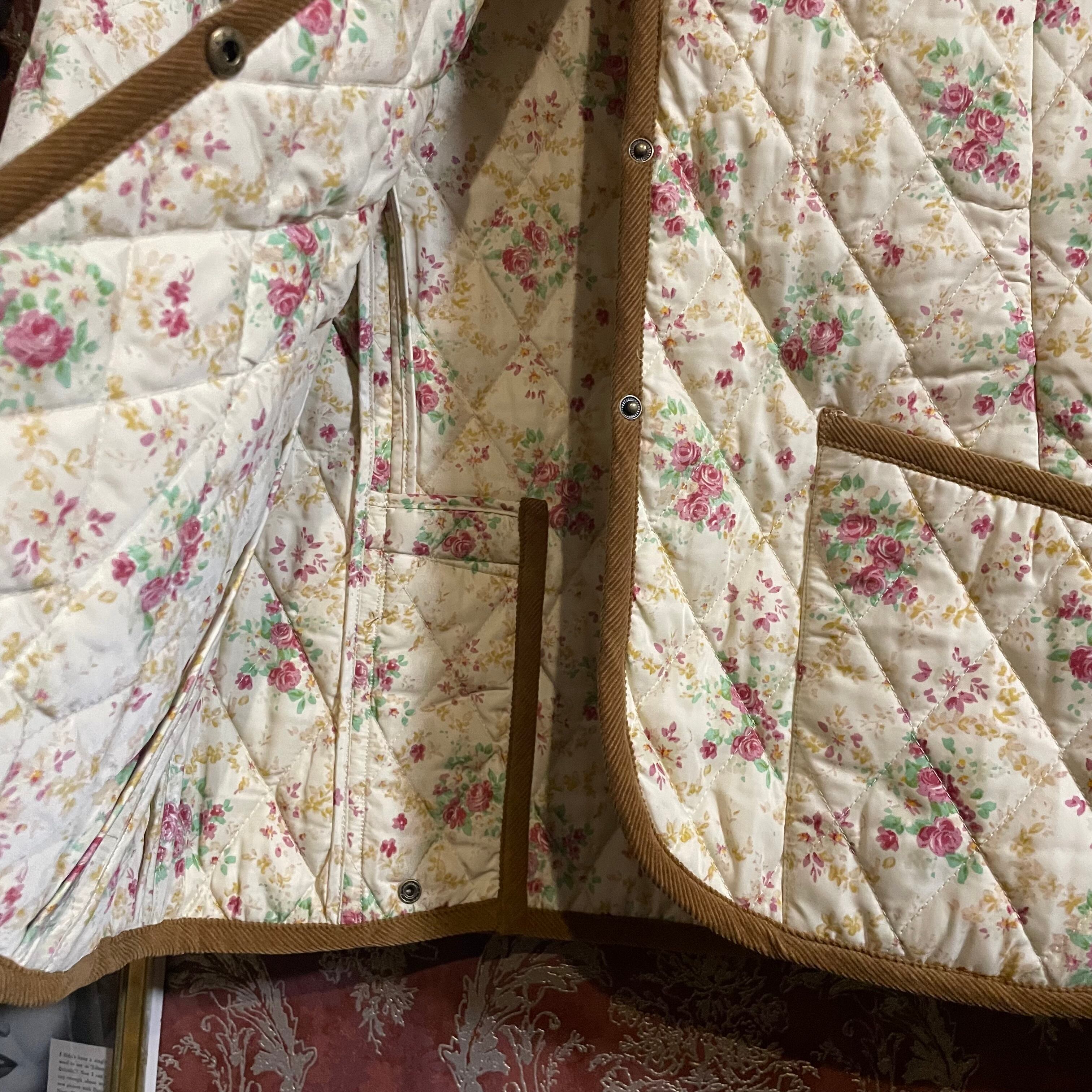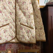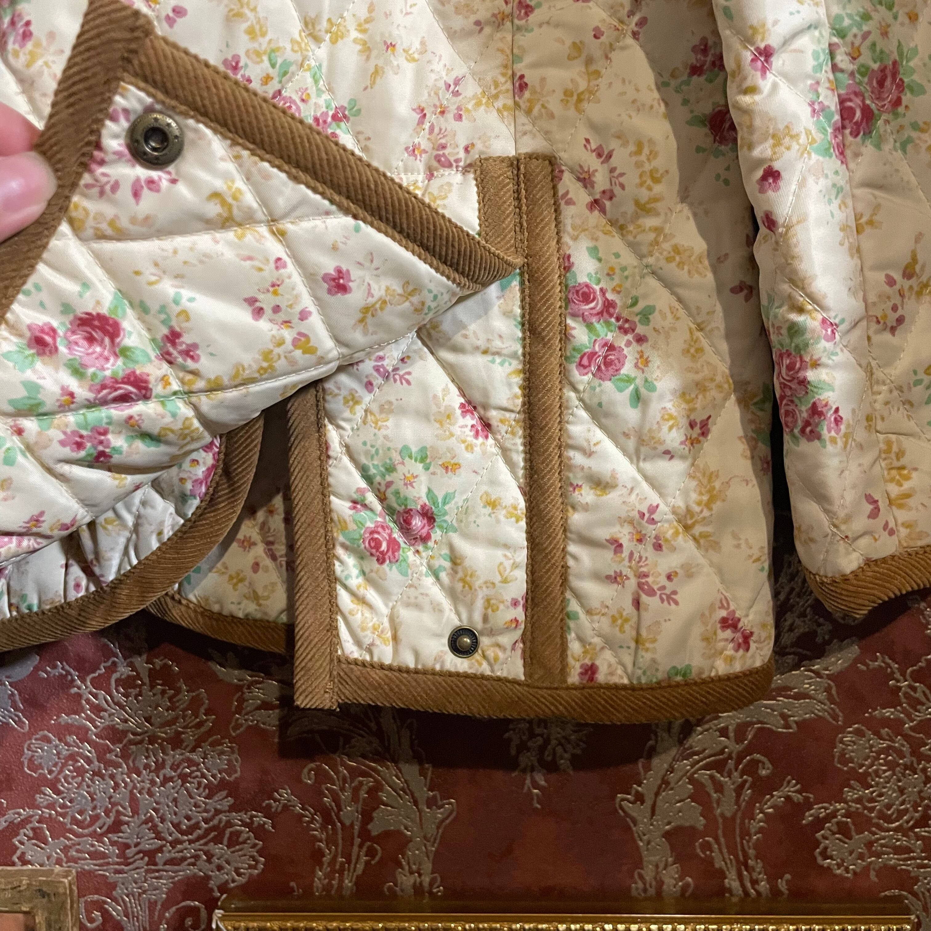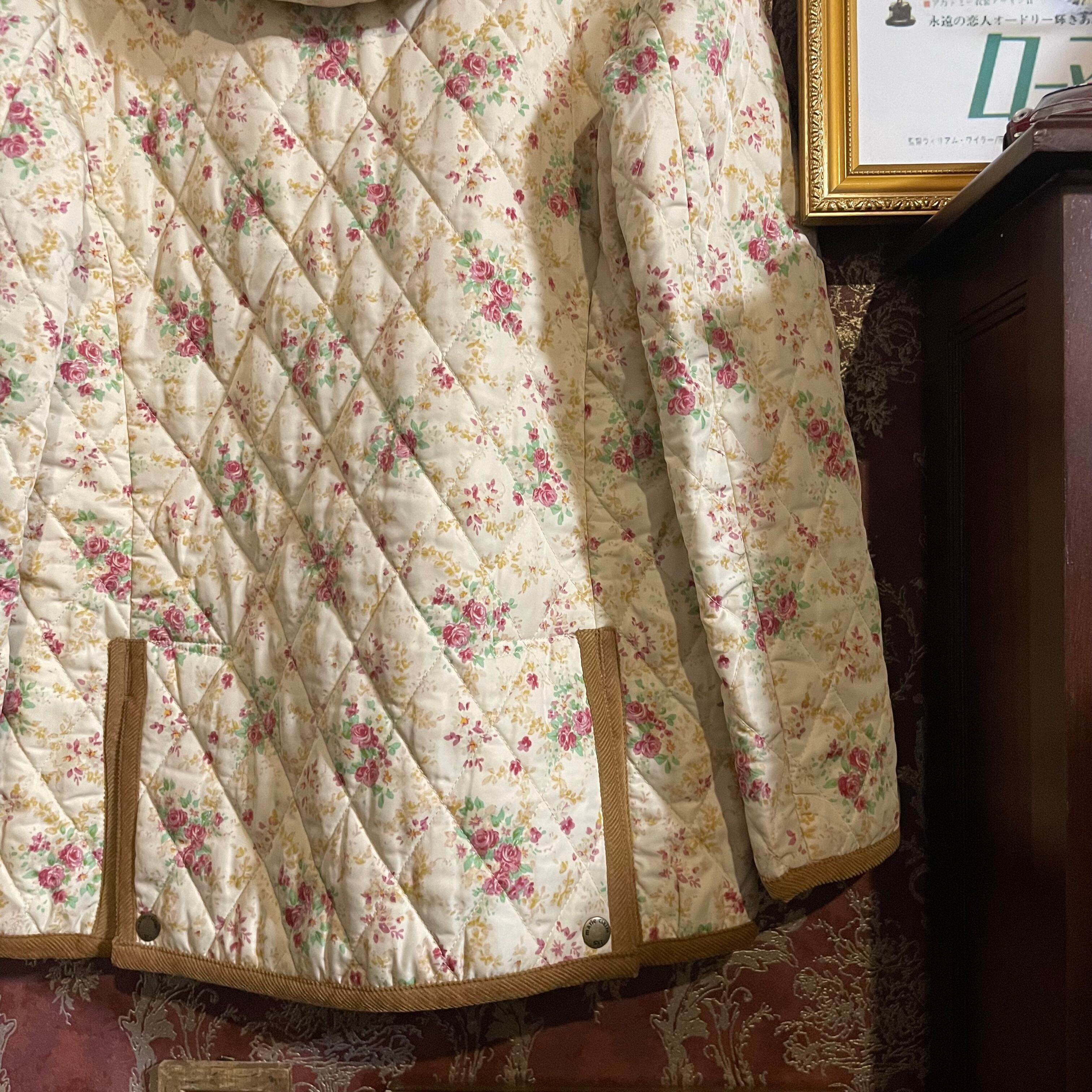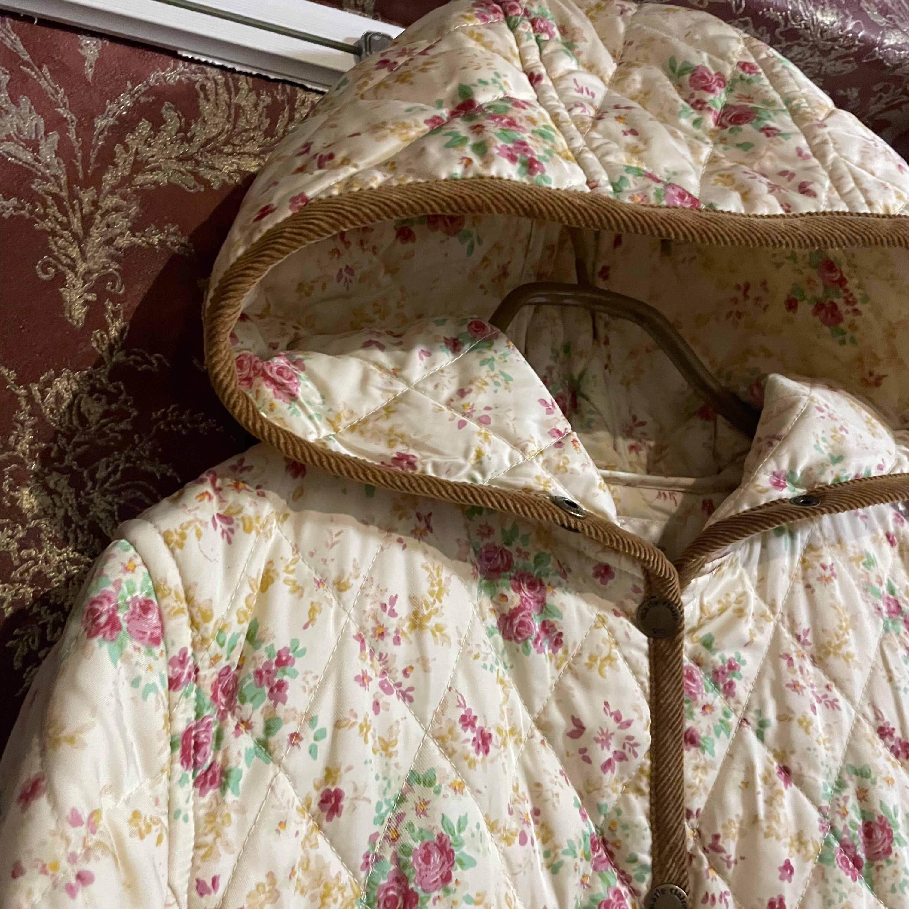 可愛らしい花柄のキルトが印象的で、フードも付いていて少女のようなあどけない可愛さを感じる一着です。