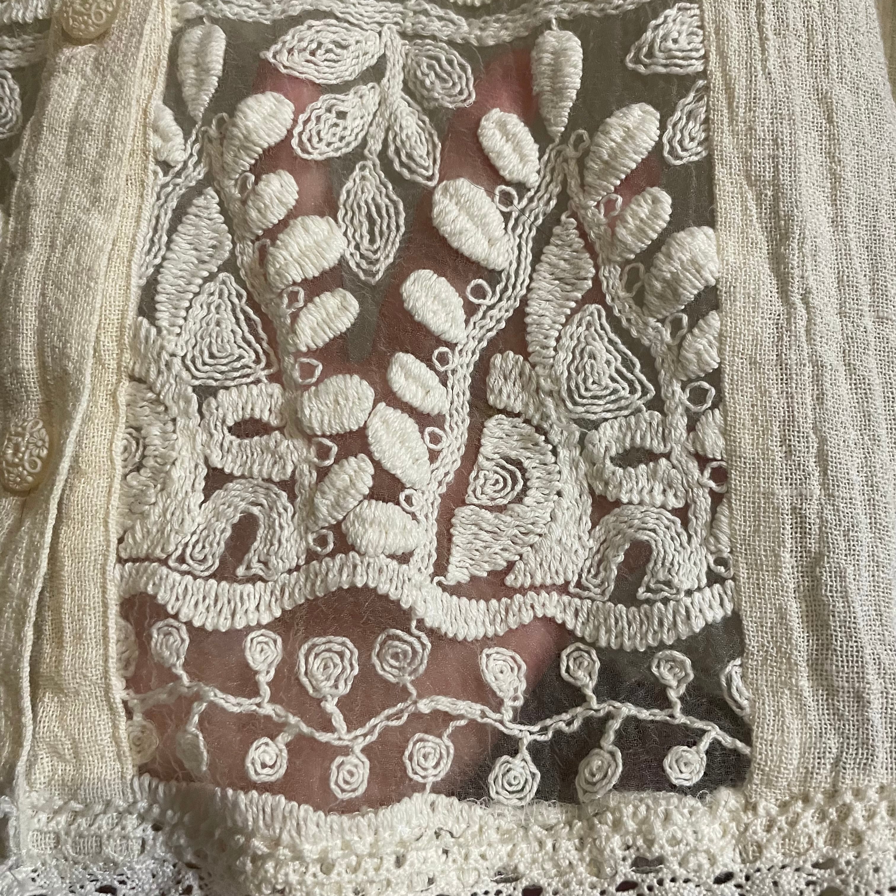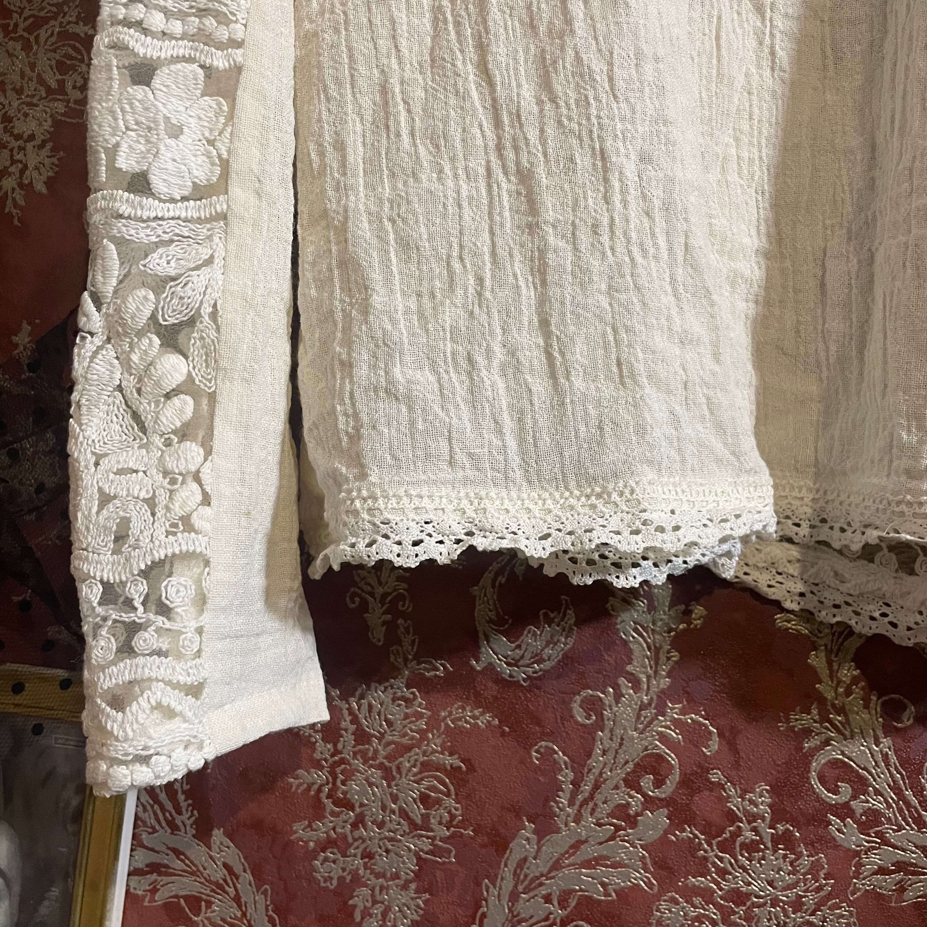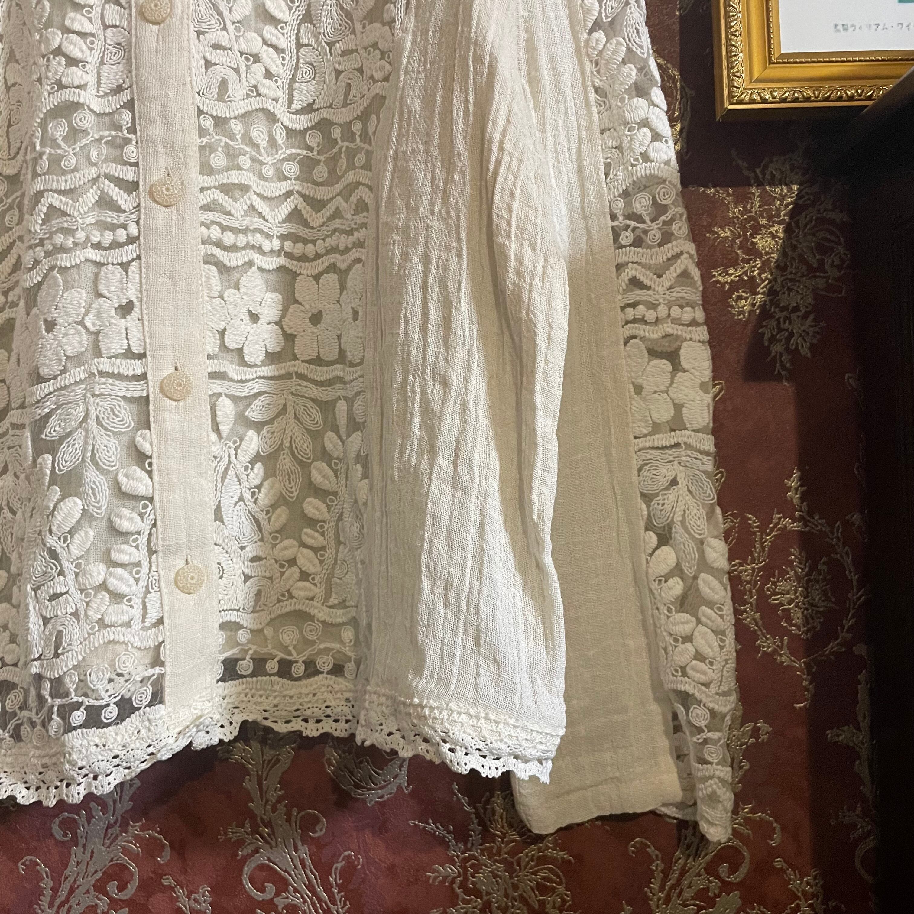 フロントと袖部分は透け感のあるレースで、襟には立体的な花モチーフが付けられています。