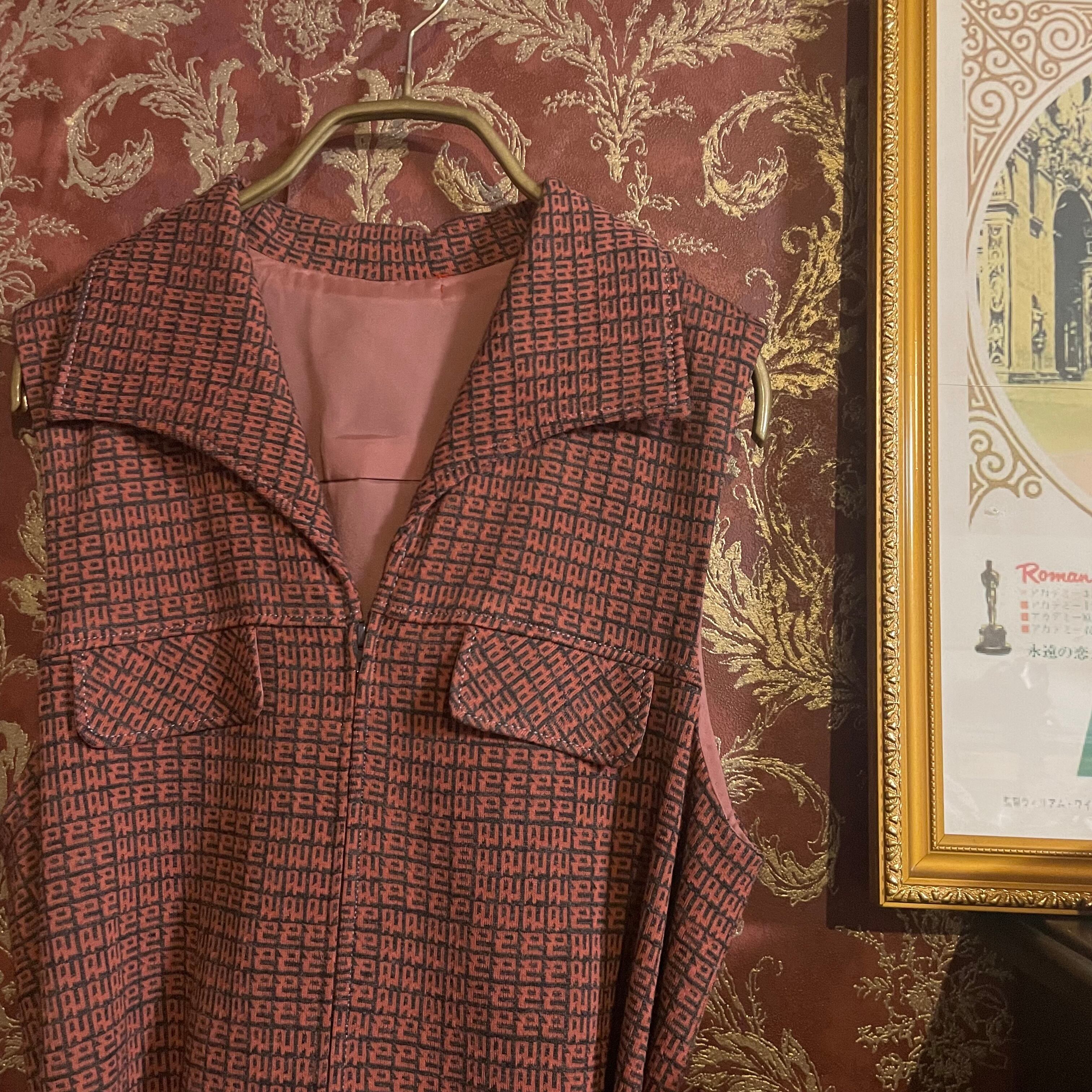 茶色みのピンクとグレーのレトロな柄のワンピースです。