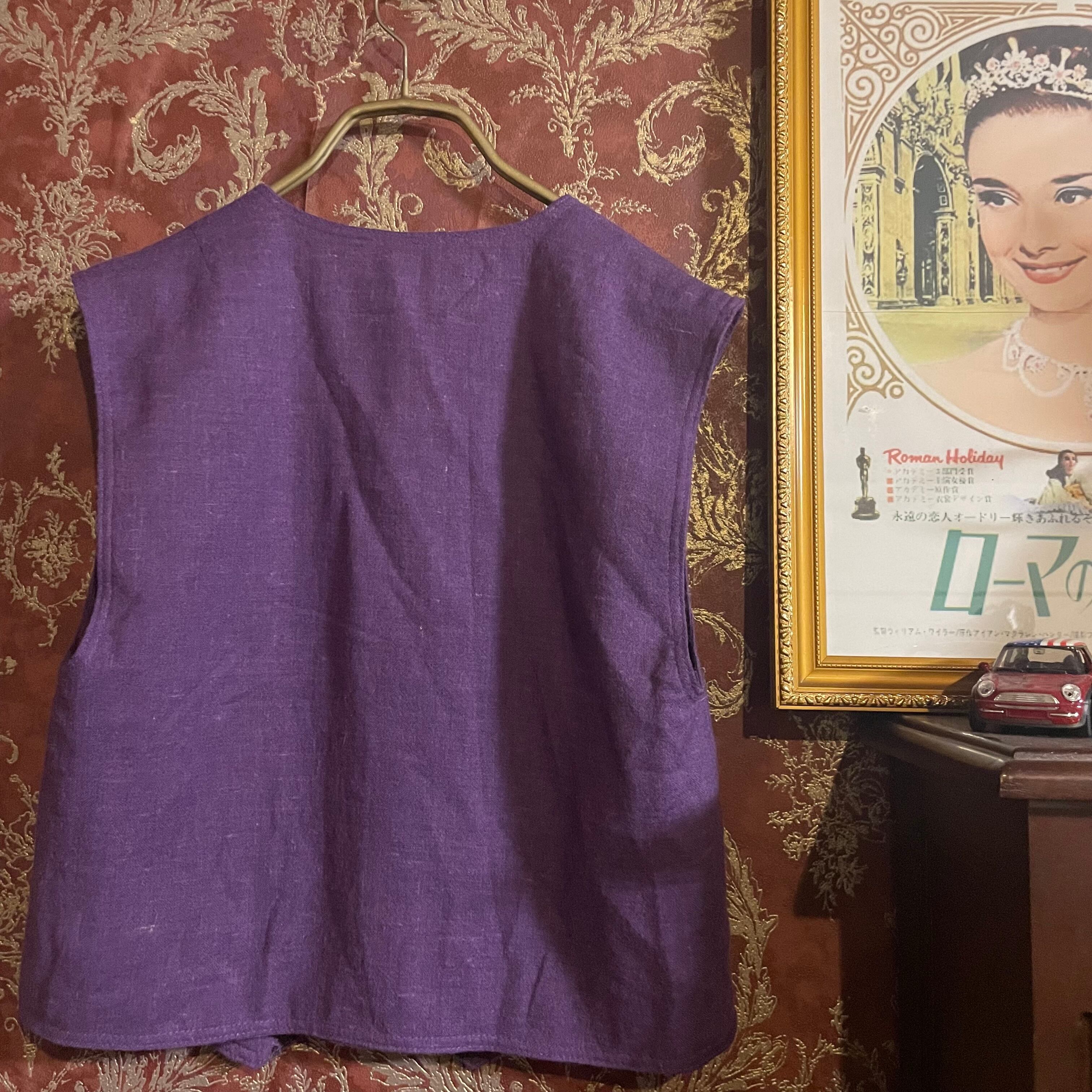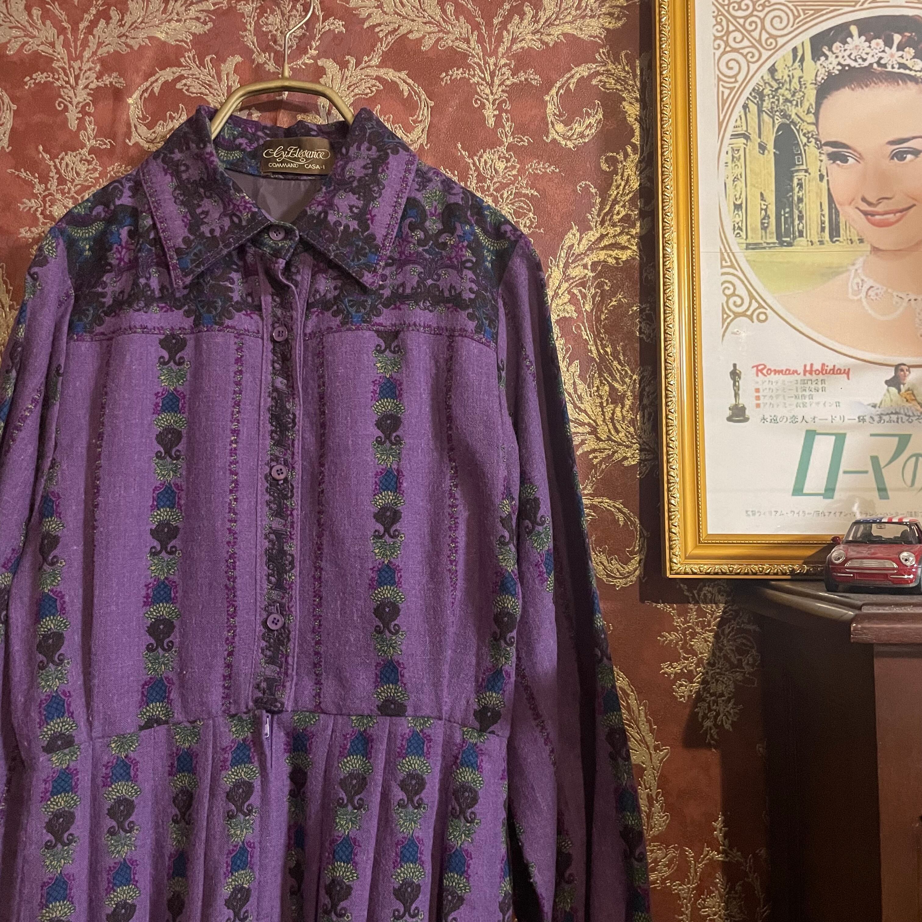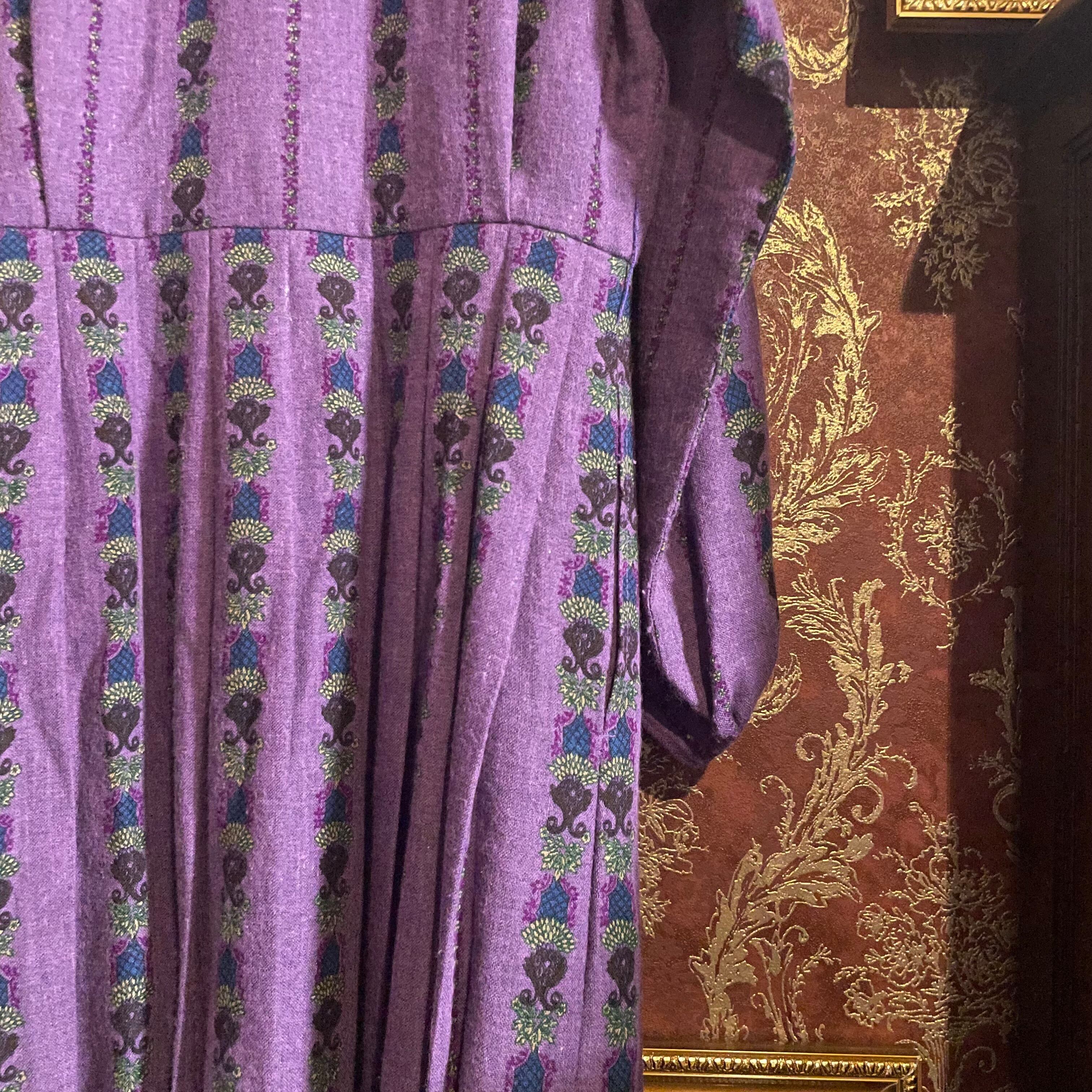 ストライプ状に柄が配置された紫のベストとワンピースのアンサンブルです。