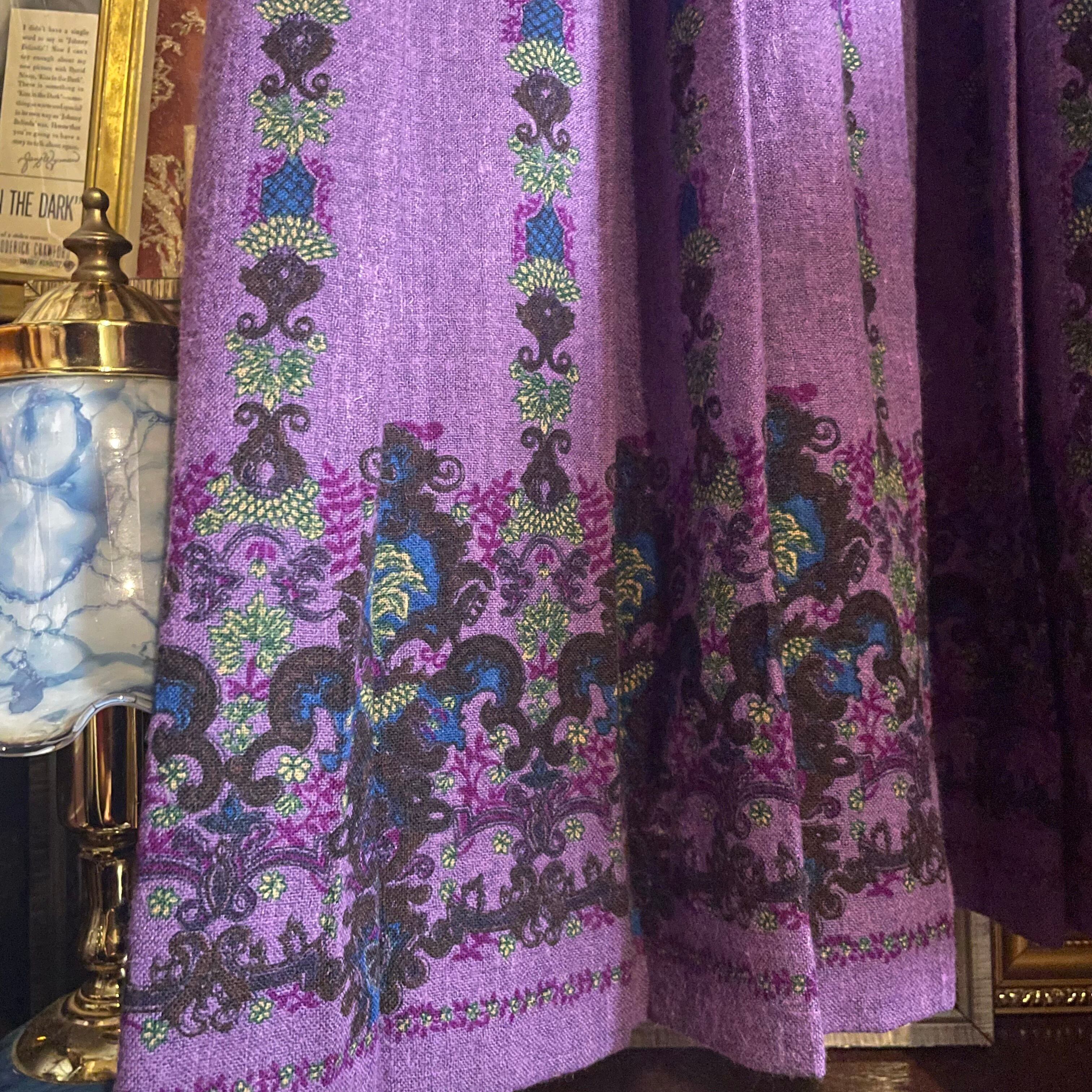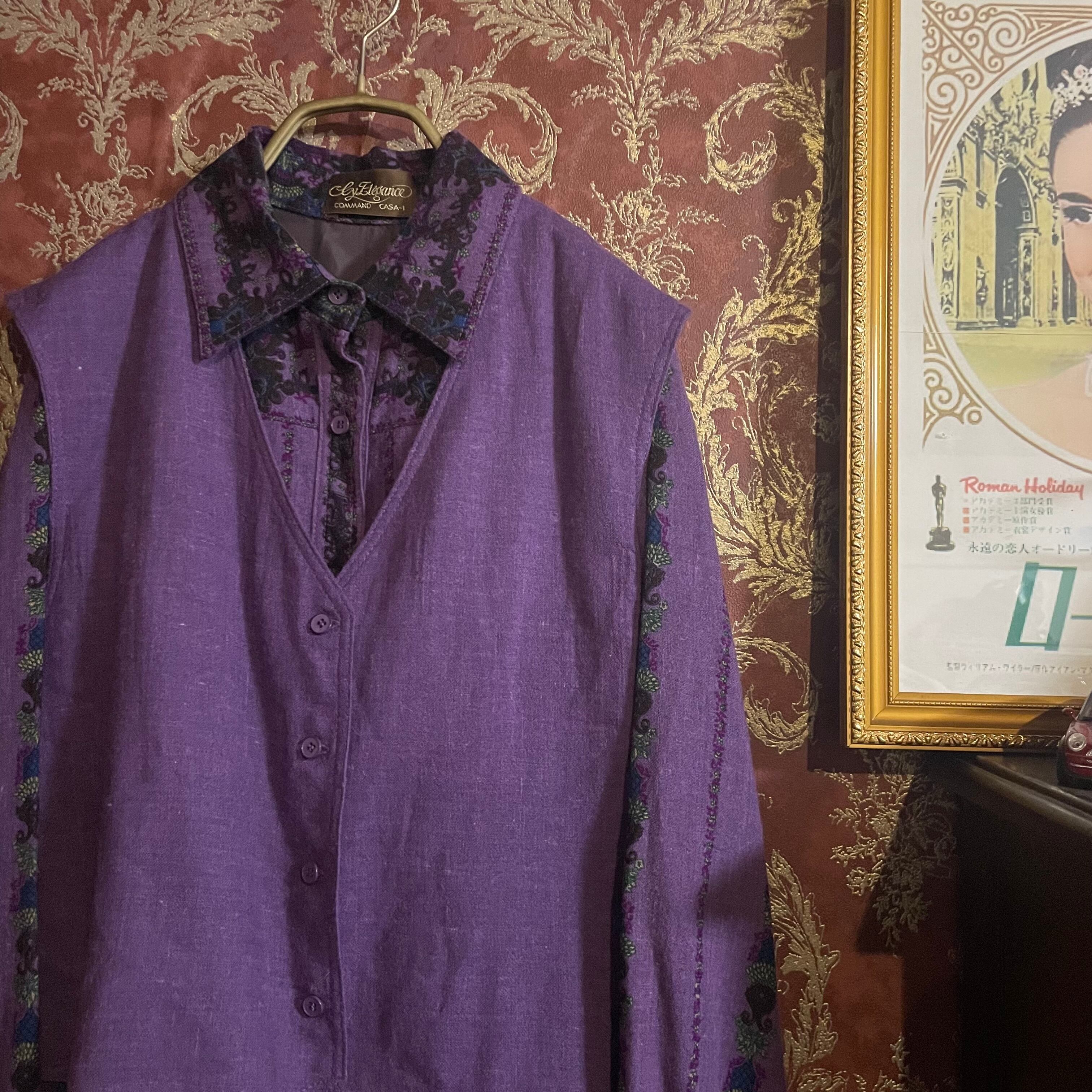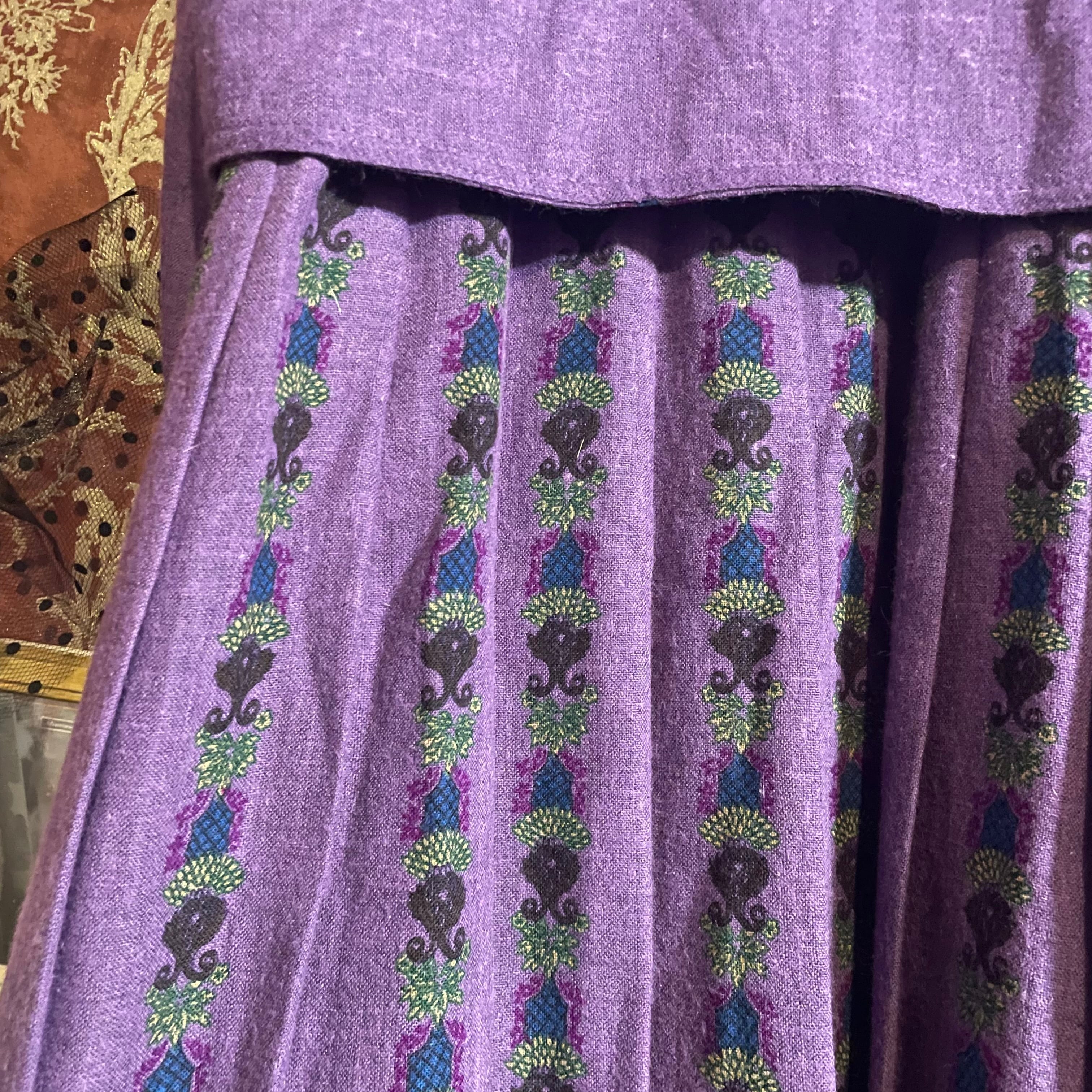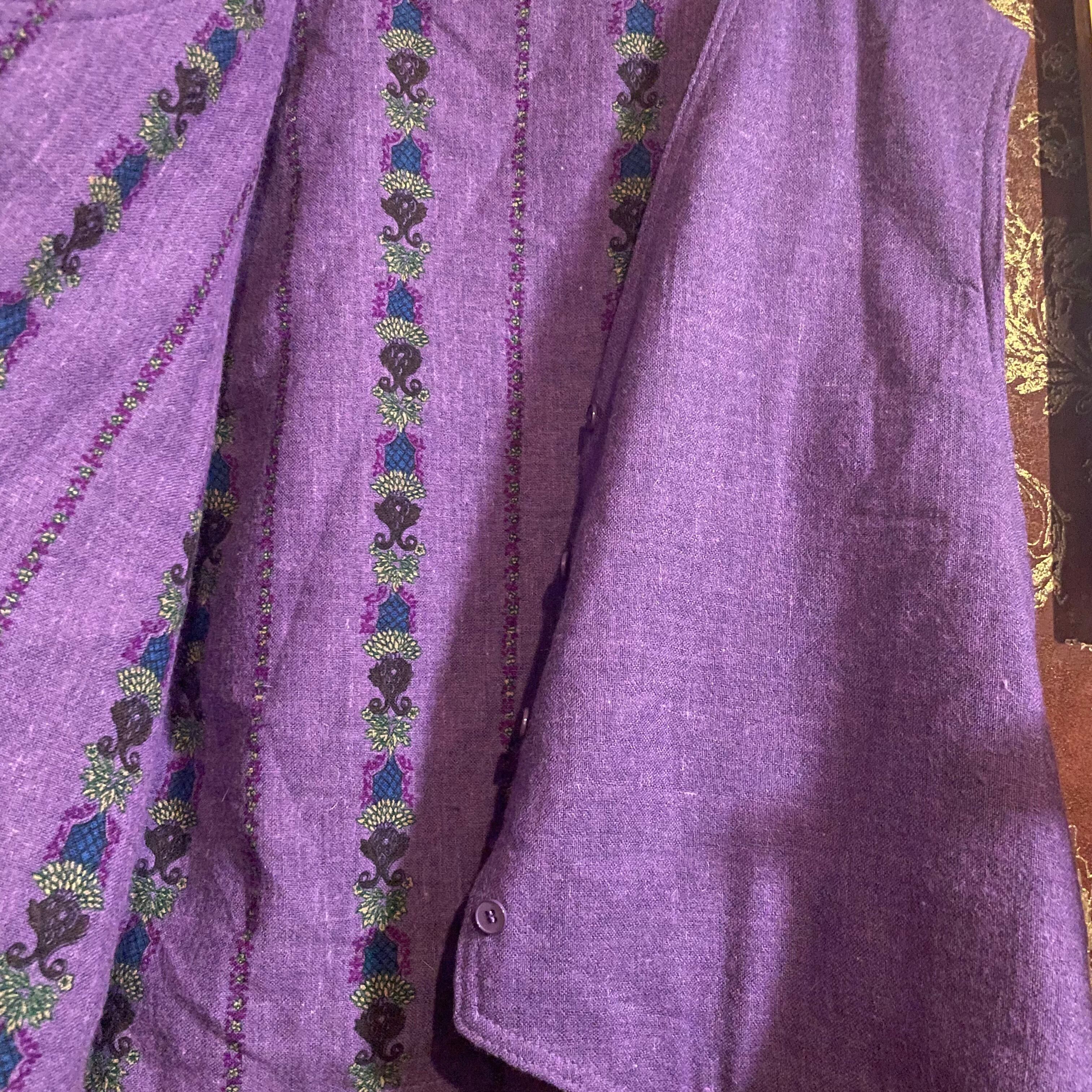 ストライプ状に柄が配置された紫のベストとワンピースのアンサンブルです。