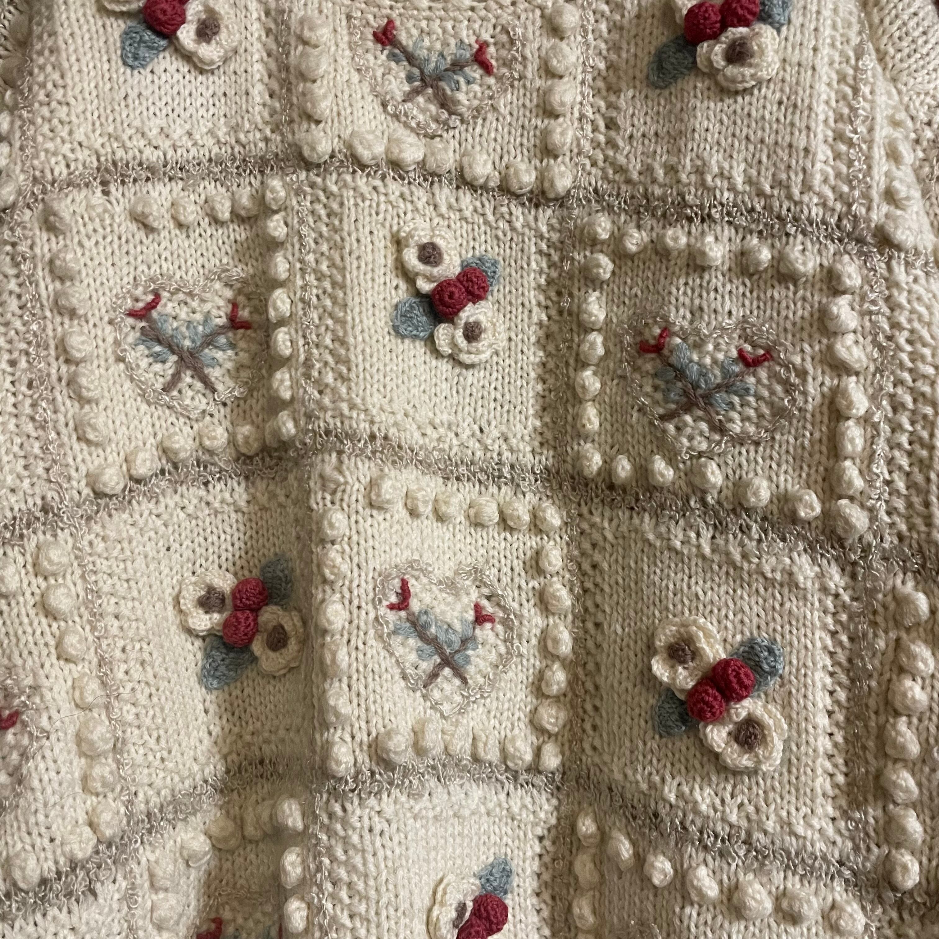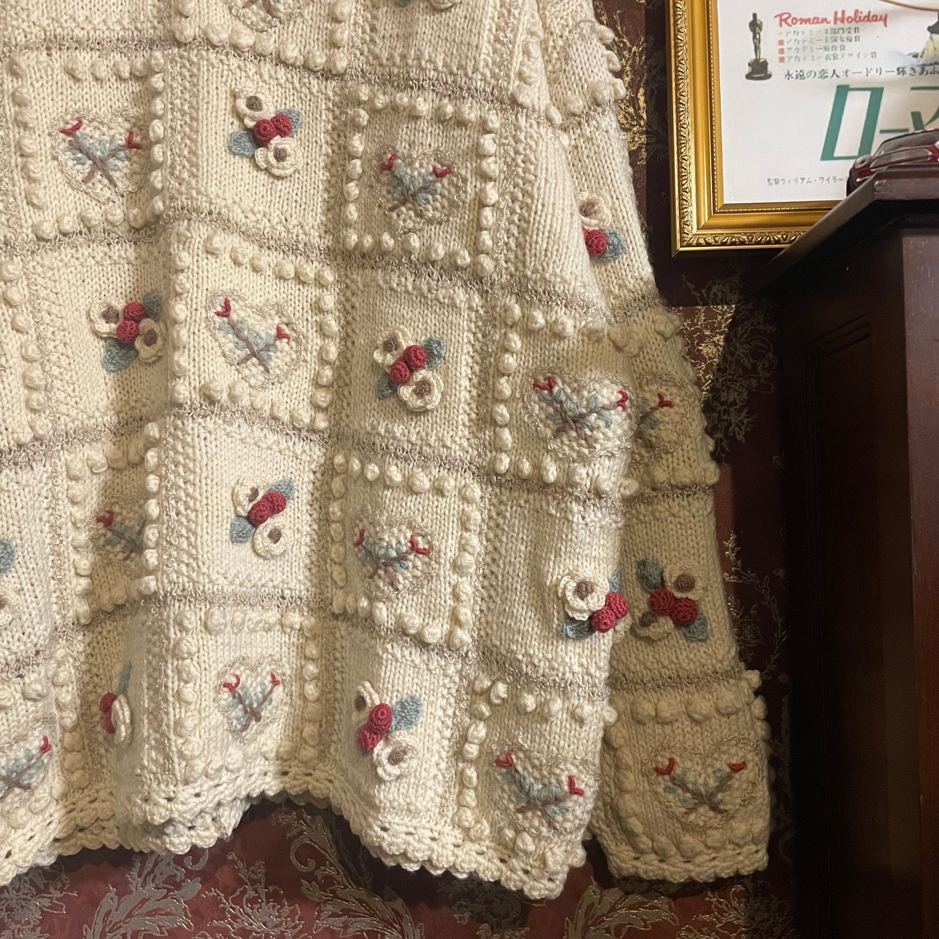 パプコーン編みの他に、立体的な花や赤い実のモチーフ、毛糸の刺繍などどこを見てもとてもガーリーなデザインです。