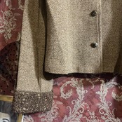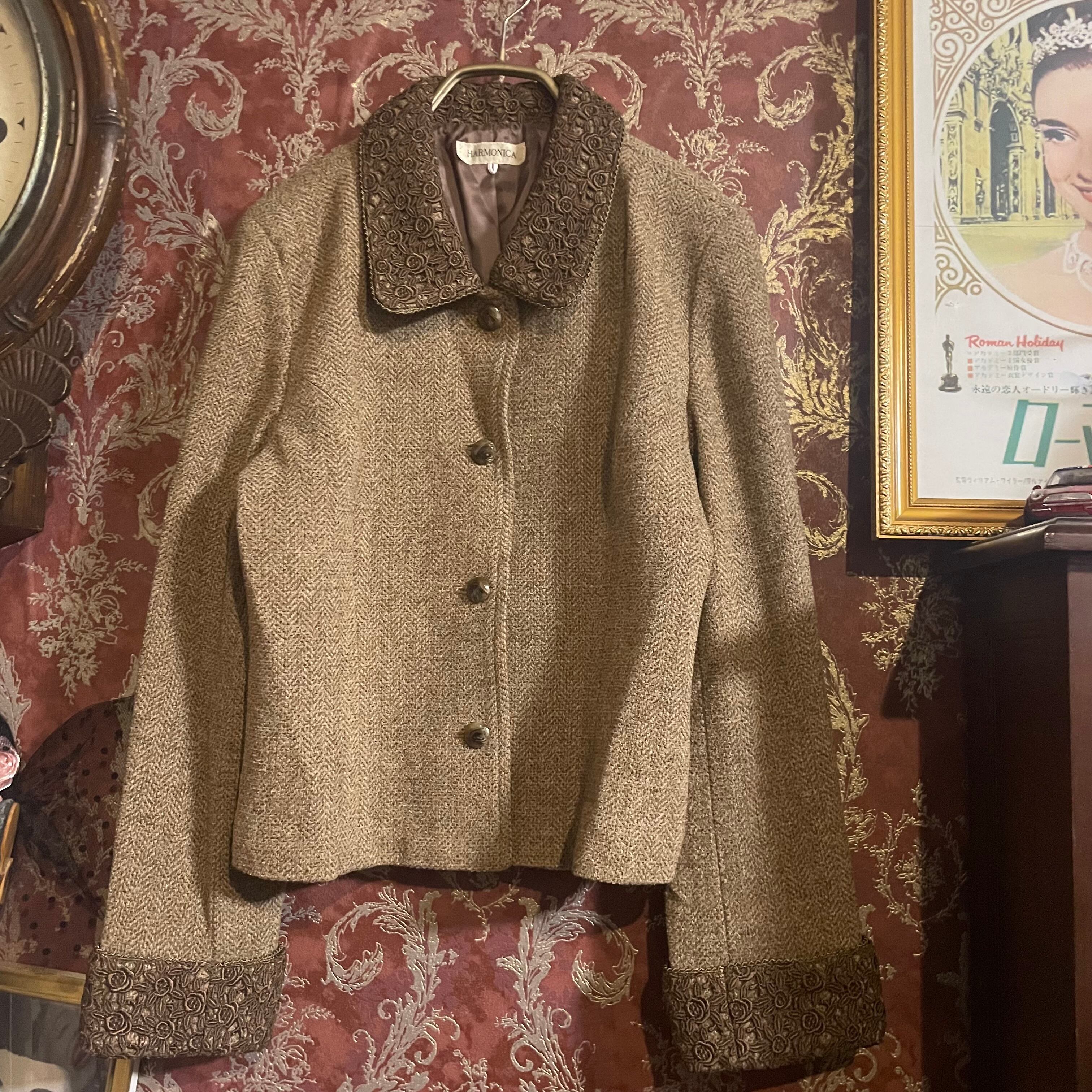 ジャケットは襟とカフスが厚手のバラ柄レースで、うるうるとしたボタンがついています。