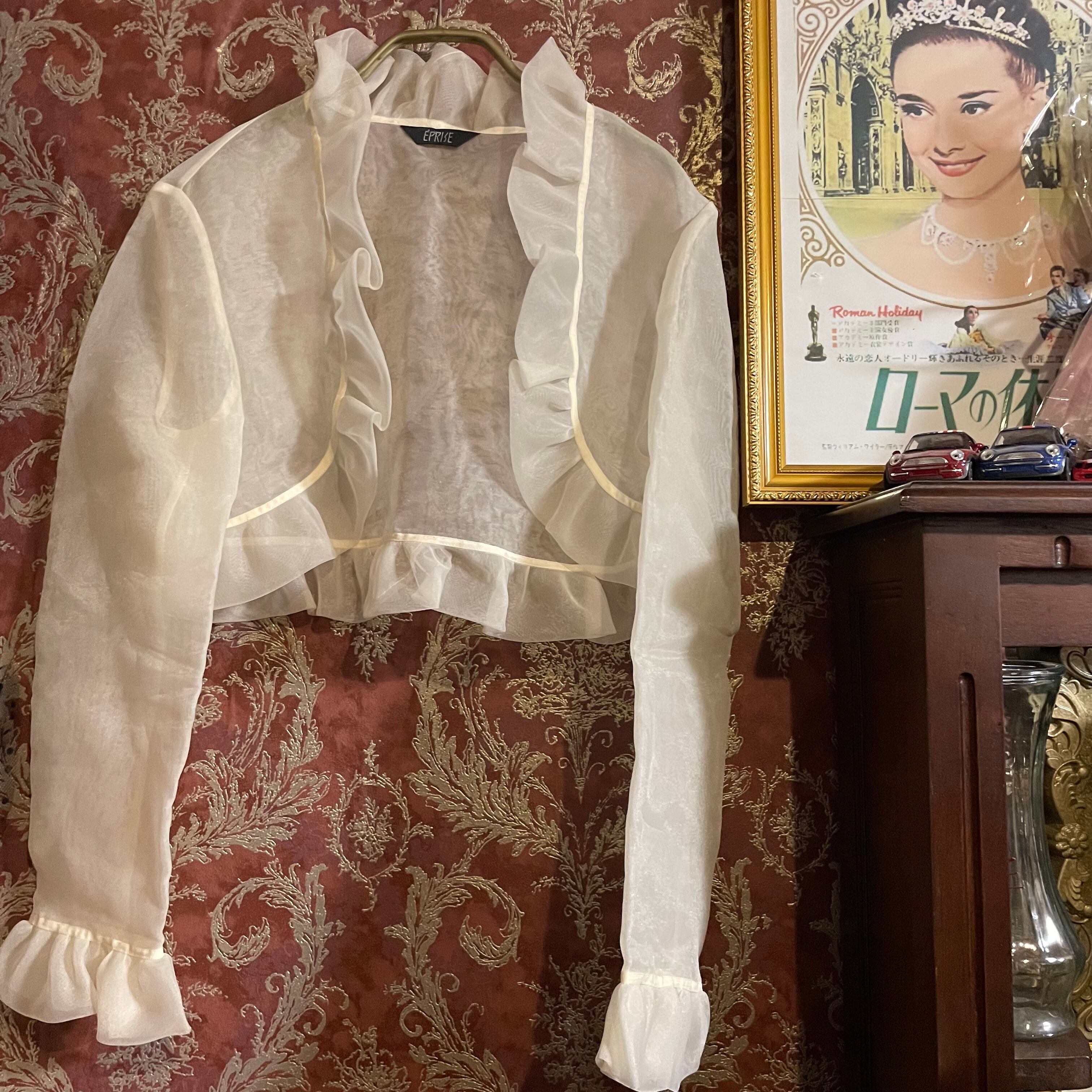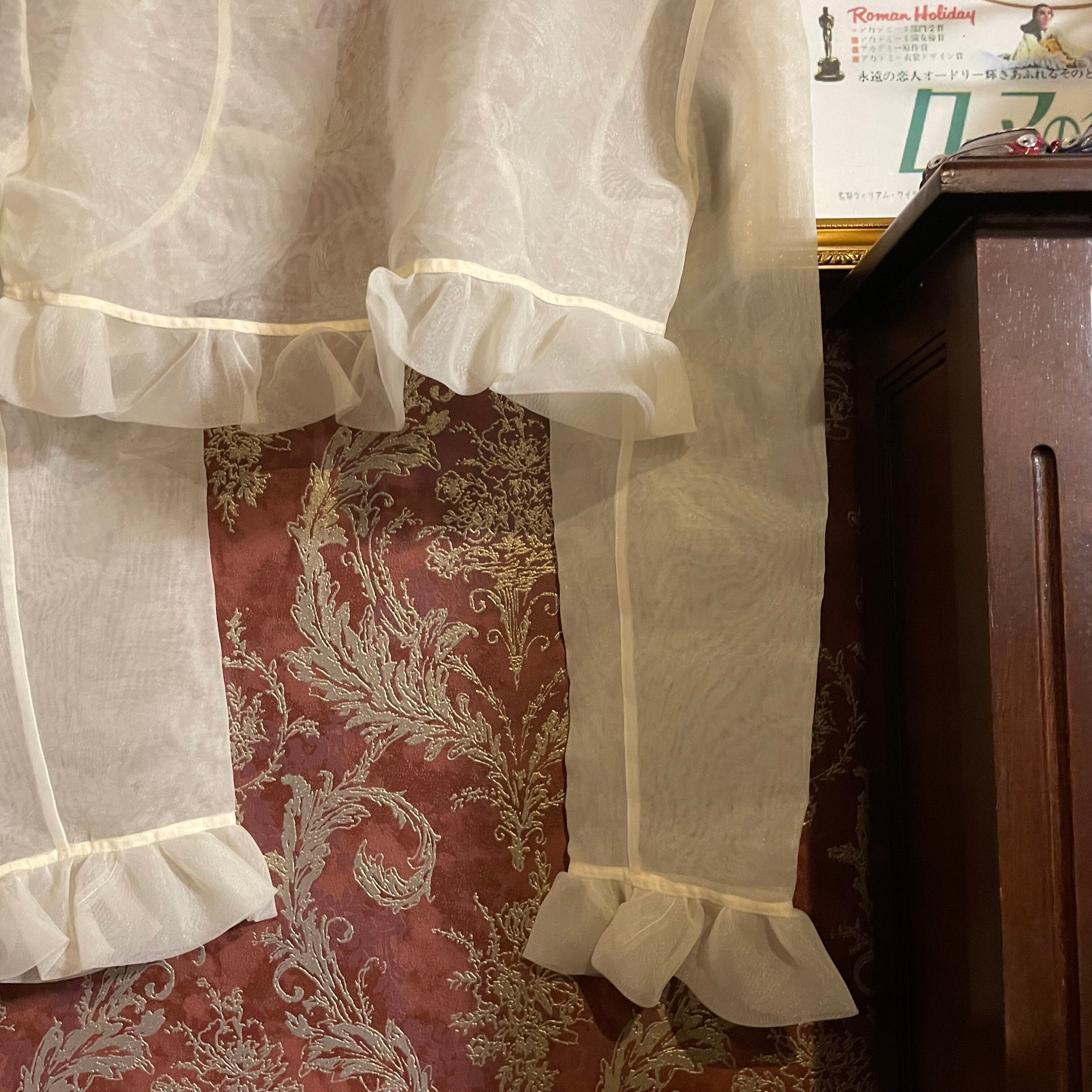 キメの細かいオーガンジーが2枚重ねで使われていて襟ぐりから前立て、裾、袖口にフリルがついています。