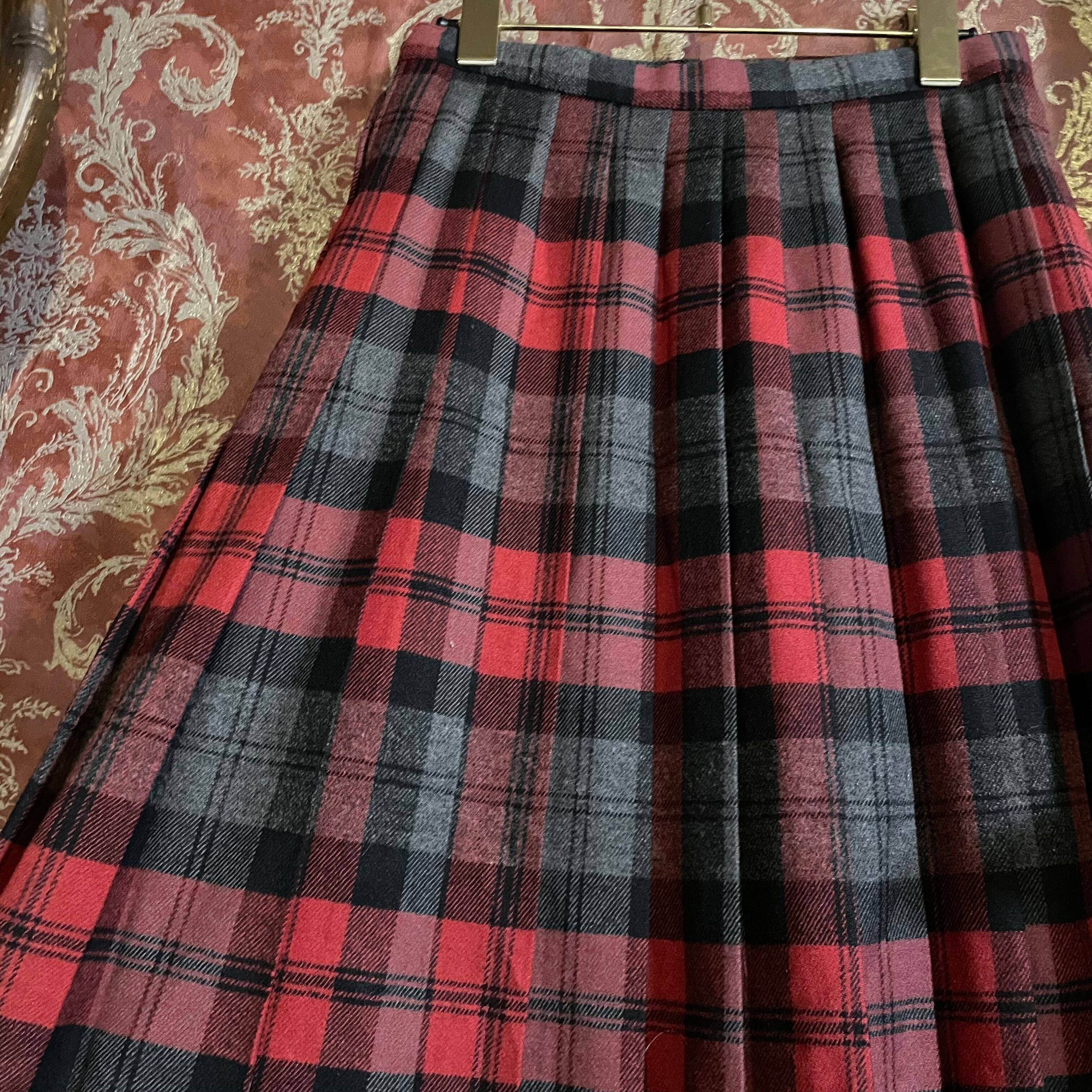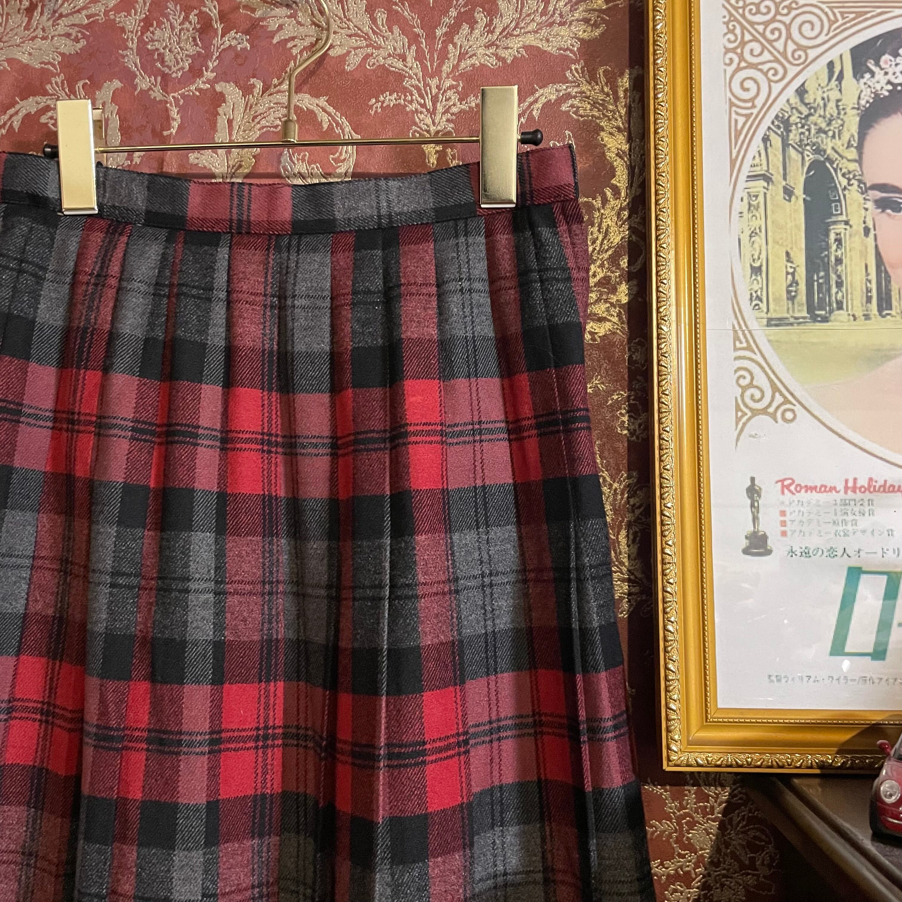 全体がプリーツの可愛らしいスカートで、膝下の丈感が清楚でレトロな雰囲気です。
