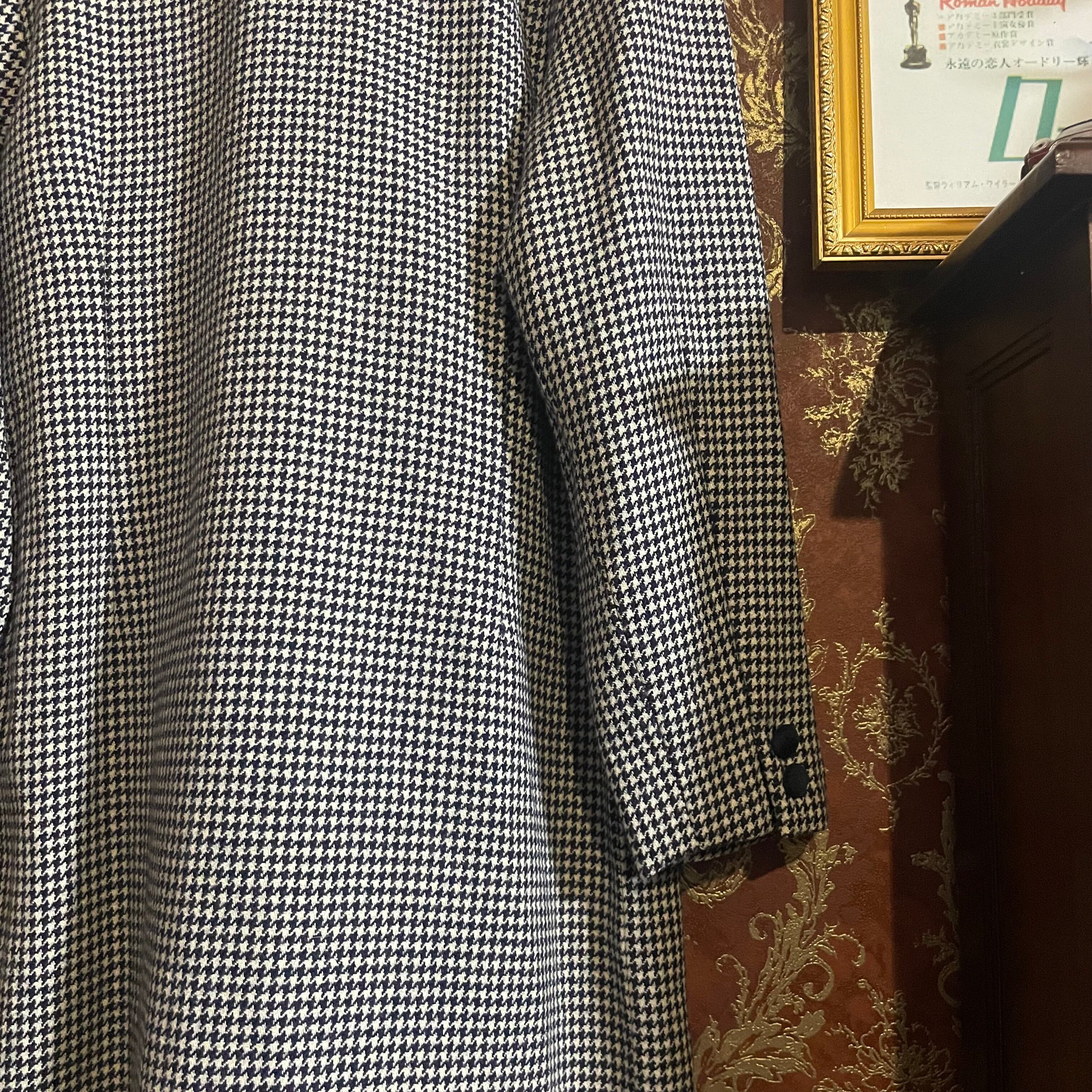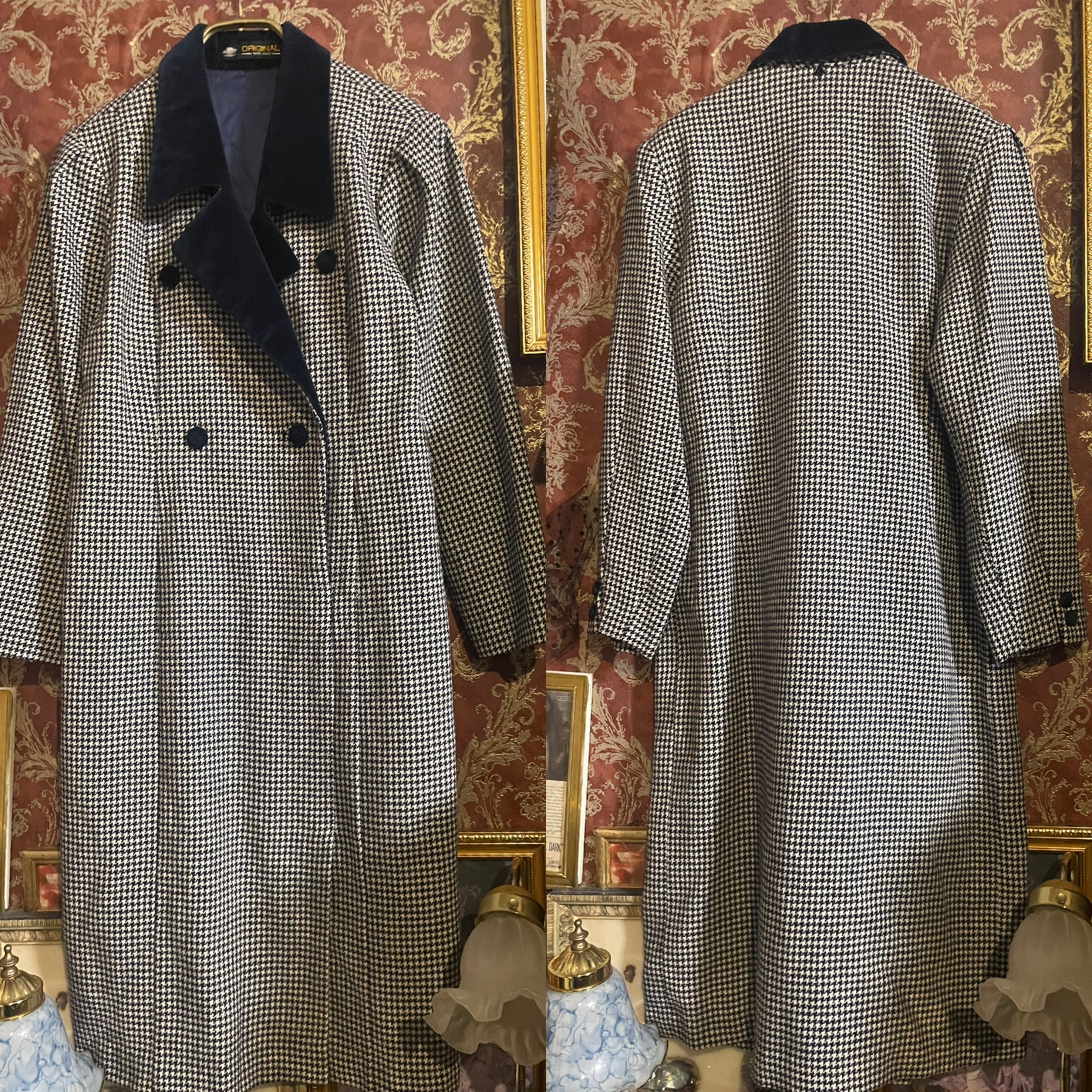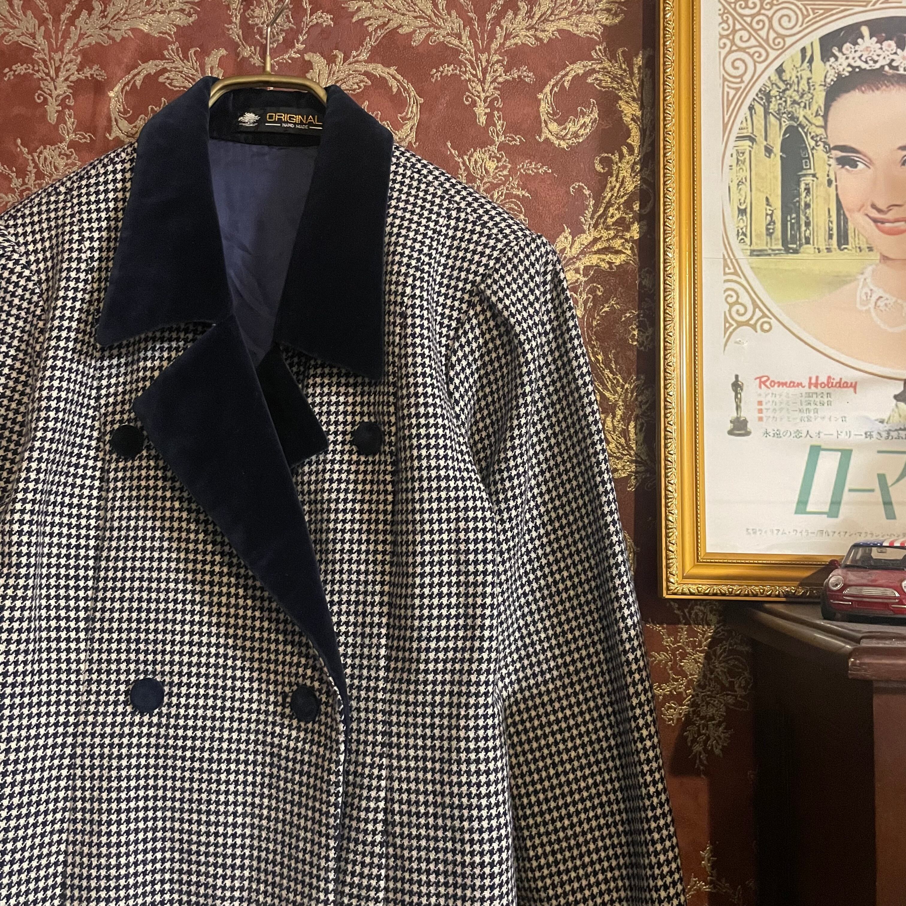 クラシカルな襟は紺のベルベットで、全体はダブルボタン風のデザインです。