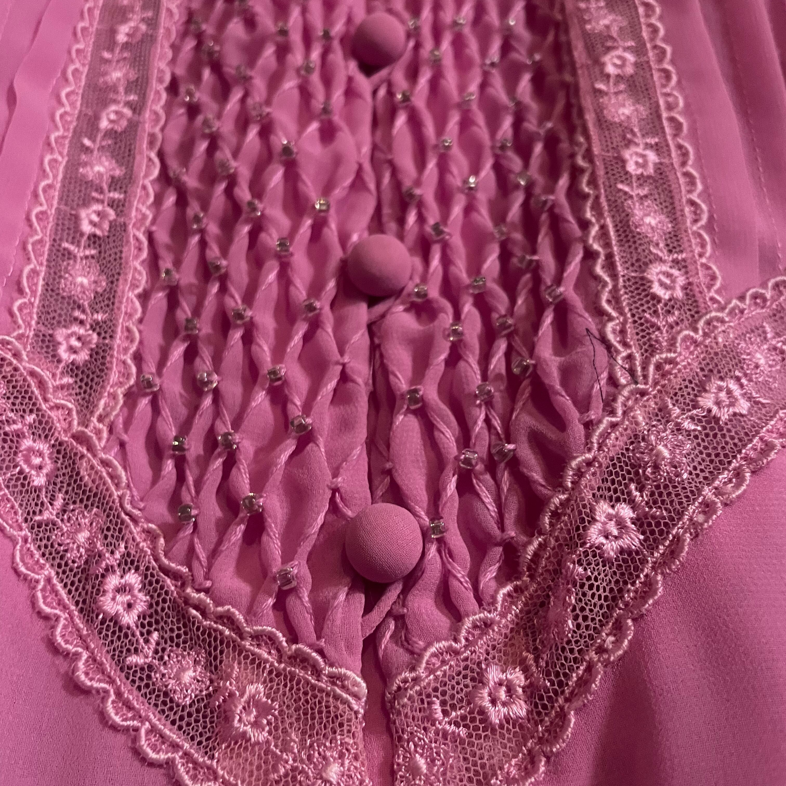 襟にはフリル、フロントはピンタック、レース、スモッキングとビーズで装飾されたとても豪華な一着です。