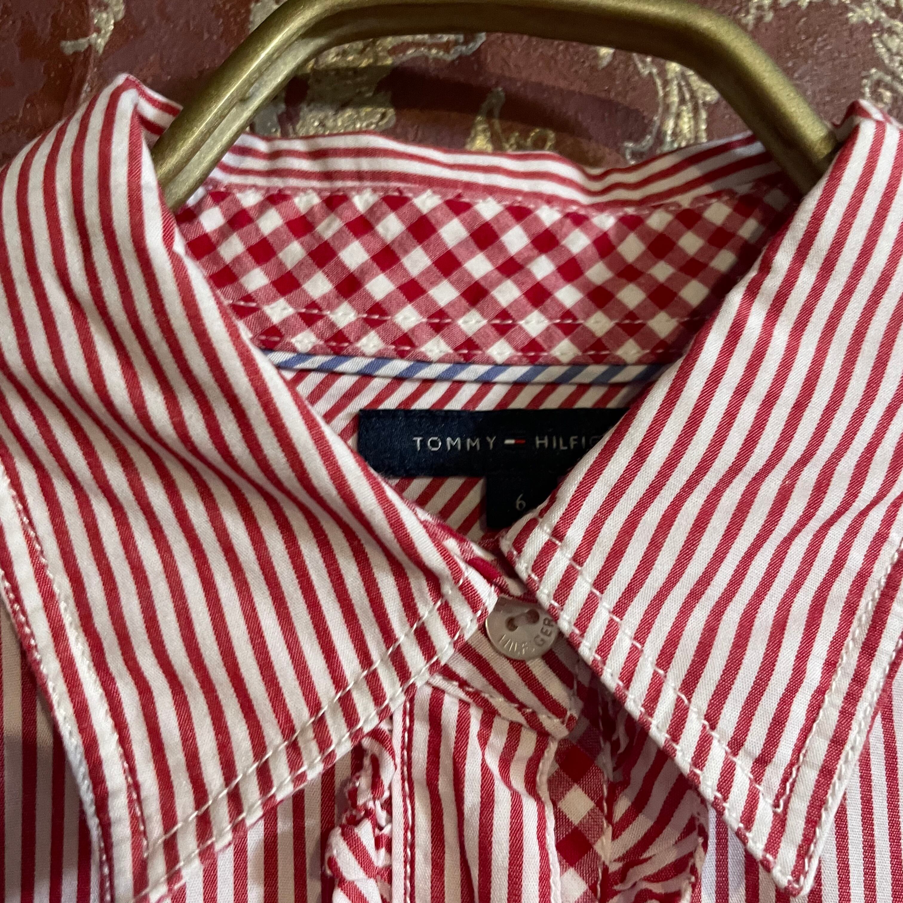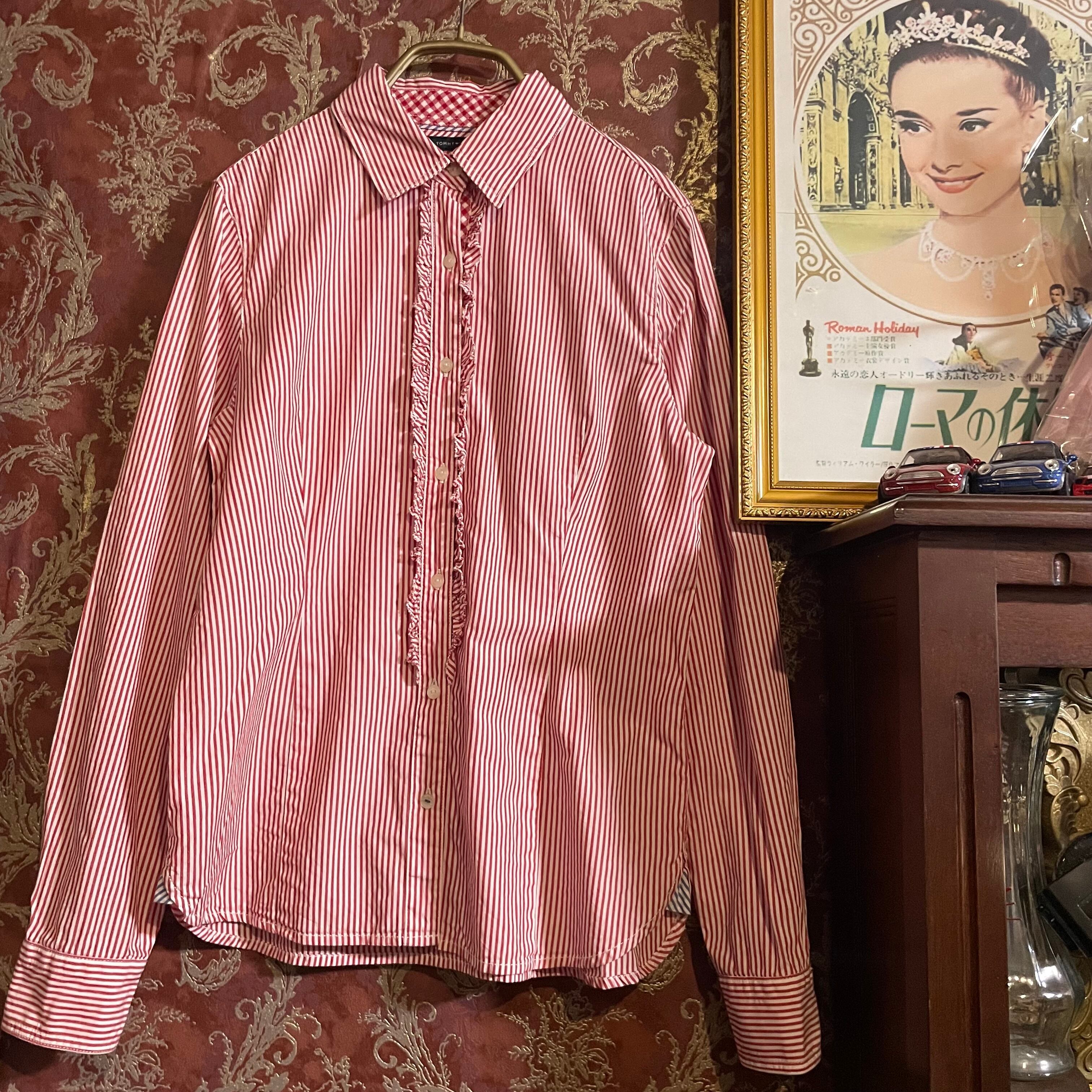 赤と白のボーダーで前立てには共布のフリルが付いています。