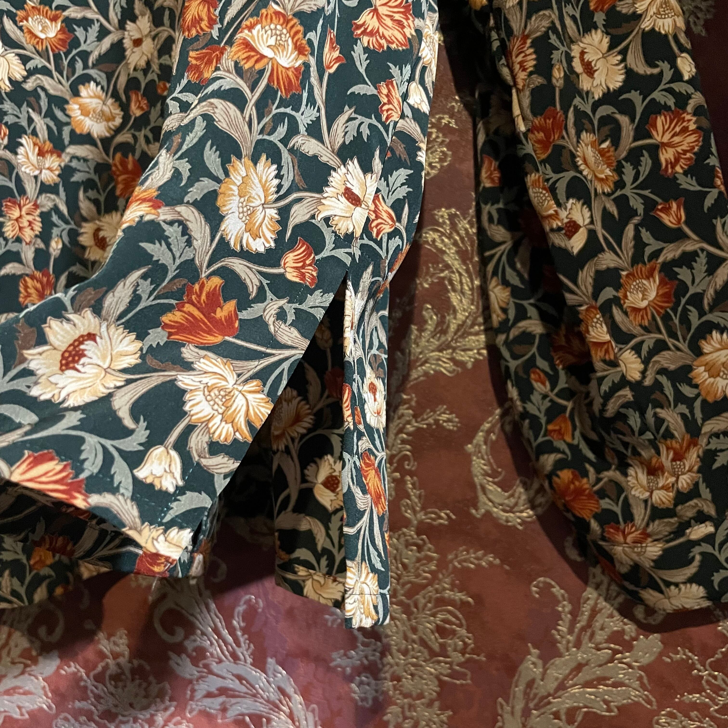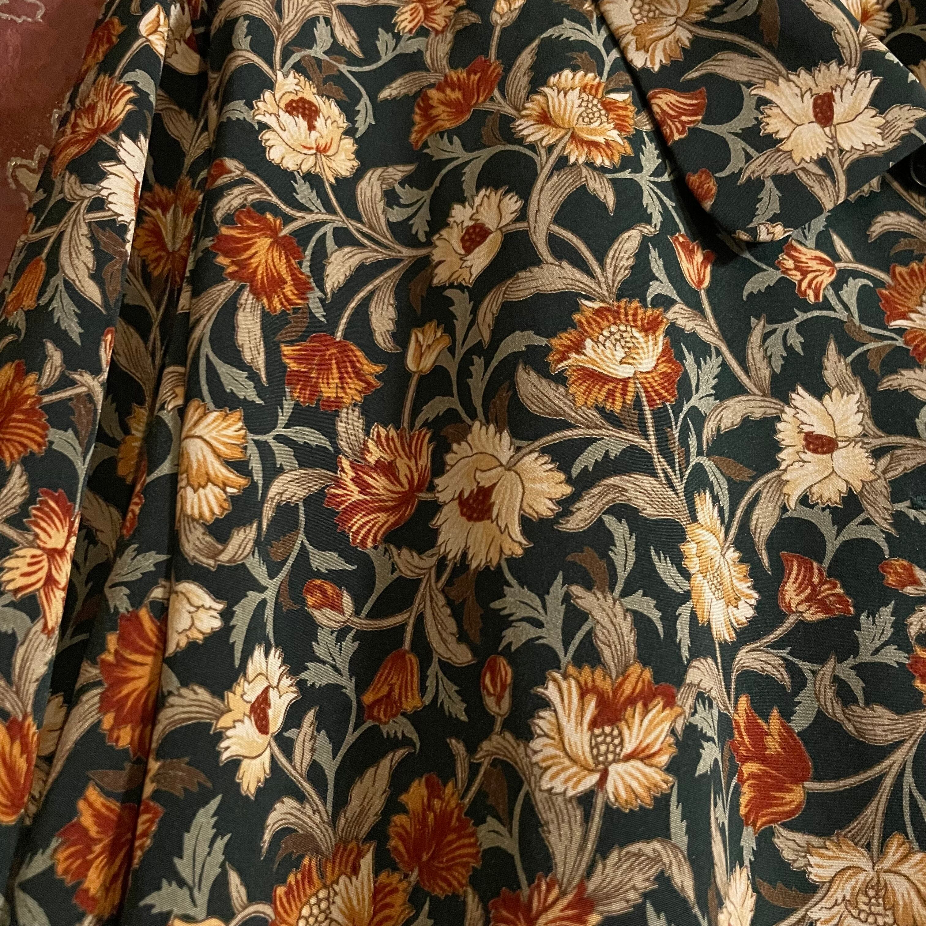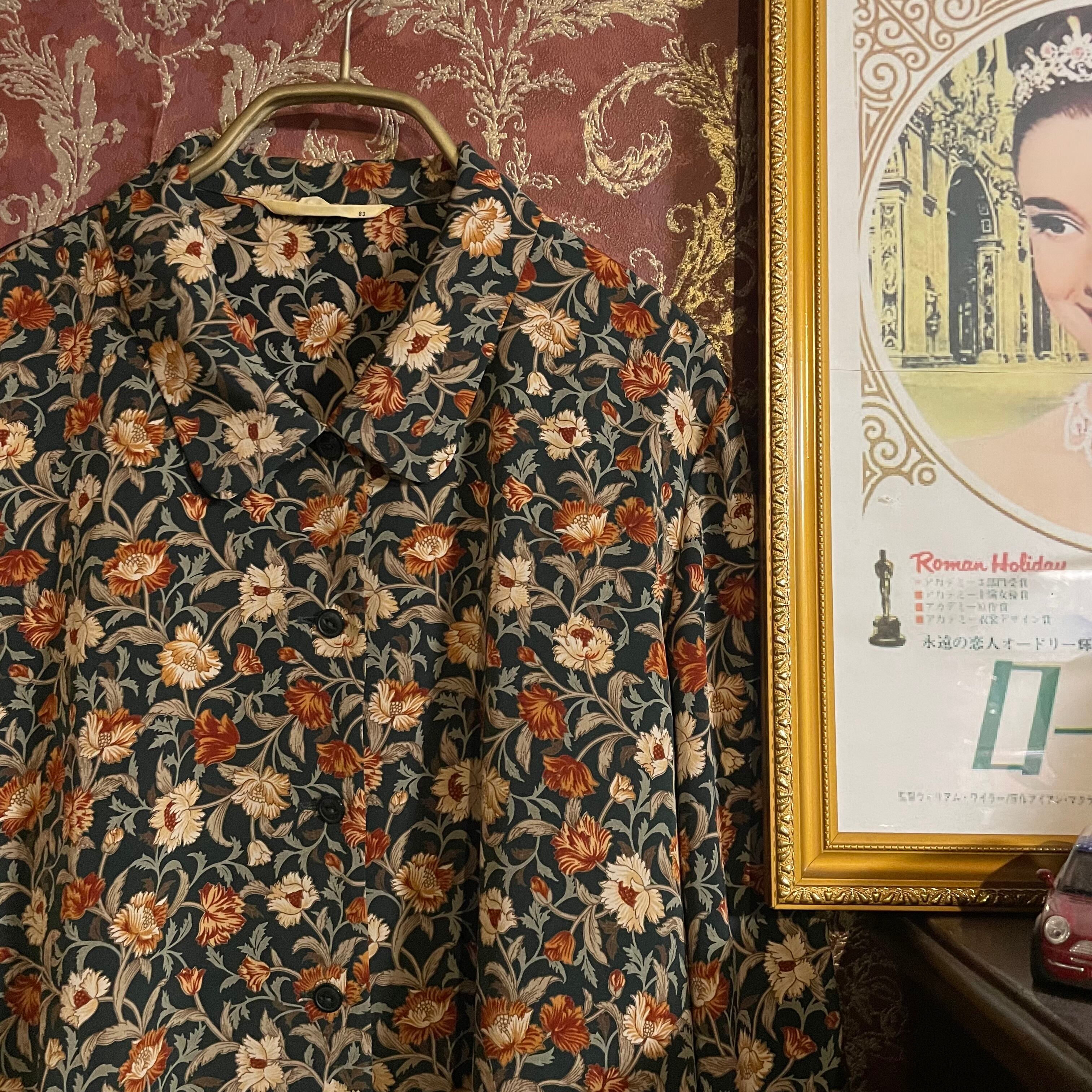 モスグリーンをベースに茶オレンジの花柄ブラウスです。