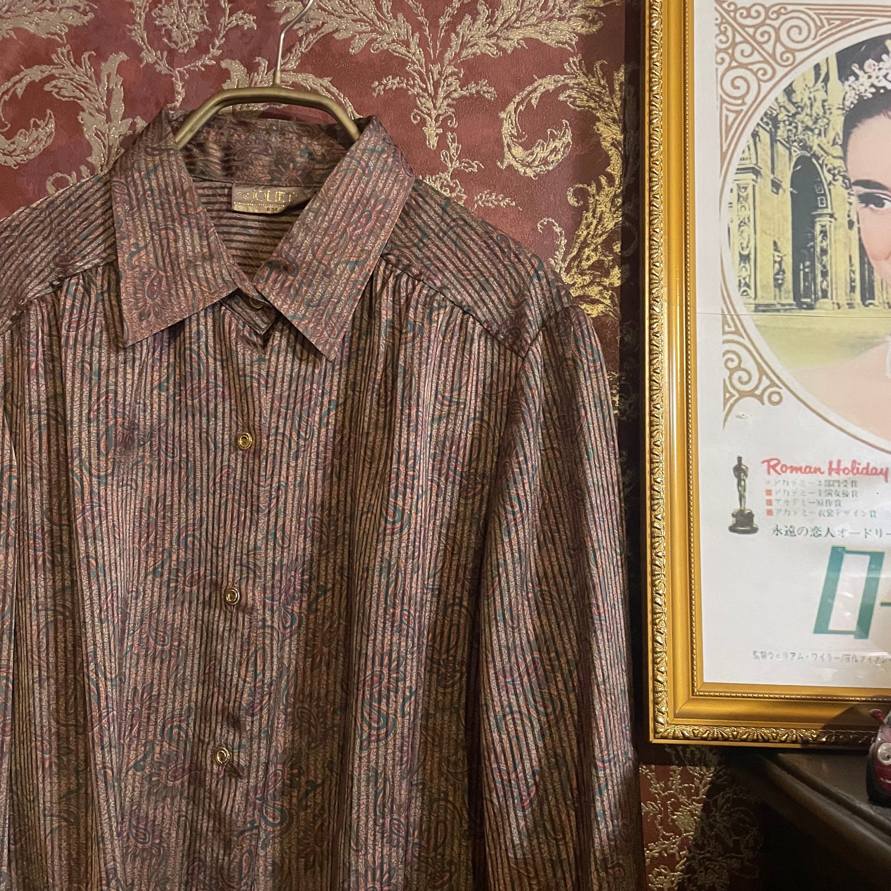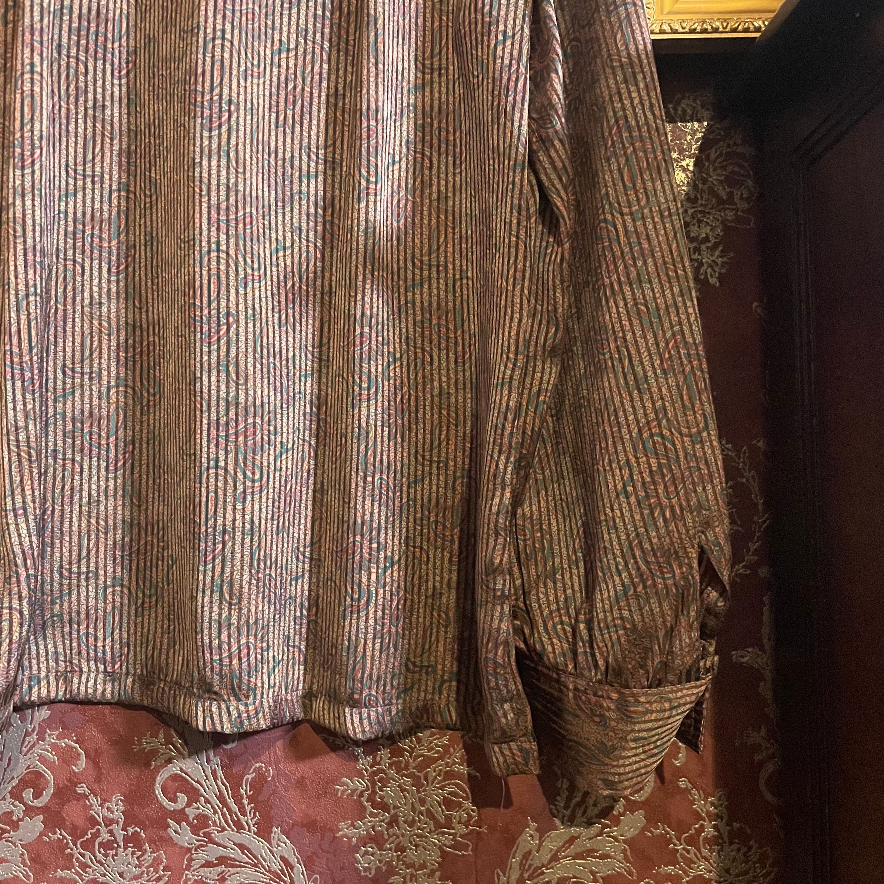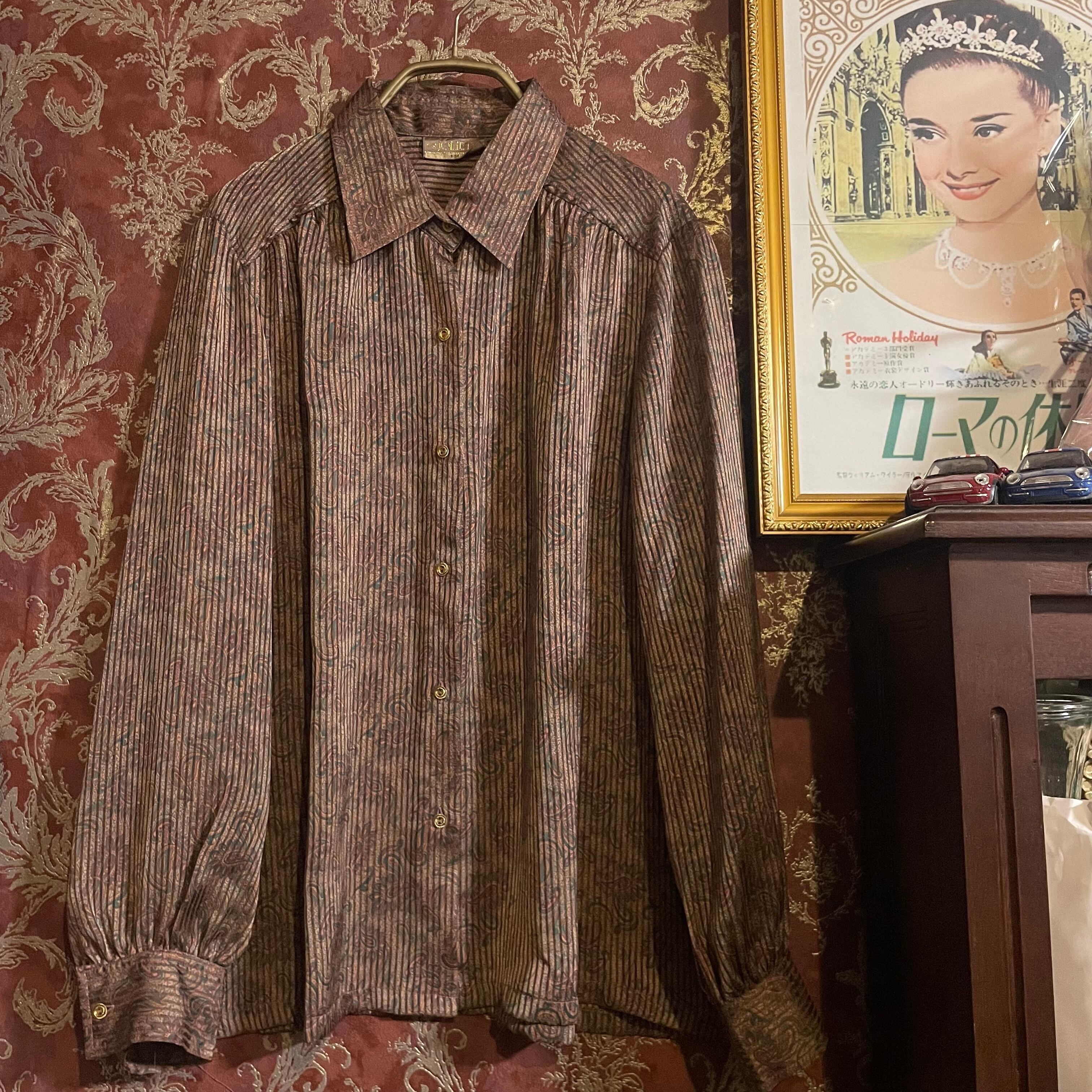 ストライプ柄のジャカード生地をベースに、サイケデリックなペイズリー柄のブラウスです。