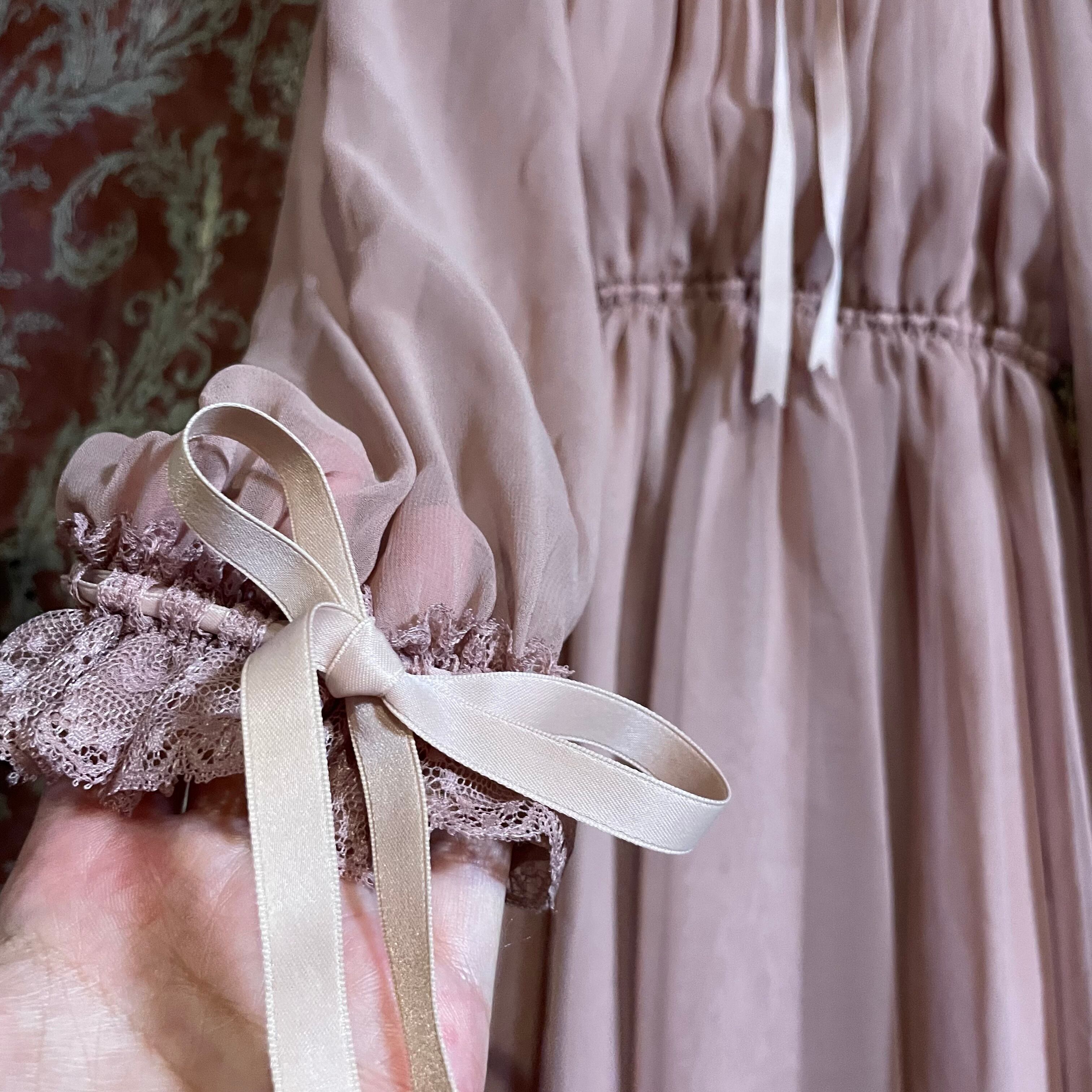 シフォン素材の軽やかな質感で、襟周りと袖口は同色のレース、リボンで装飾が施されています。