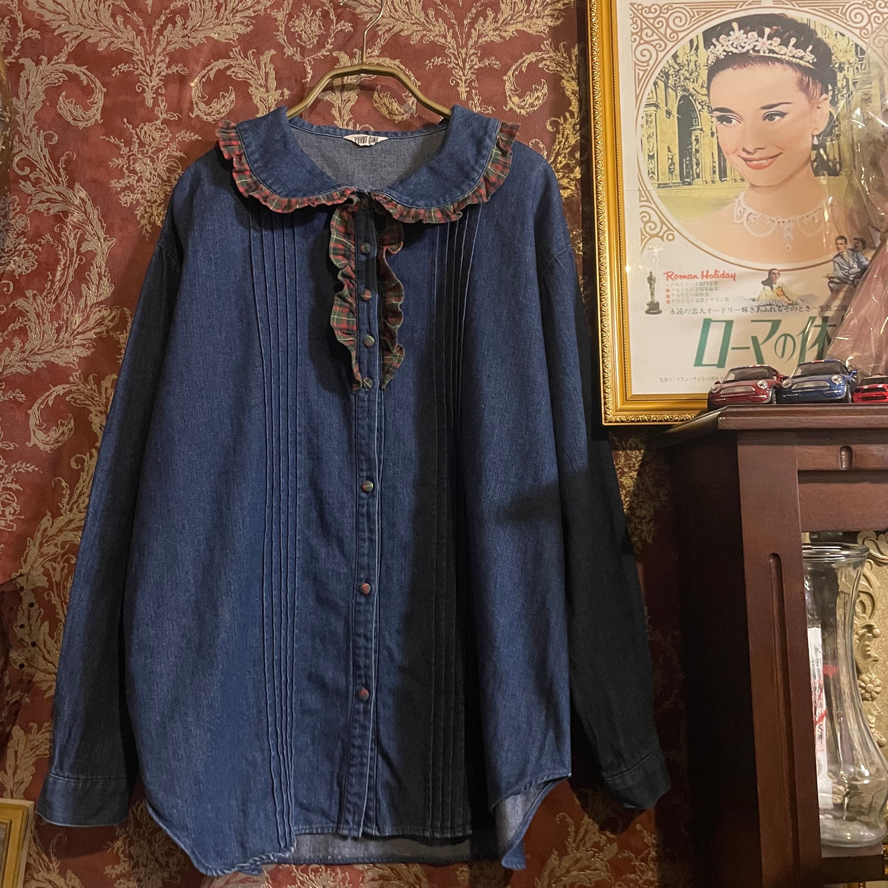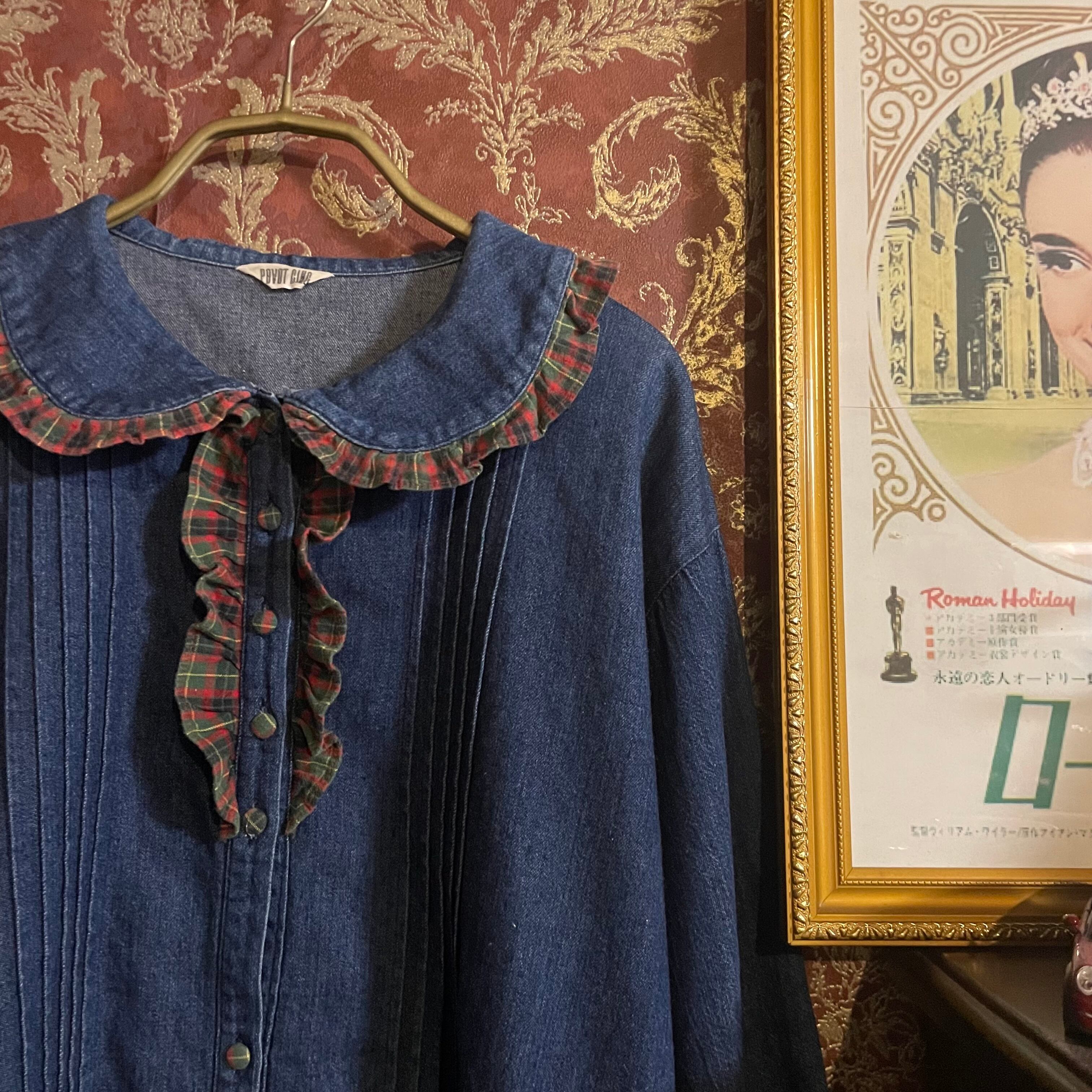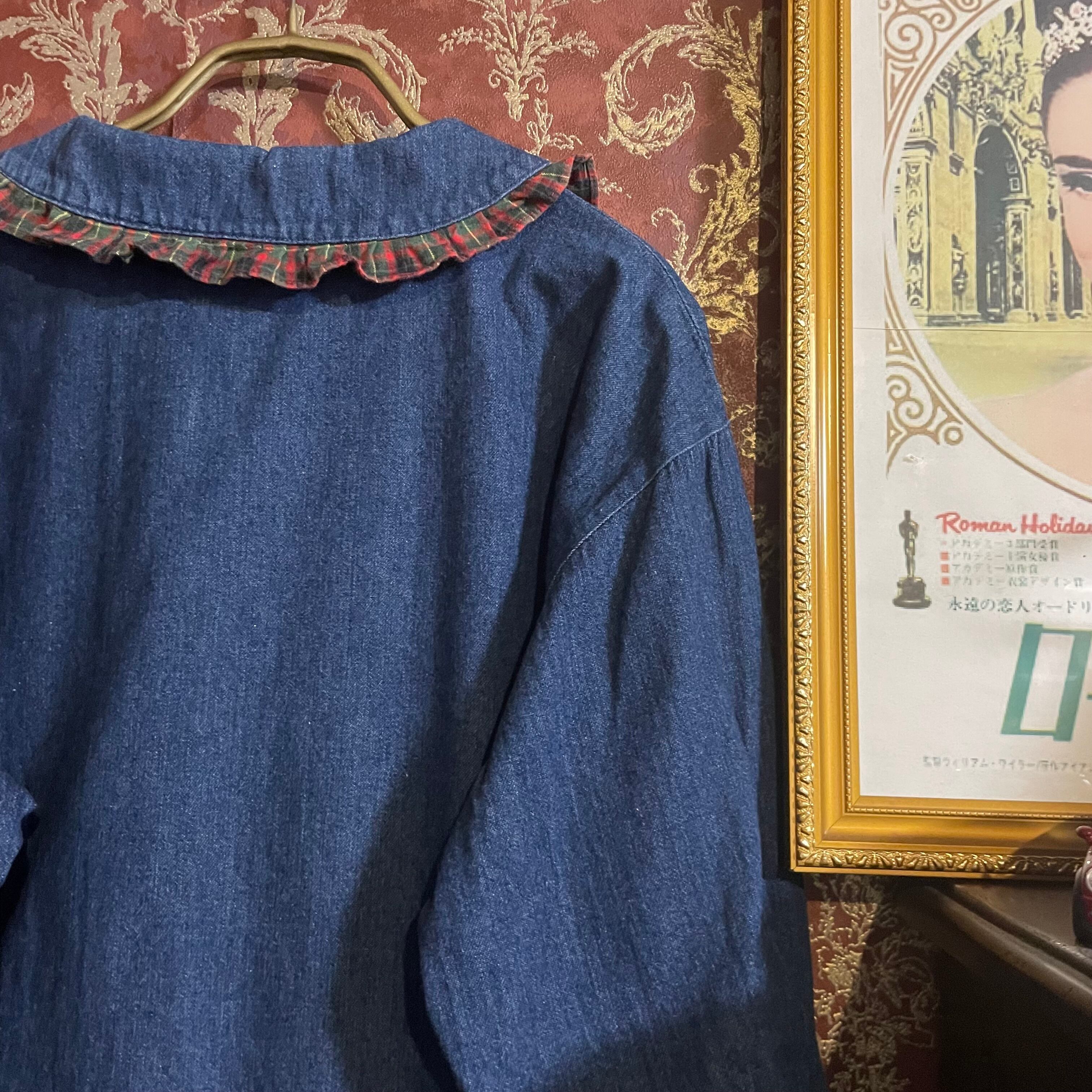 本体は無地でシンプルですが、襟や前立てのフリル、ボタンが赤チェックで可愛らしいレトロな印象です。