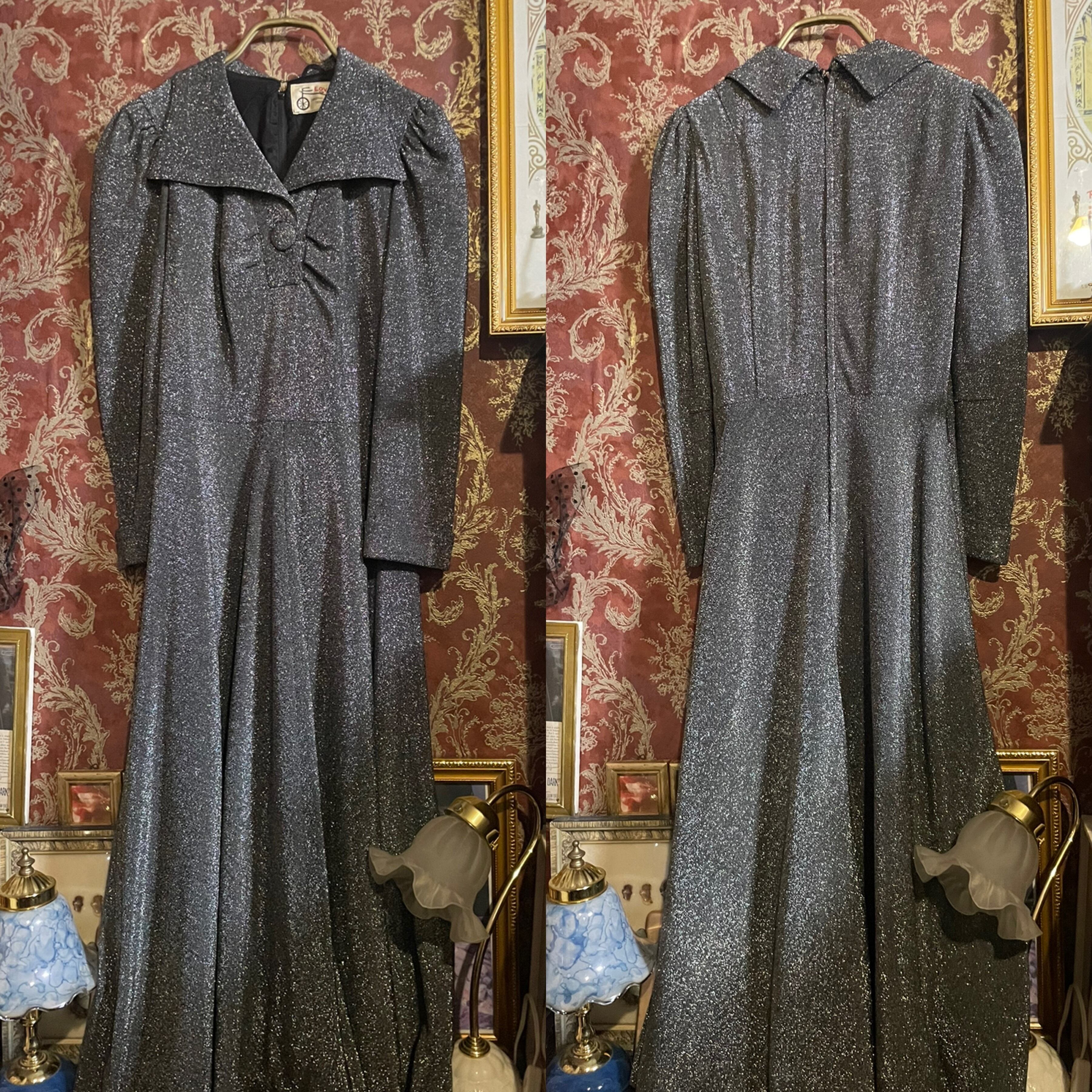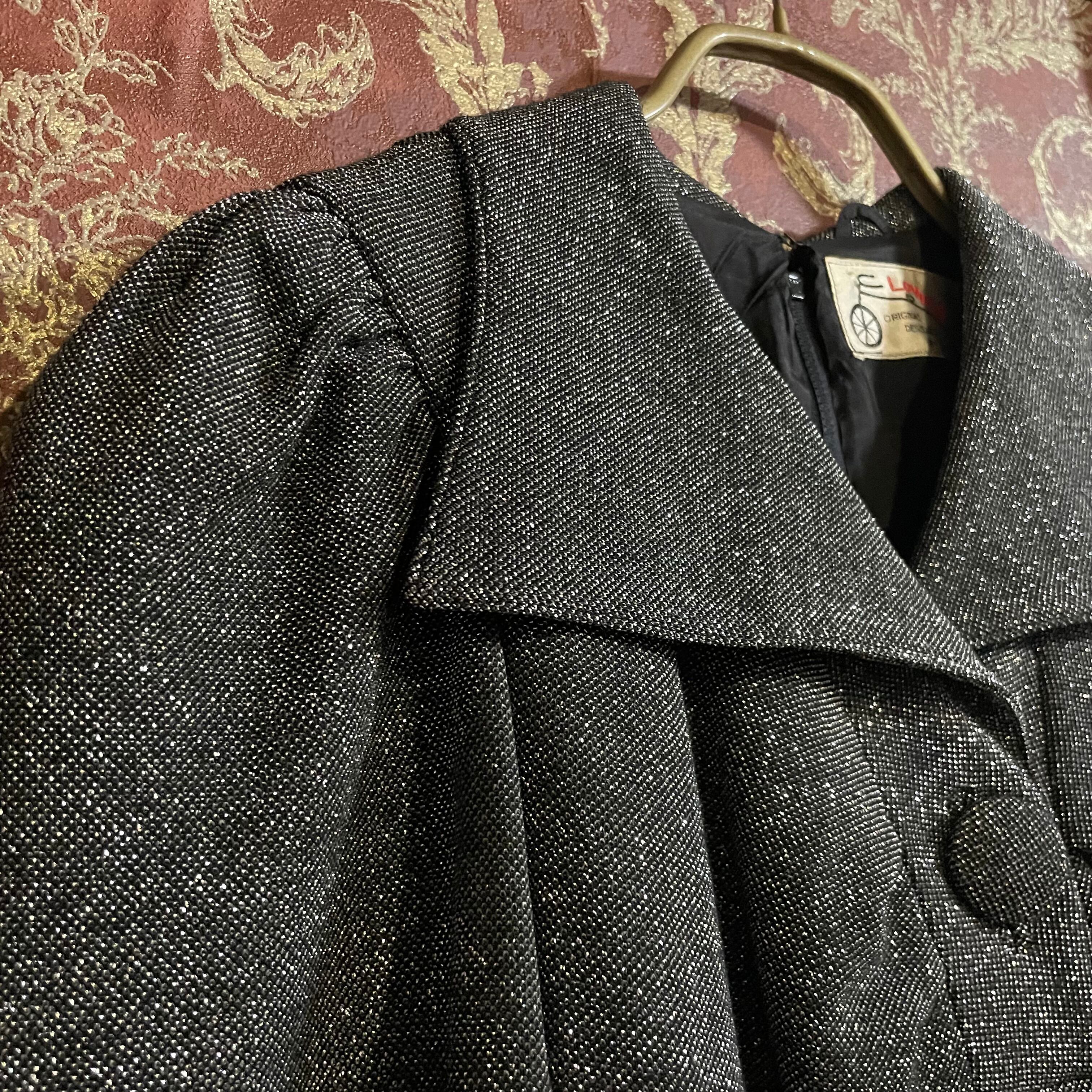 上身頃はフィット感のあるシルエットで40年代風の外に広がった大きな襟と、フロントの大きなくるみボタン、丁寧に寄せられた袖ぐりのギャザーが美しく上品で優雅な印象です。