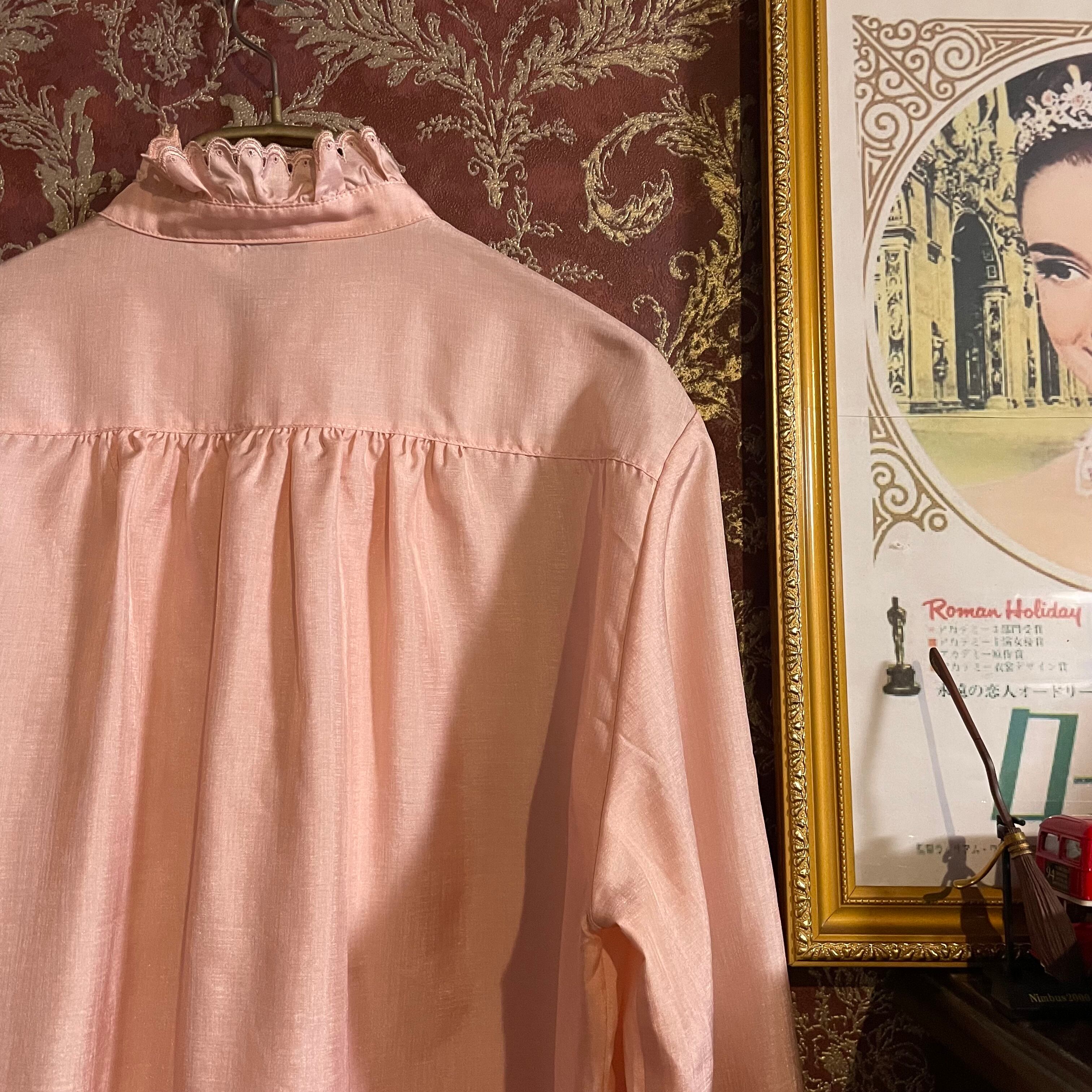 パールのように艶のあるピンク色のブラウスです。
