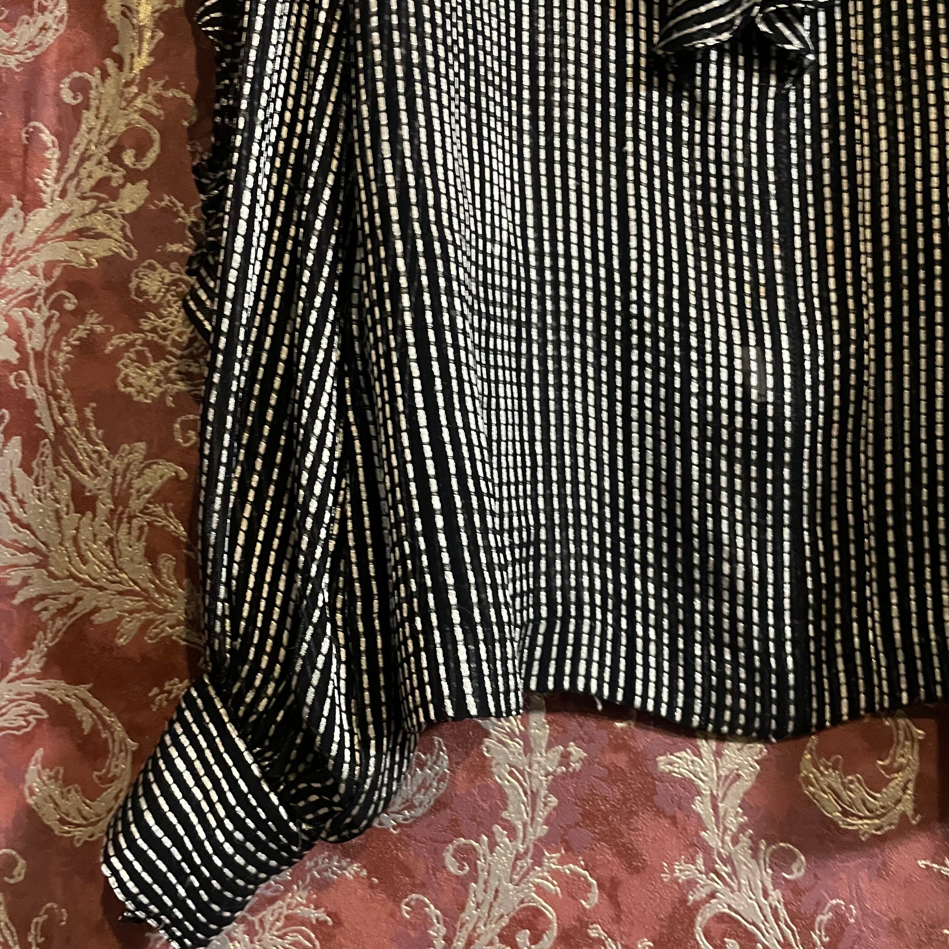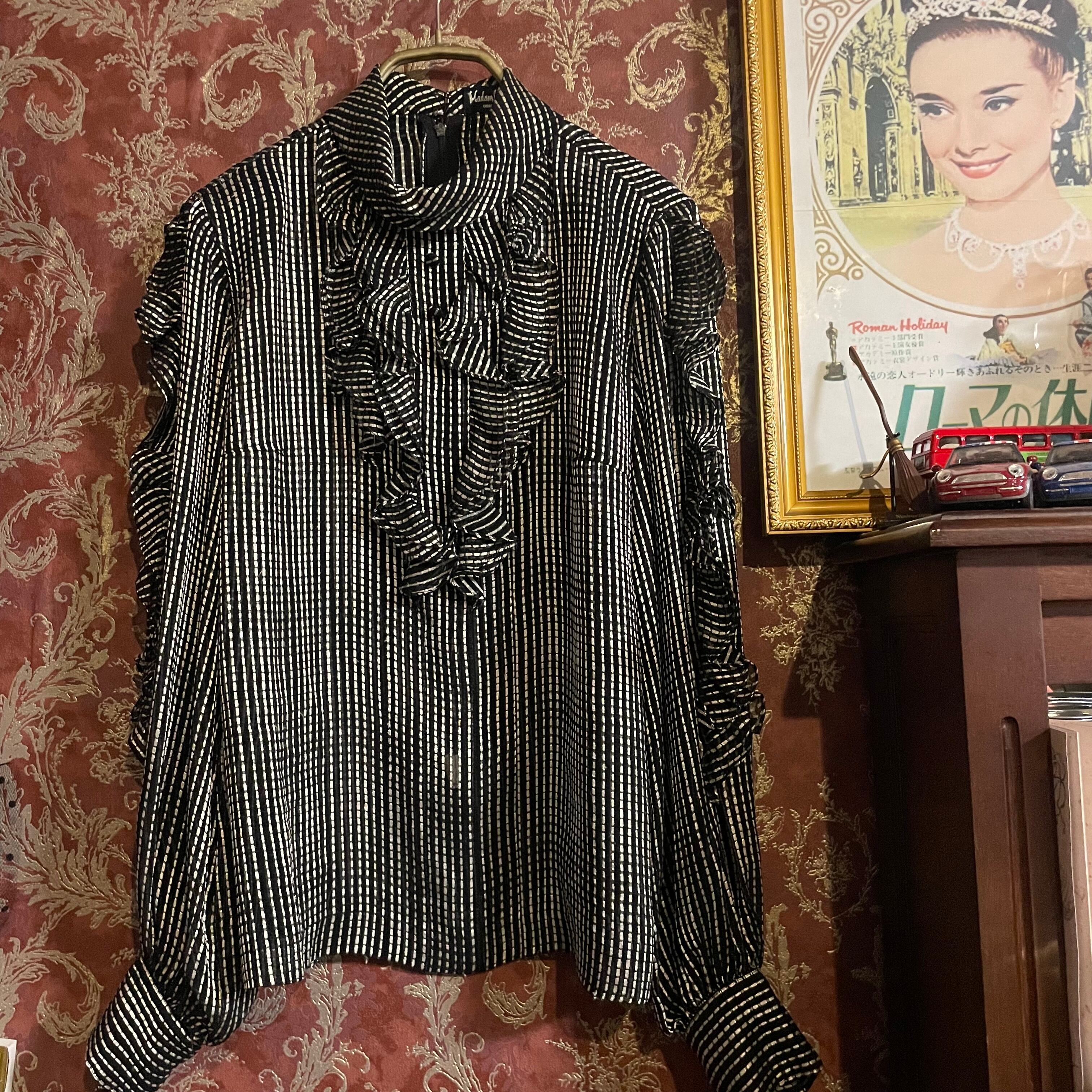 黒をベースに細かな艶のある糸で作られた白のストライプ柄のブラウスです。