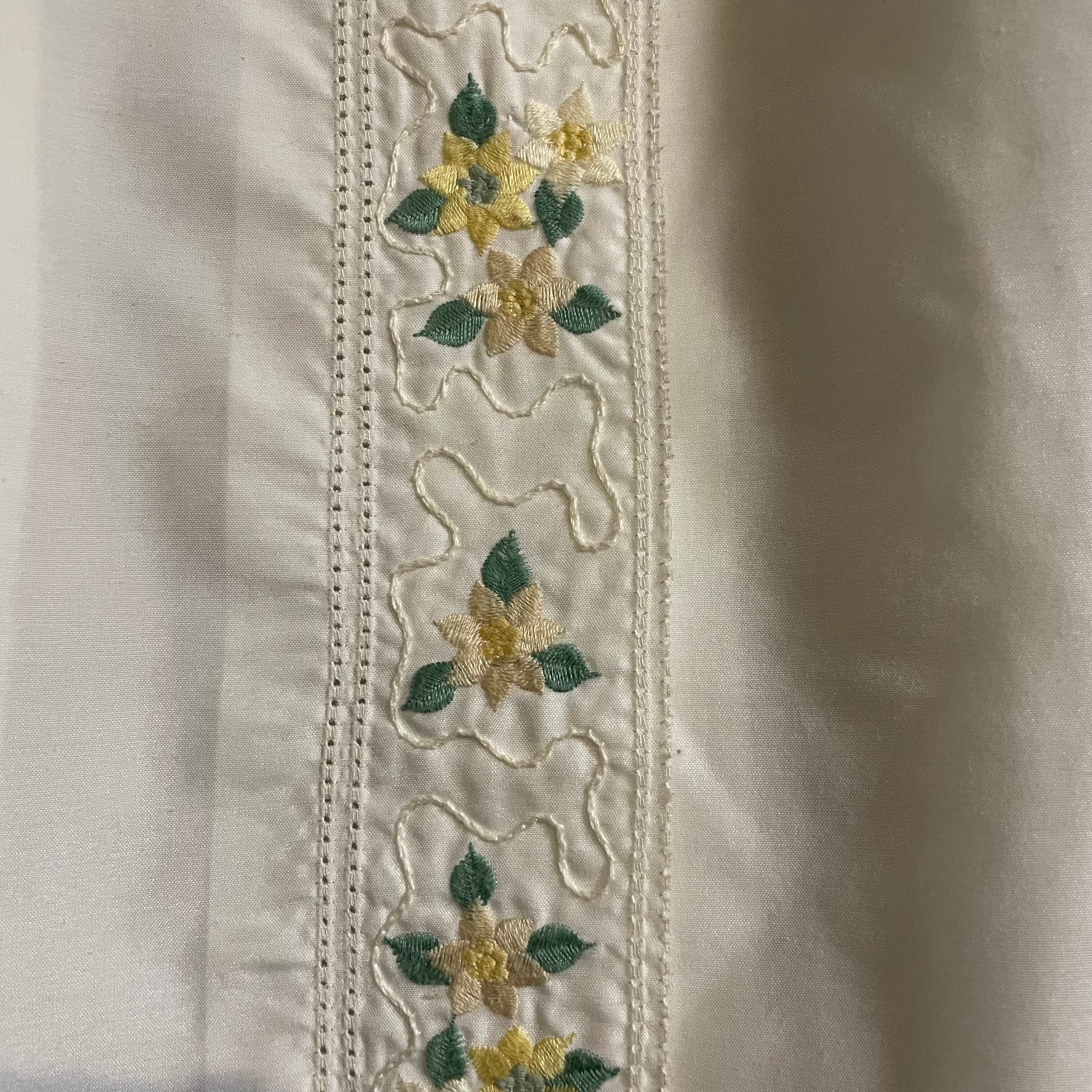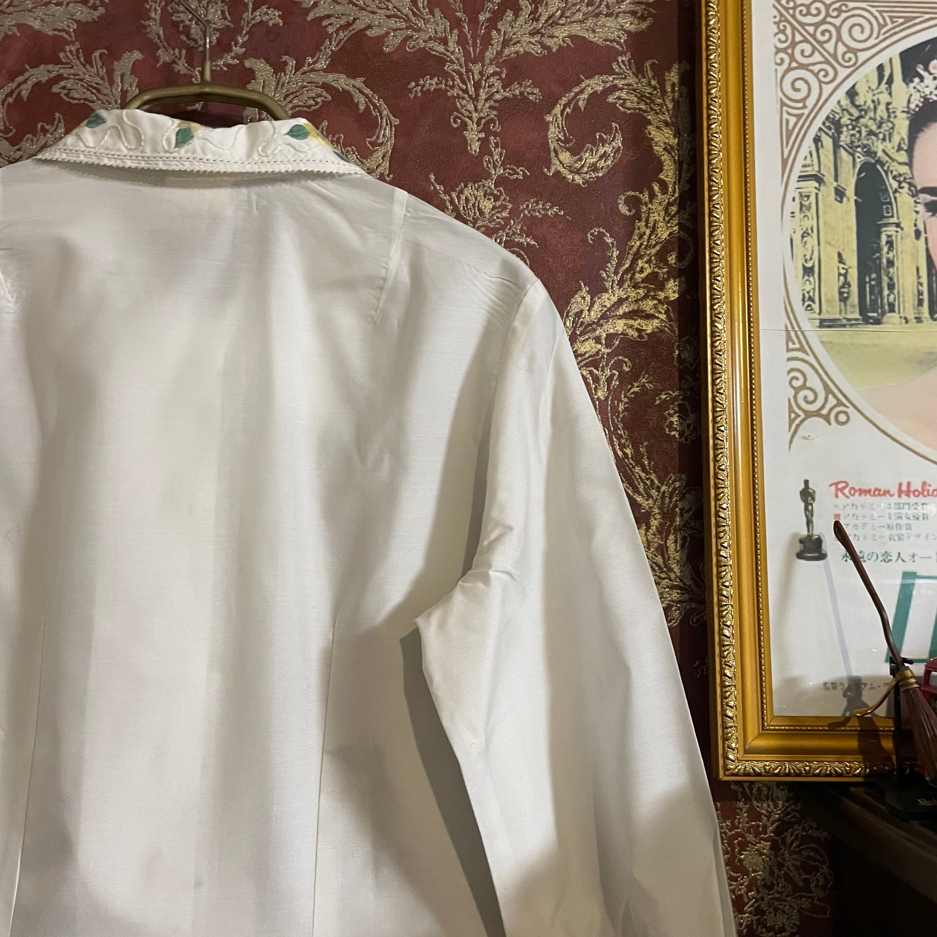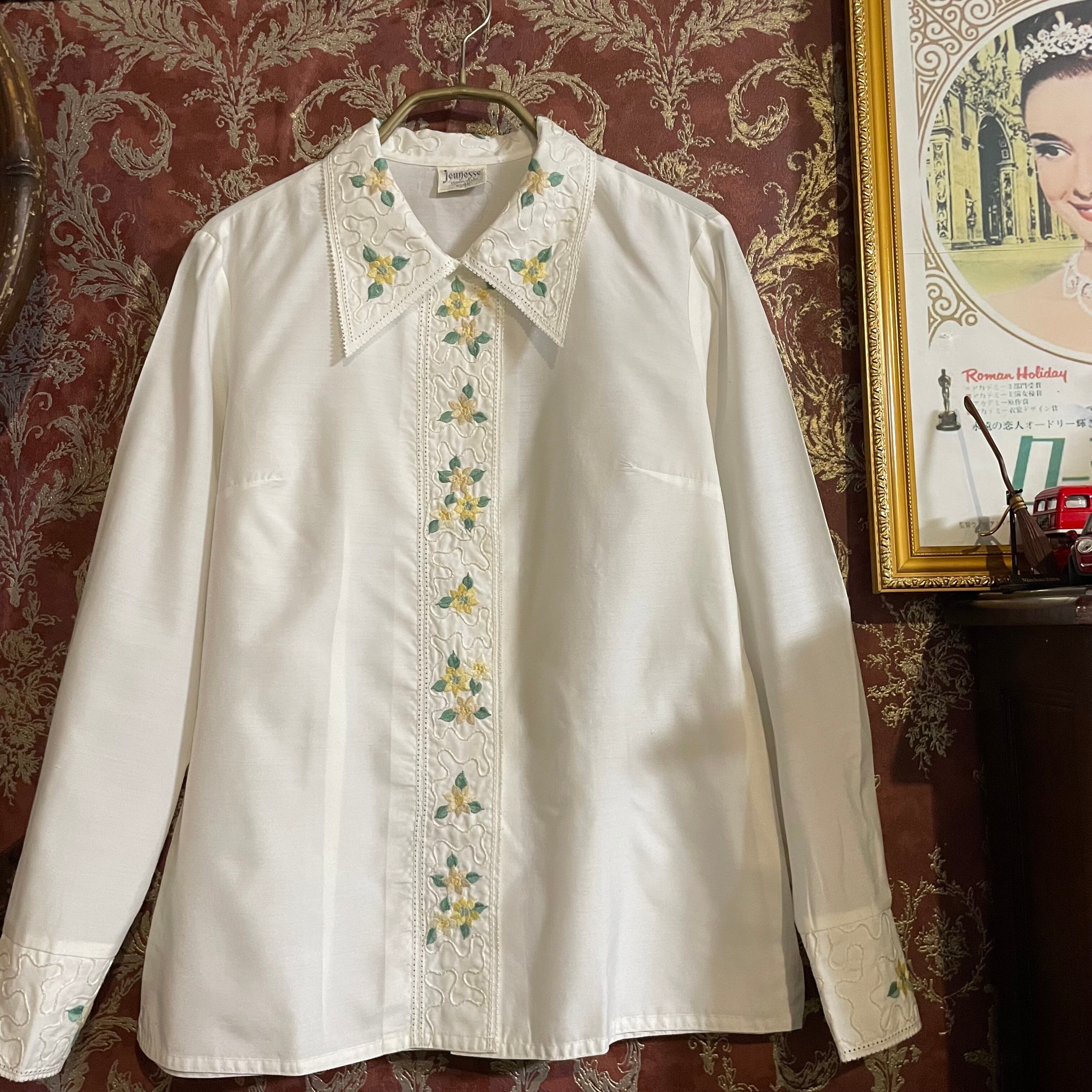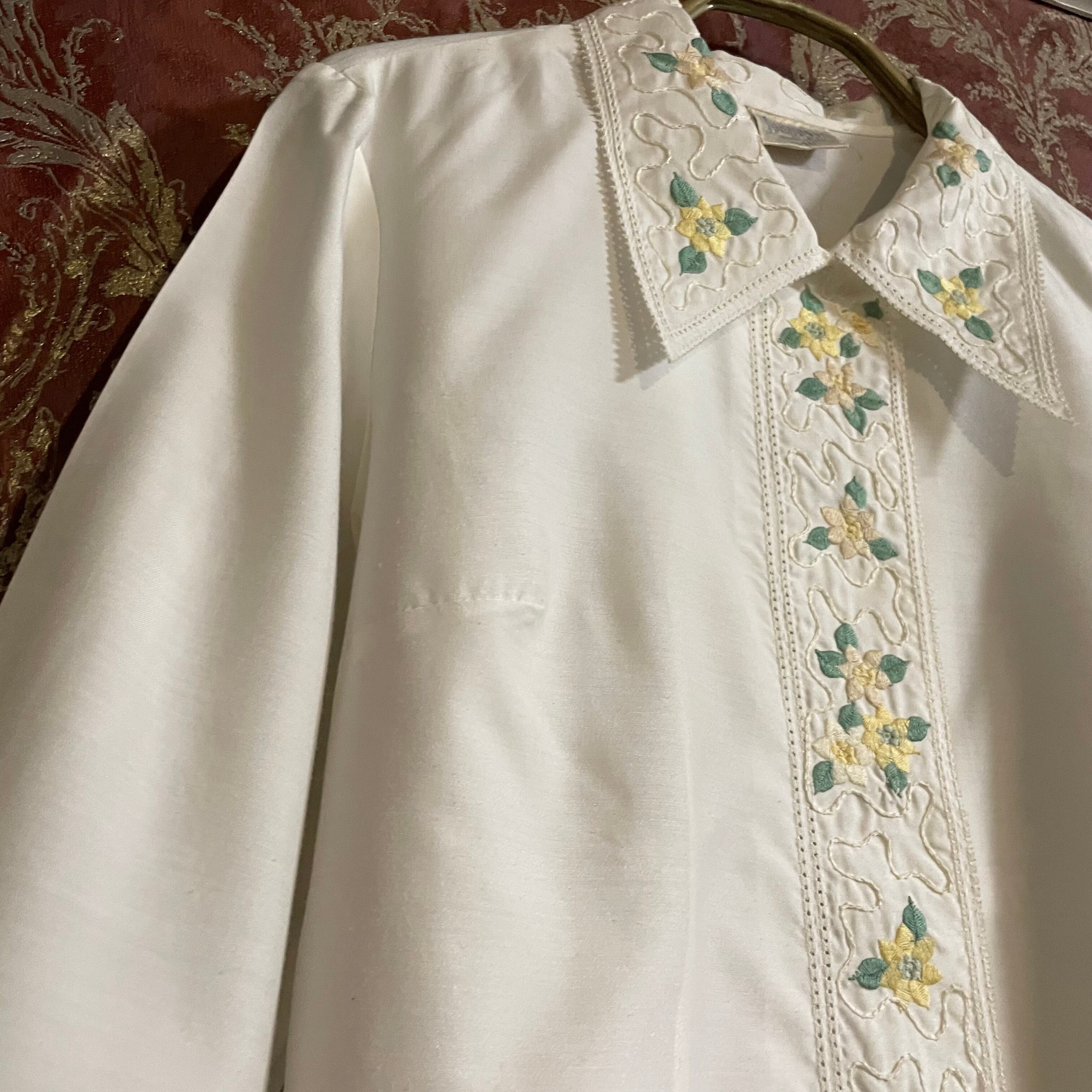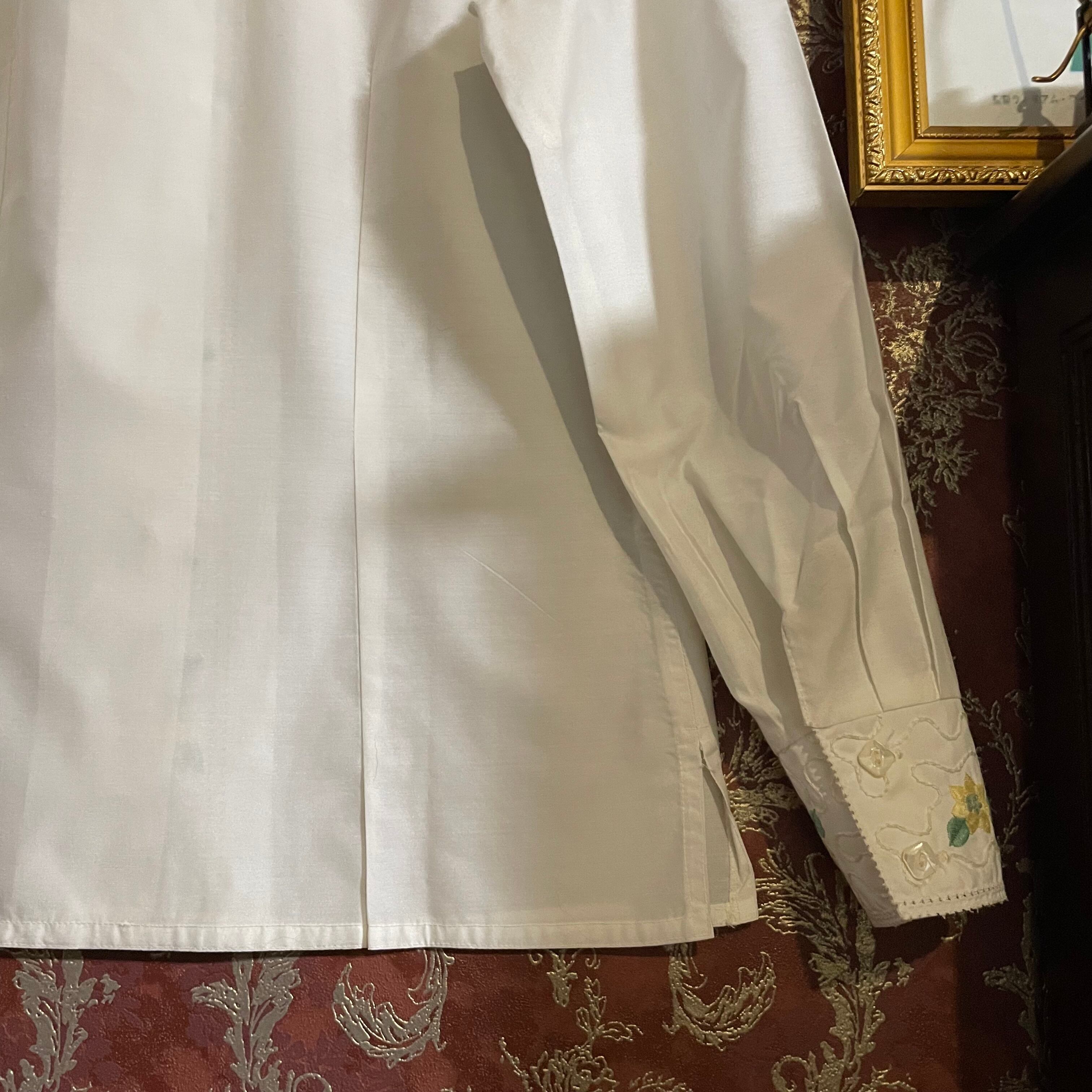 襟、前建て、カフスに黄色い花の刺繍が施されています。