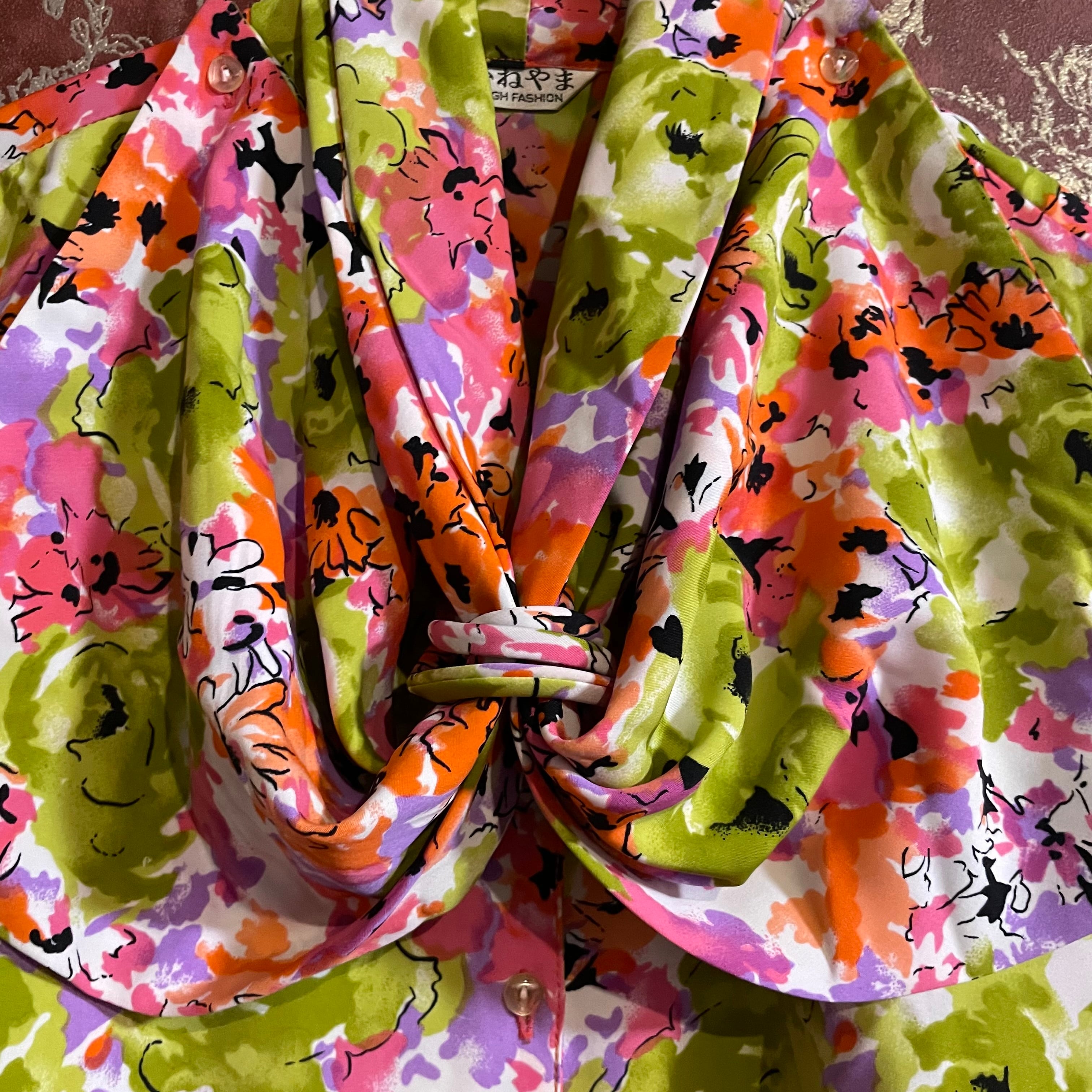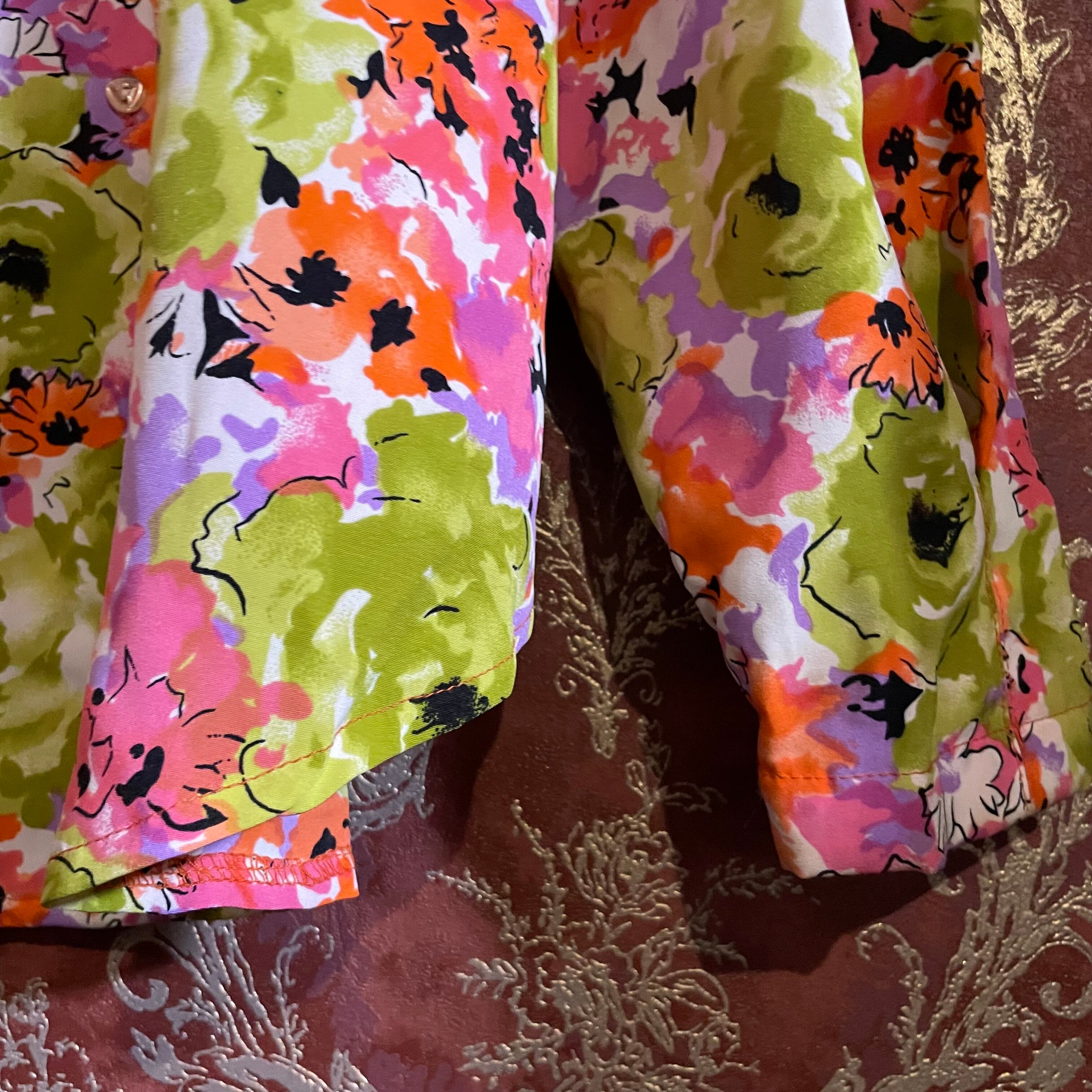 黄緑、オレンジ、ピンク、紫の水彩画のように大胆なタッチのカラフルな花柄ブラウスです。