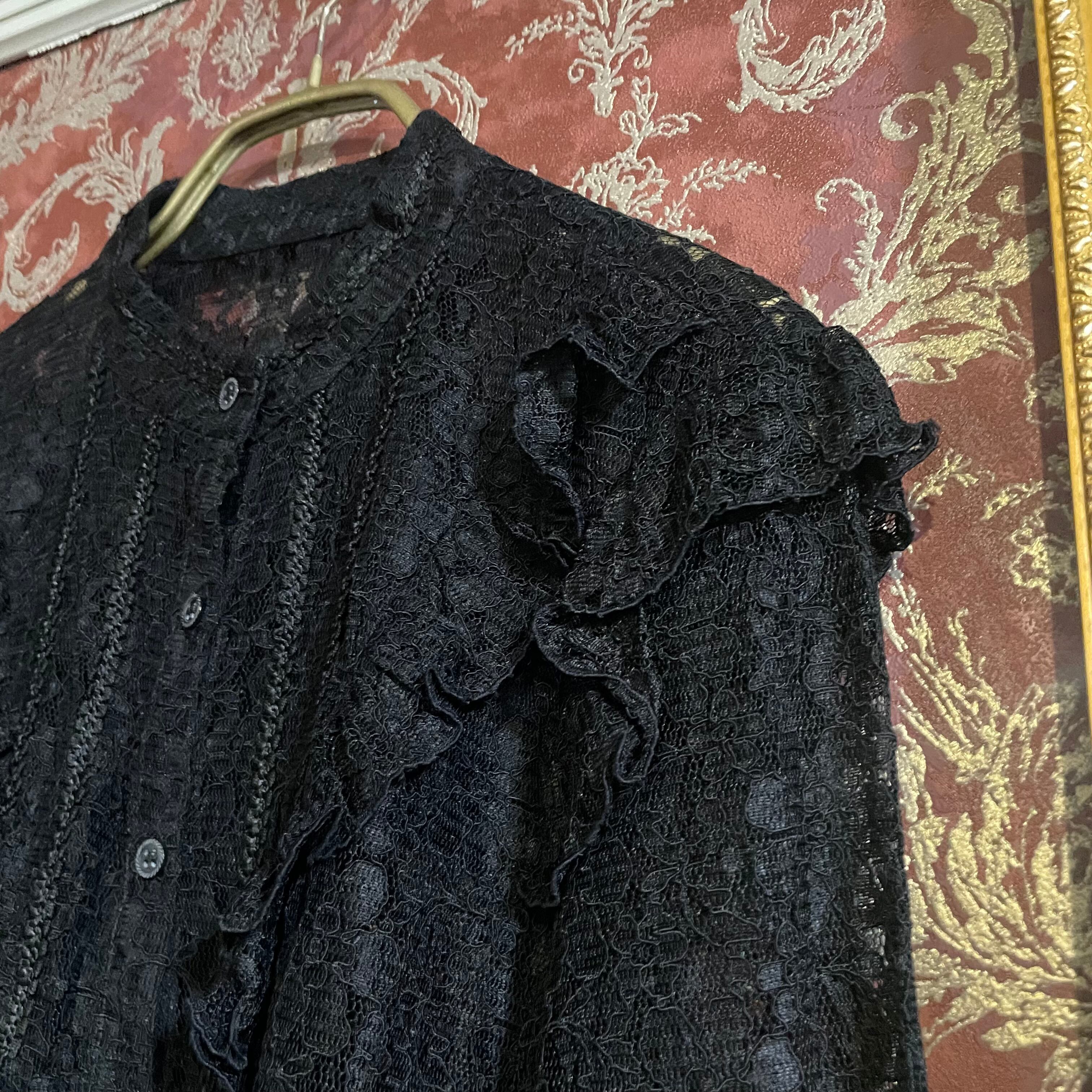 控えめなスタンドカラーとカフスにはフリルが付いているのでレイヤードにも◎