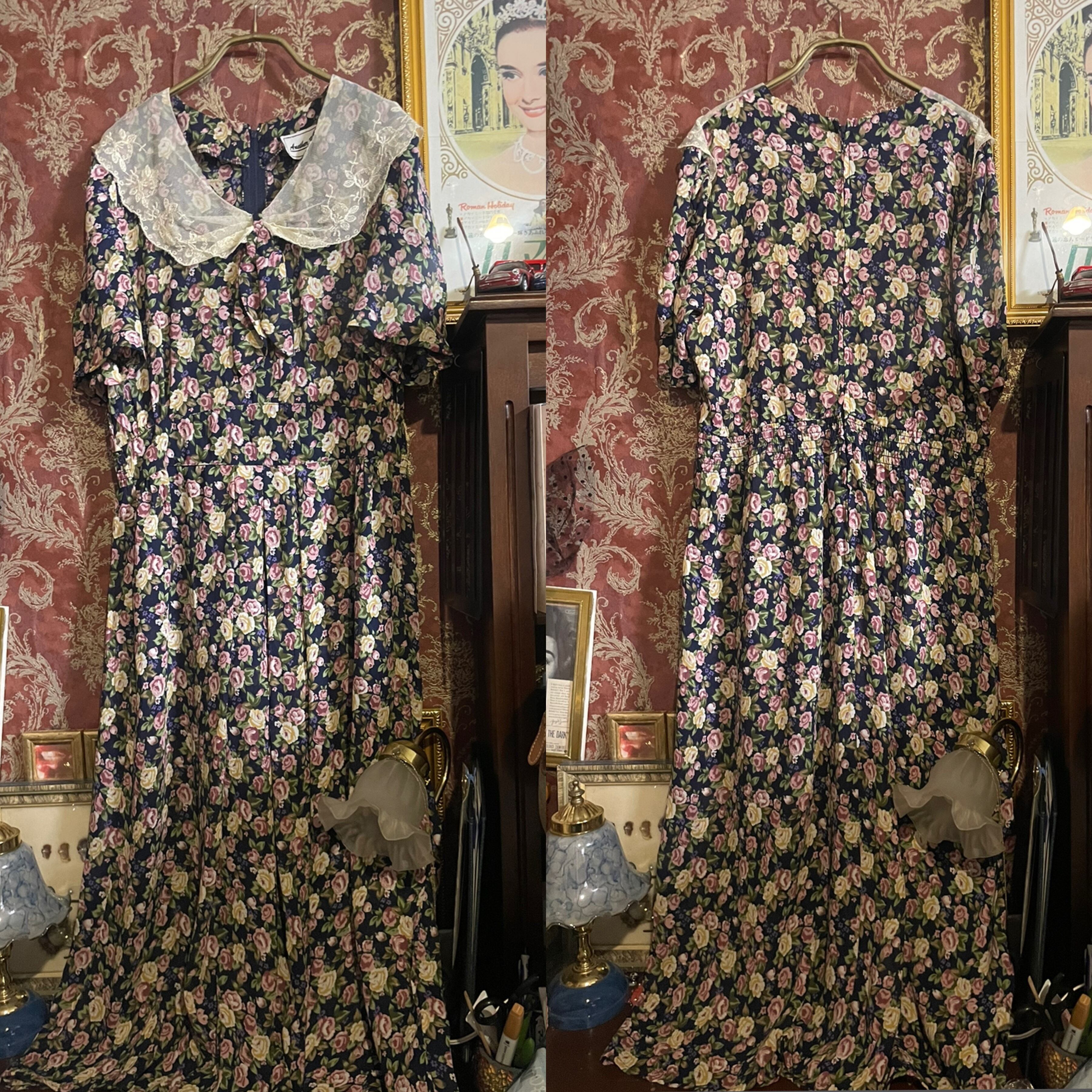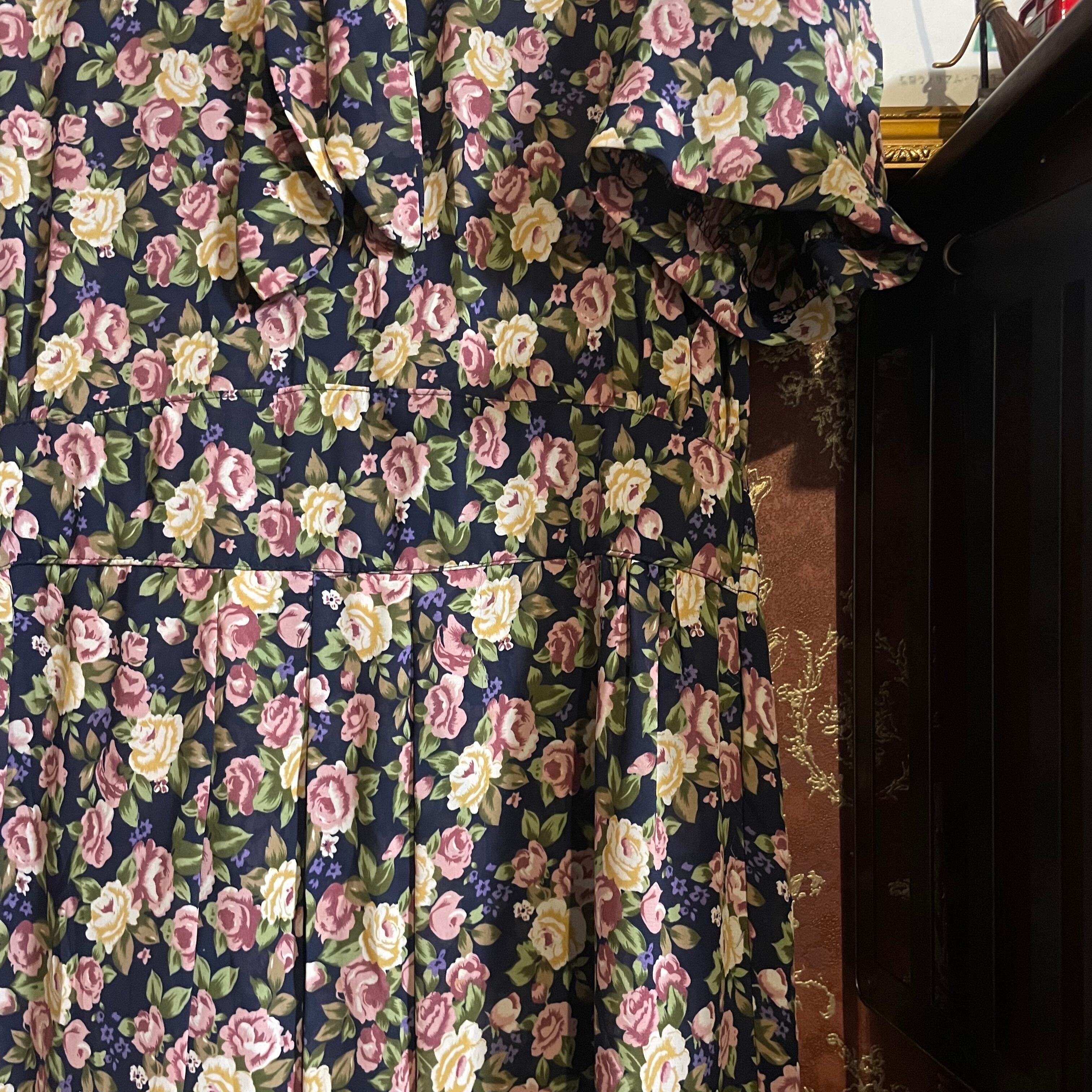 ヴィンテージ感たっぷりの花柄ショール襟ドレスです。