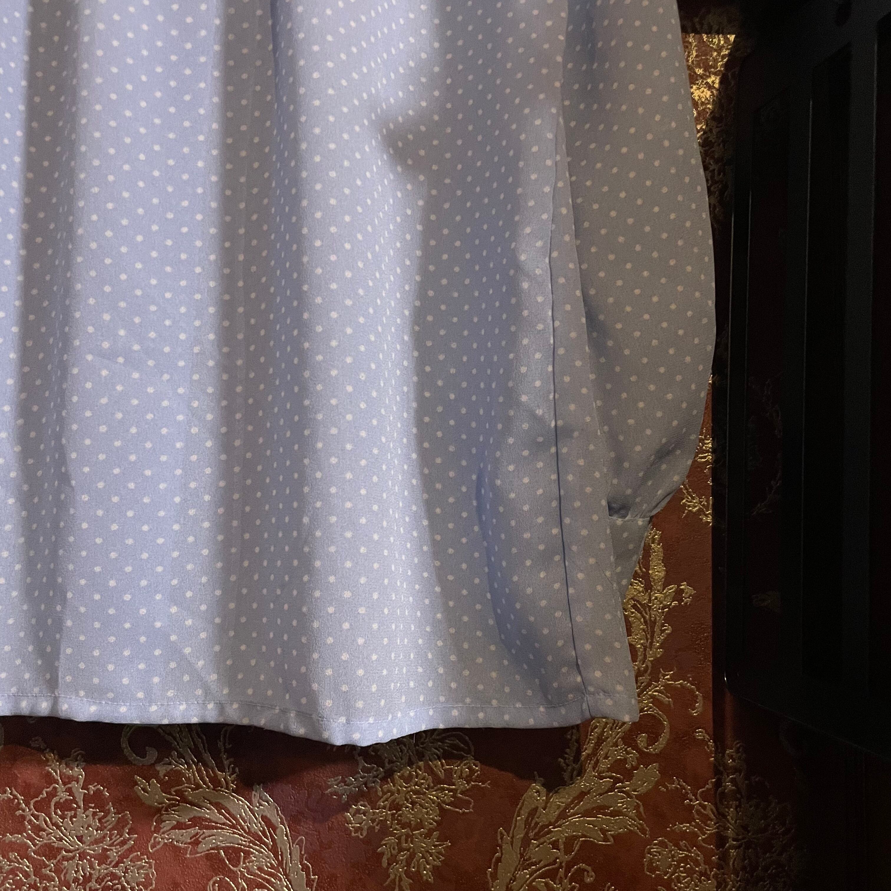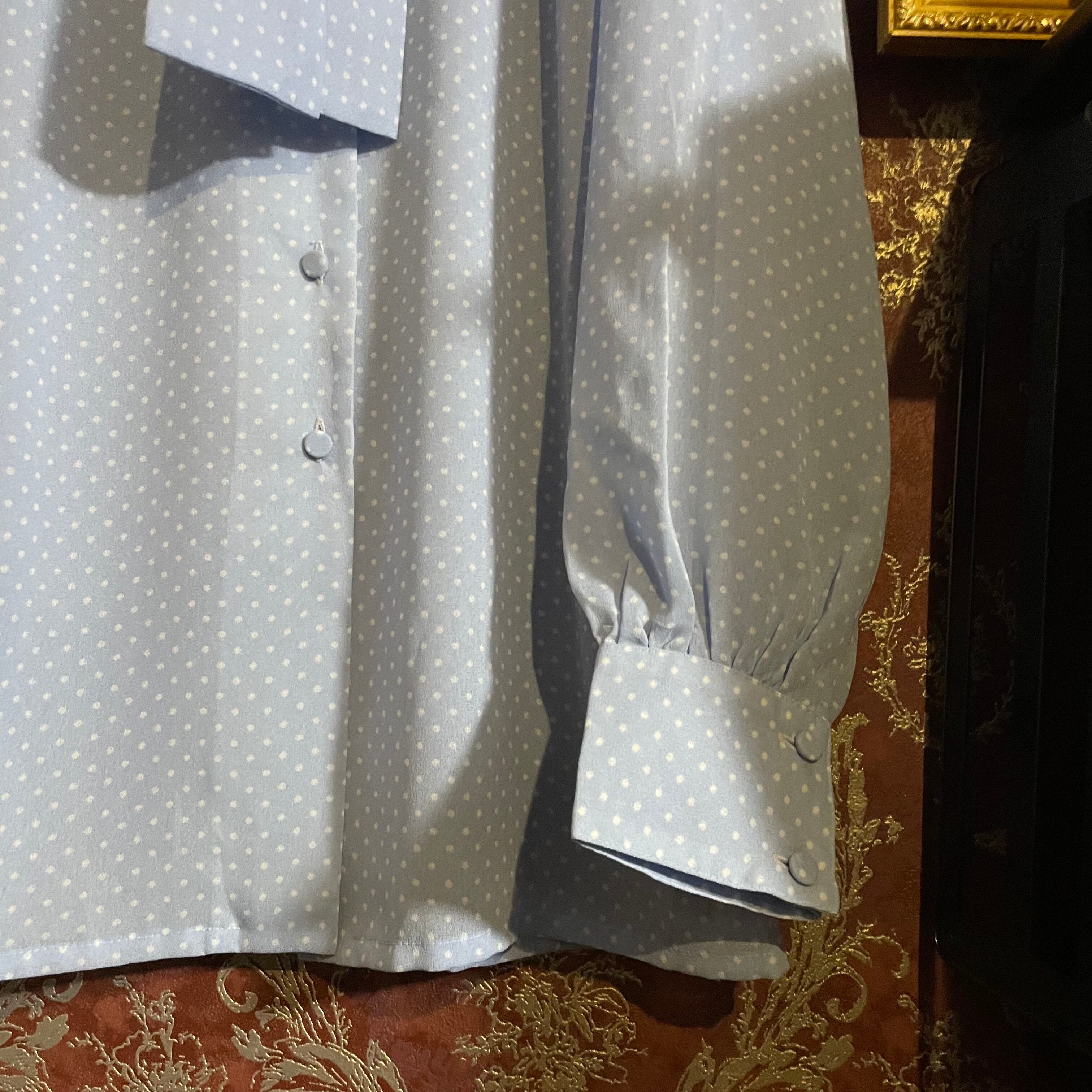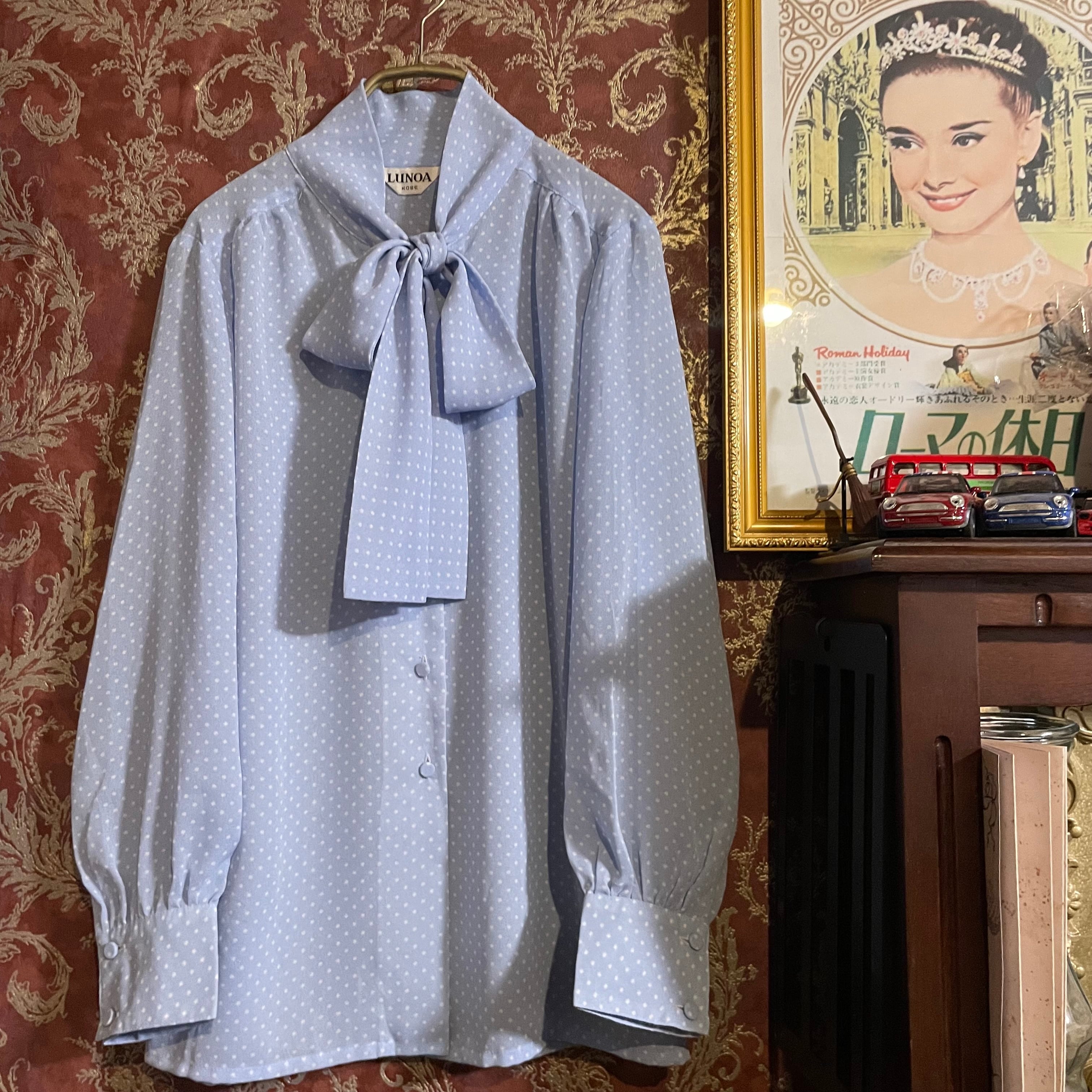 レトロな雰囲気漂う、水色×白のドット柄ボウタイブラウスです。