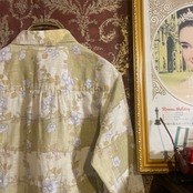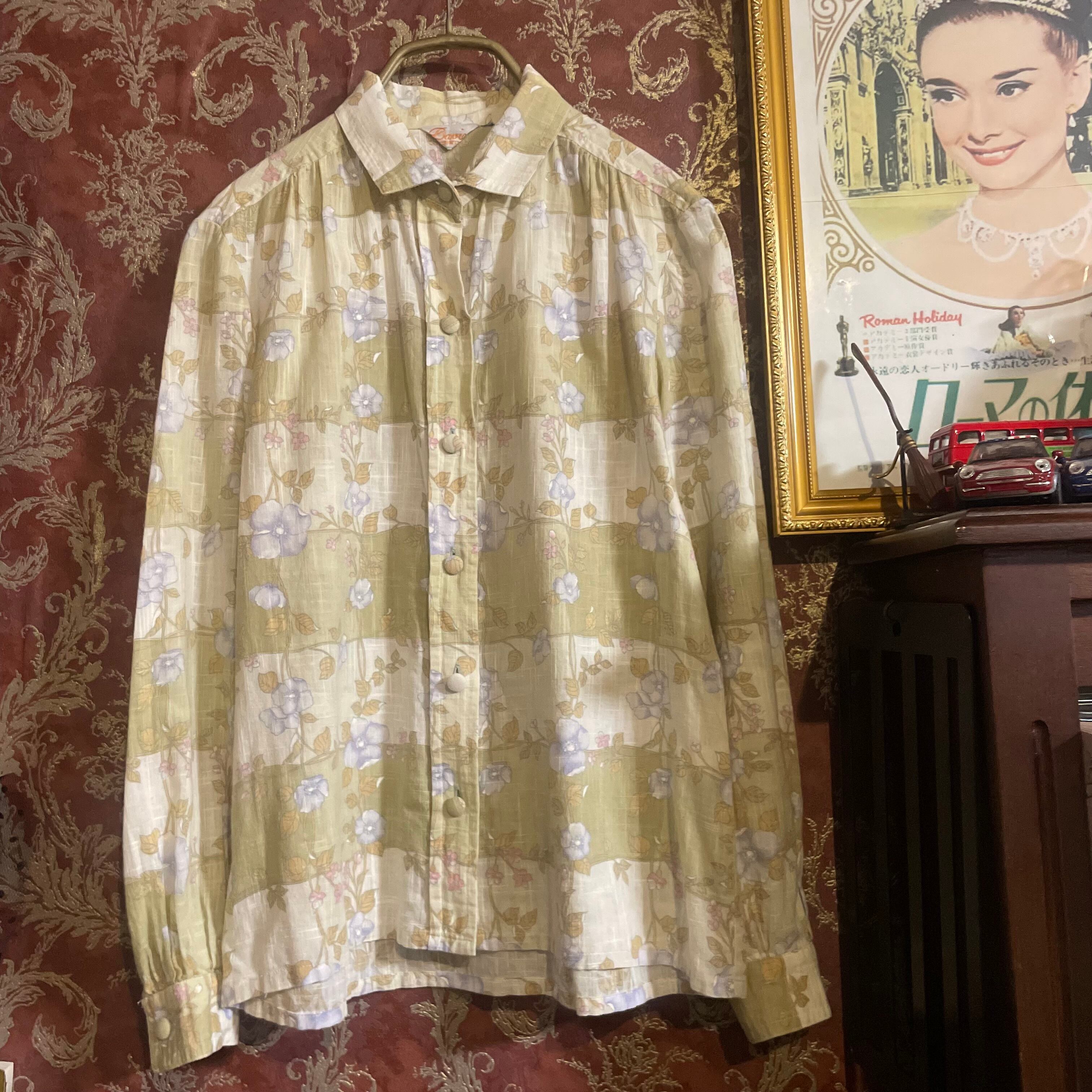 ベージュ味のある緑と生成りをベースとした花柄ブラウスです。