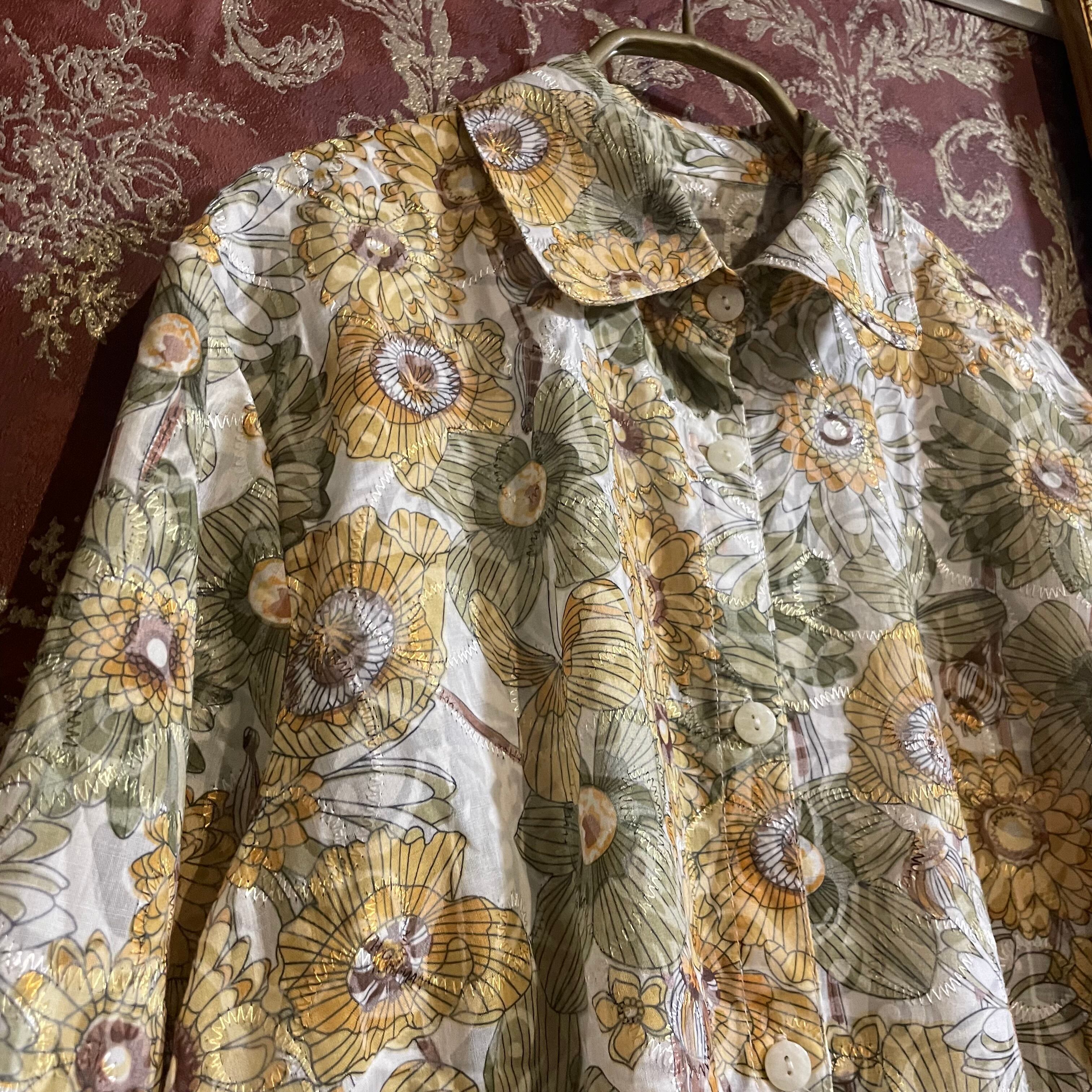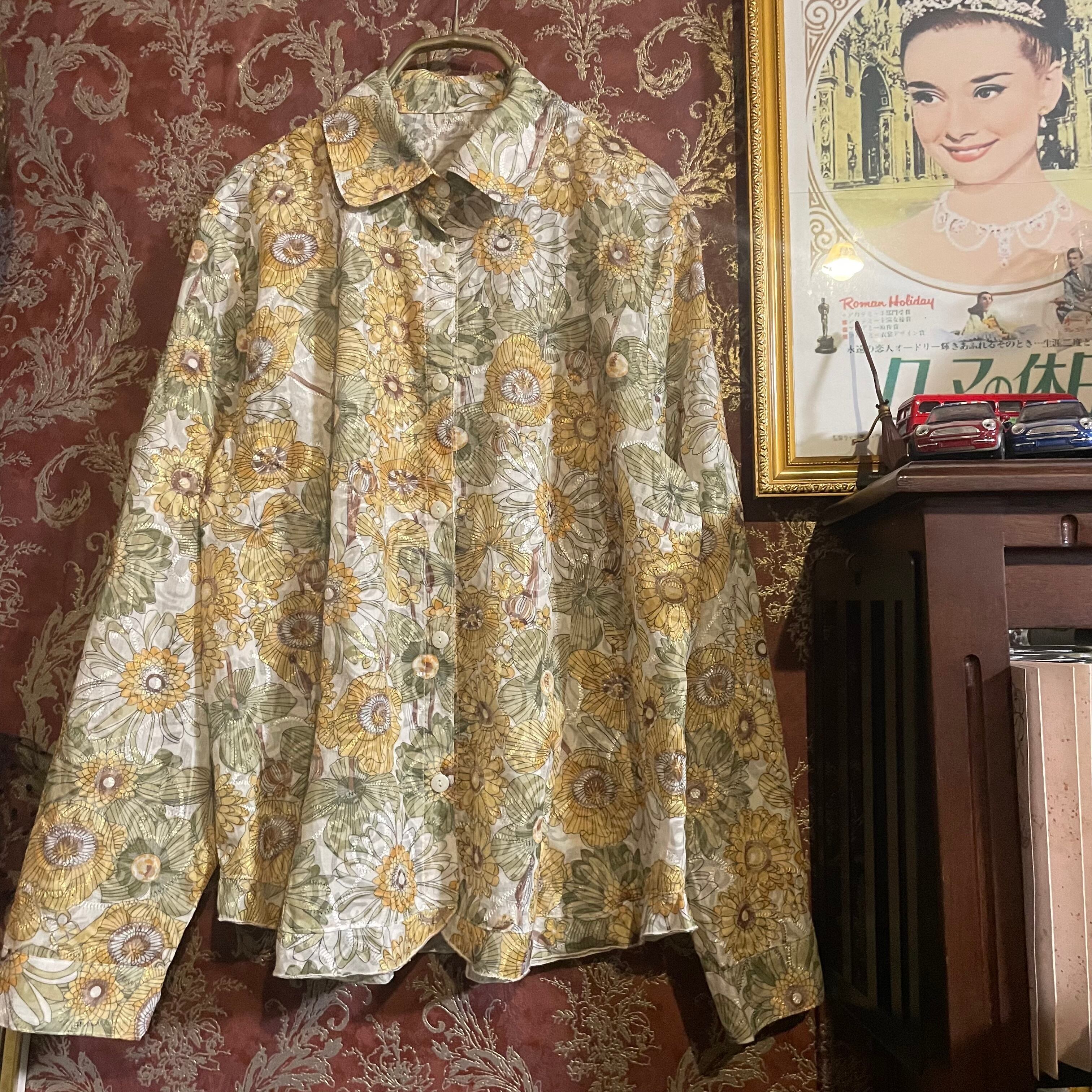 ステンドグラスのような美しいひまわり柄が目を引く、ジグザグステッチ入りのブラウスです。