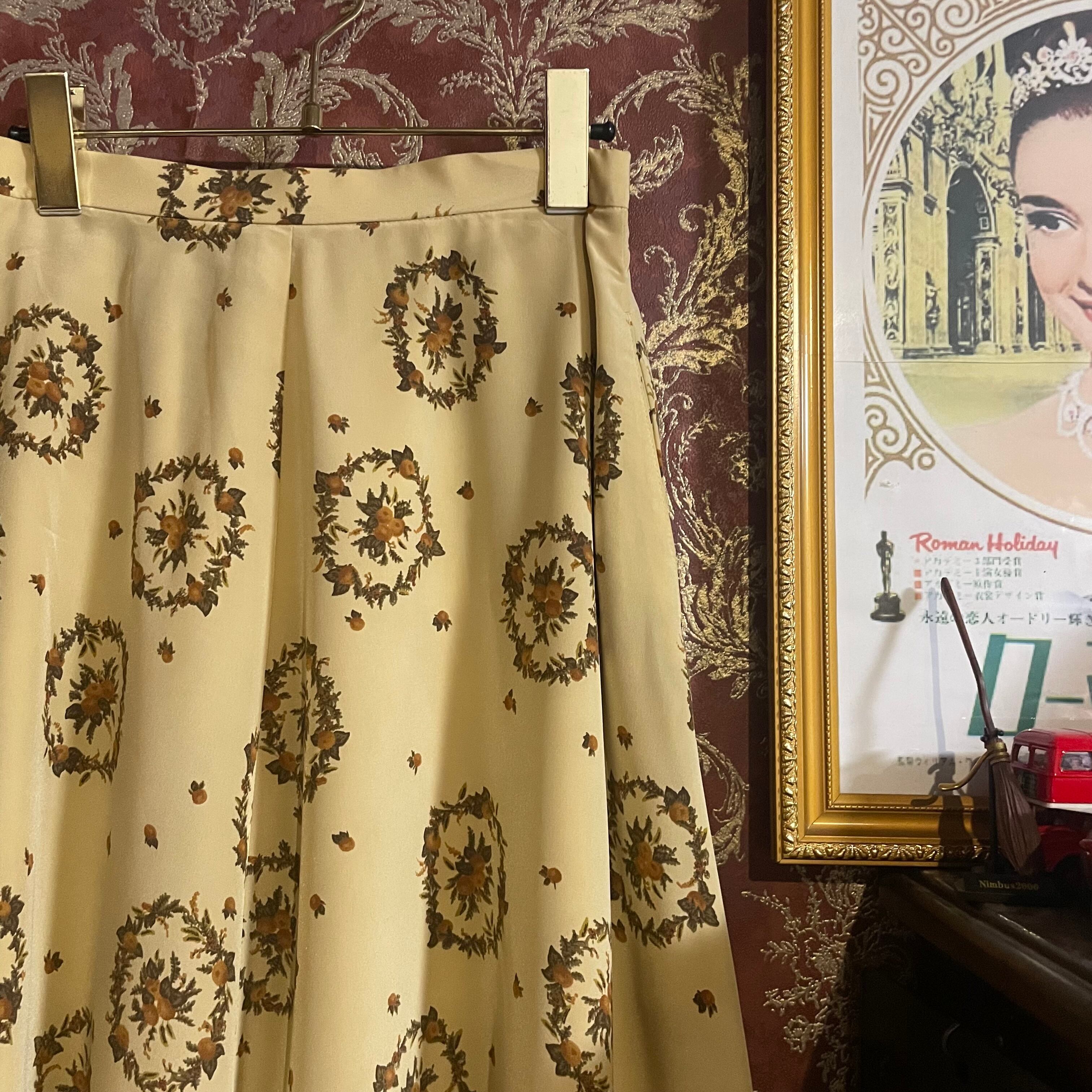 くすみカラーのリース柄が目を引くデザインで、柔らかい色使いと可愛らしいシルエットが、春夏の陽射しにピッタリです。