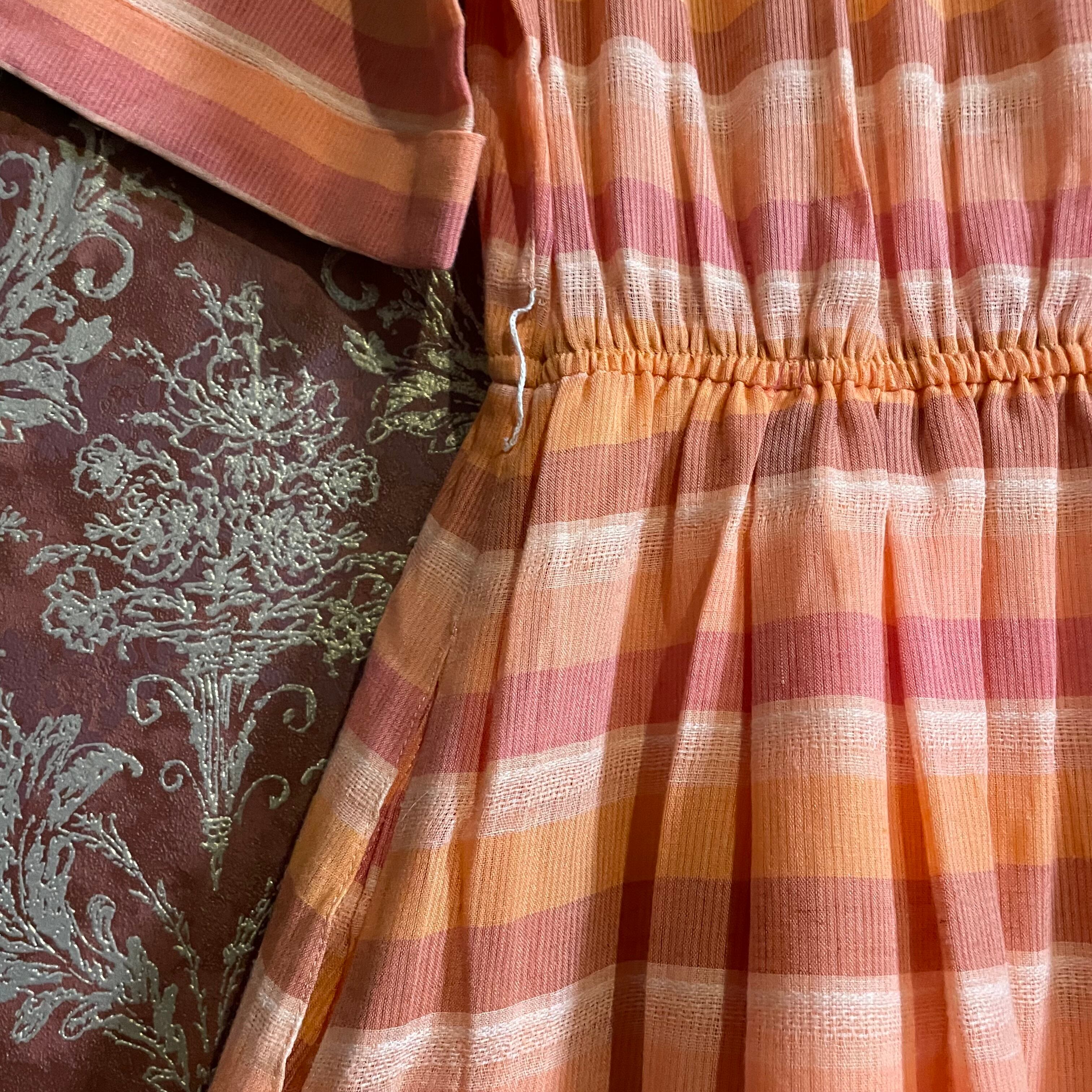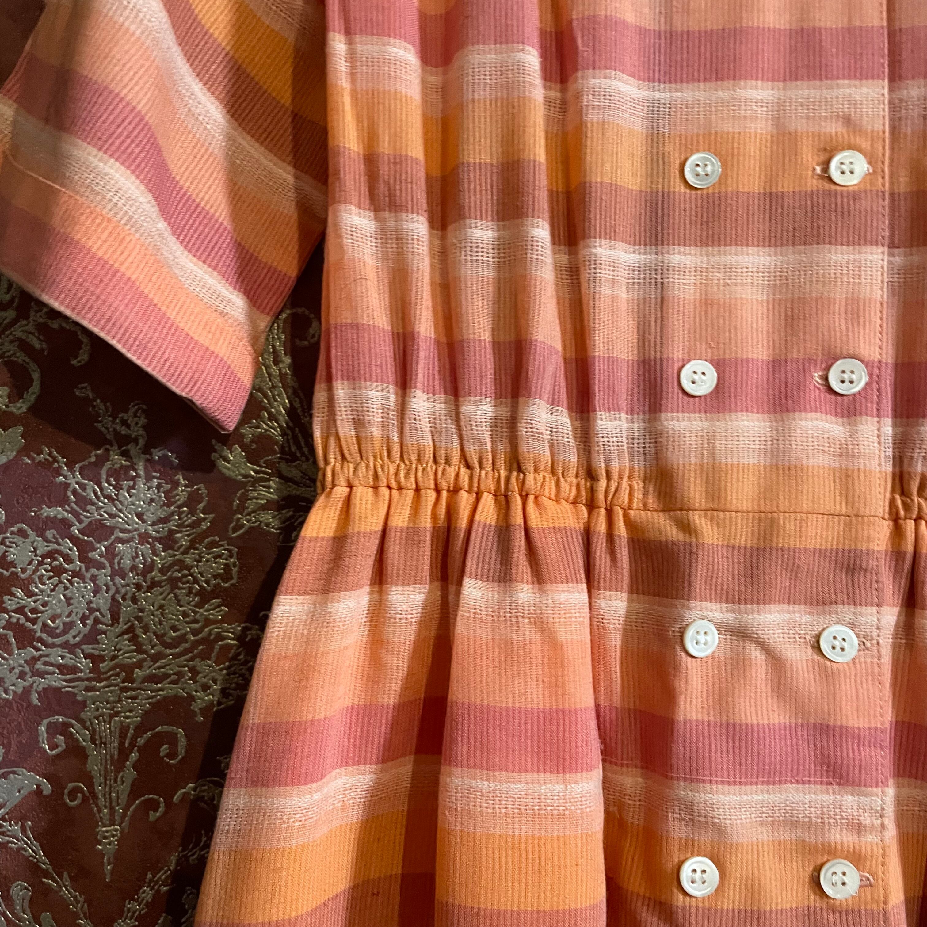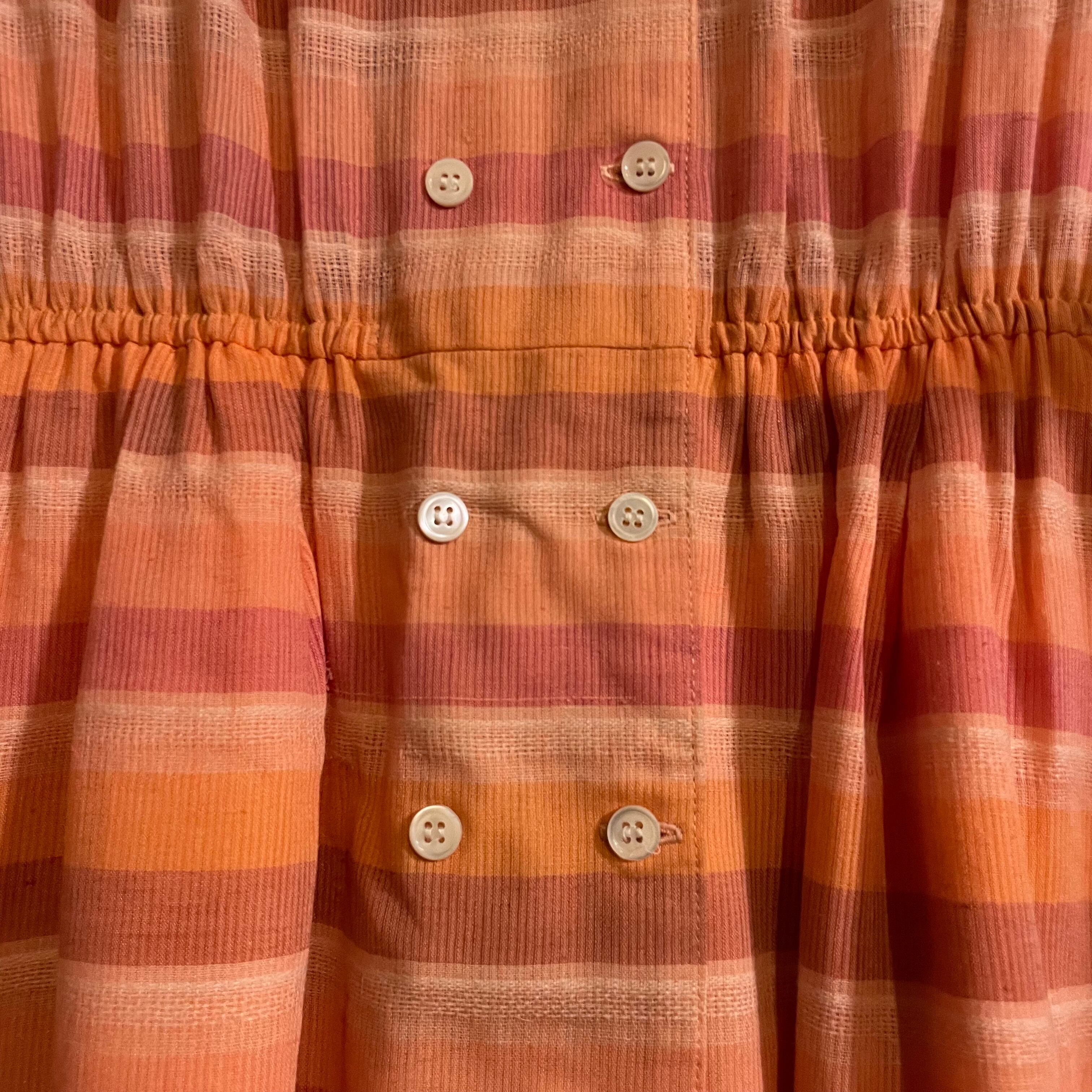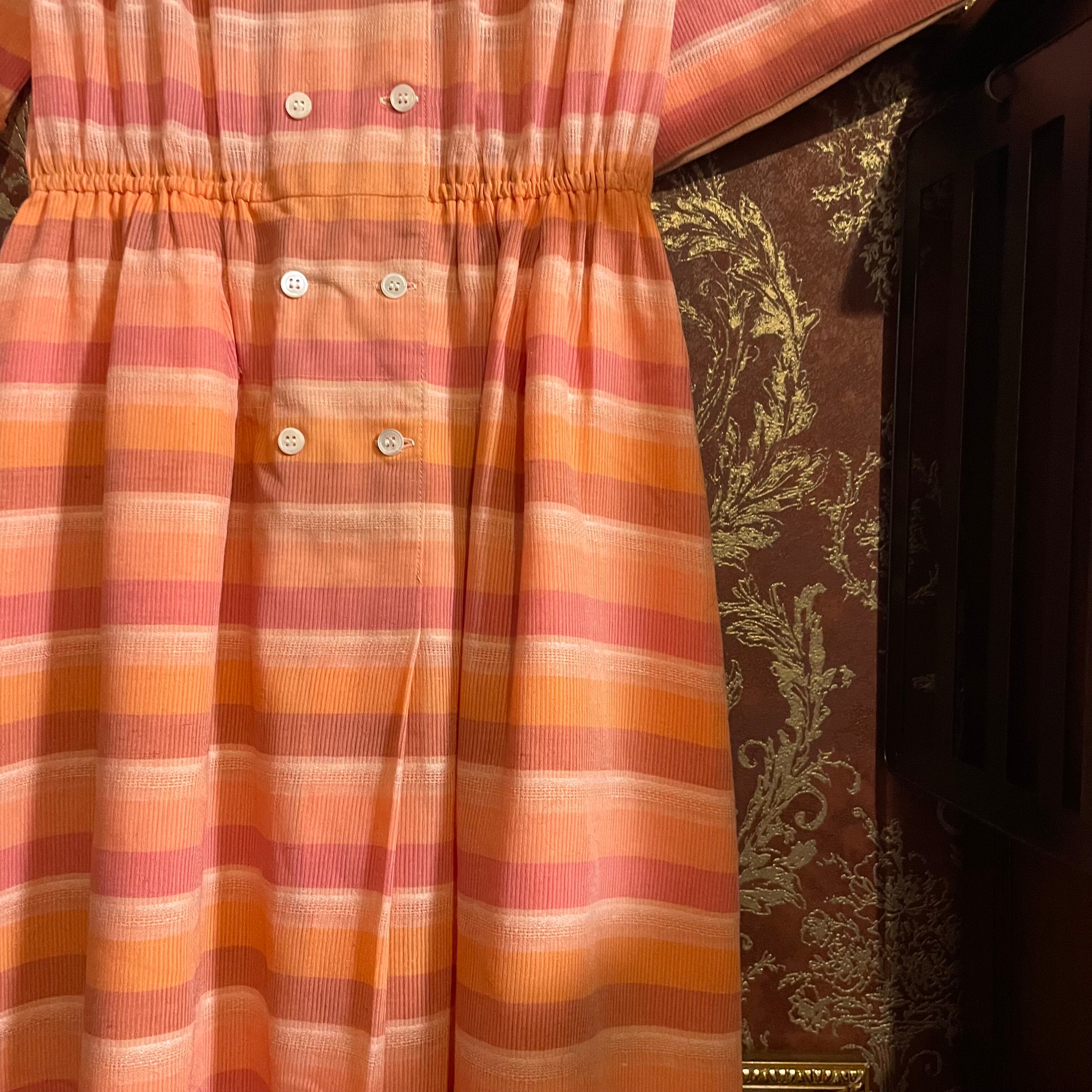 サーモンピンクを基調としたマルチボーダー柄のワンピースです。