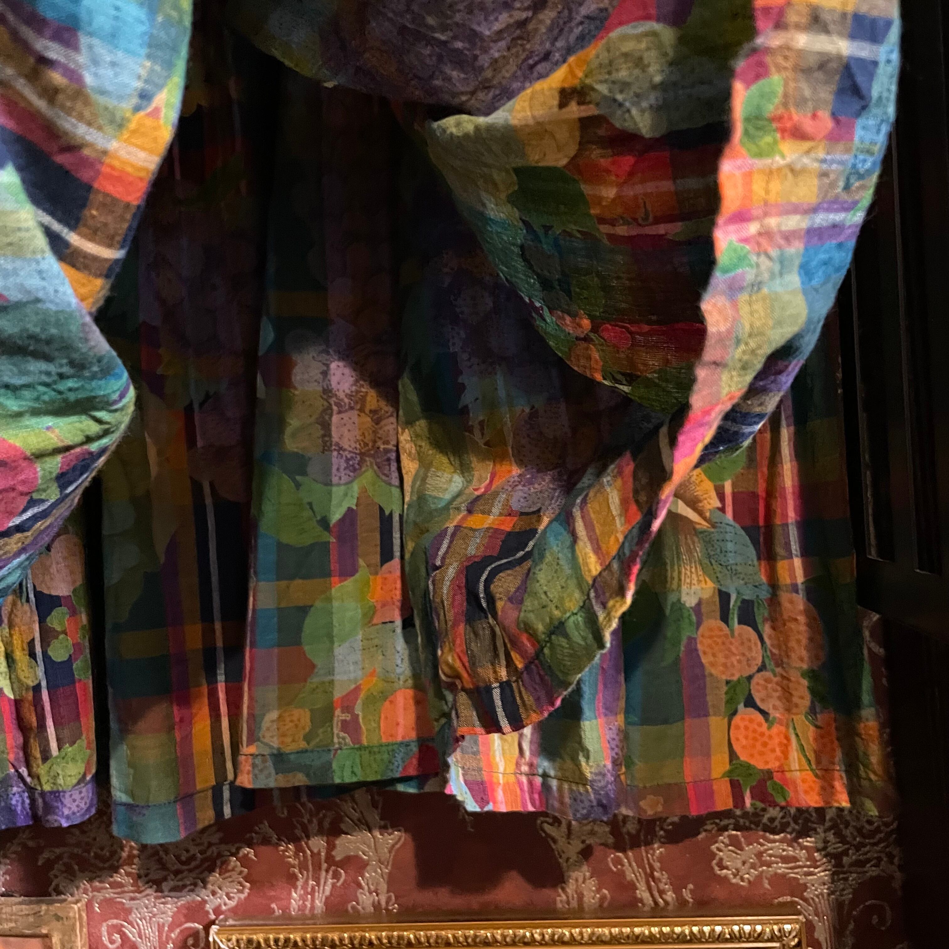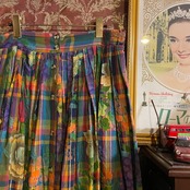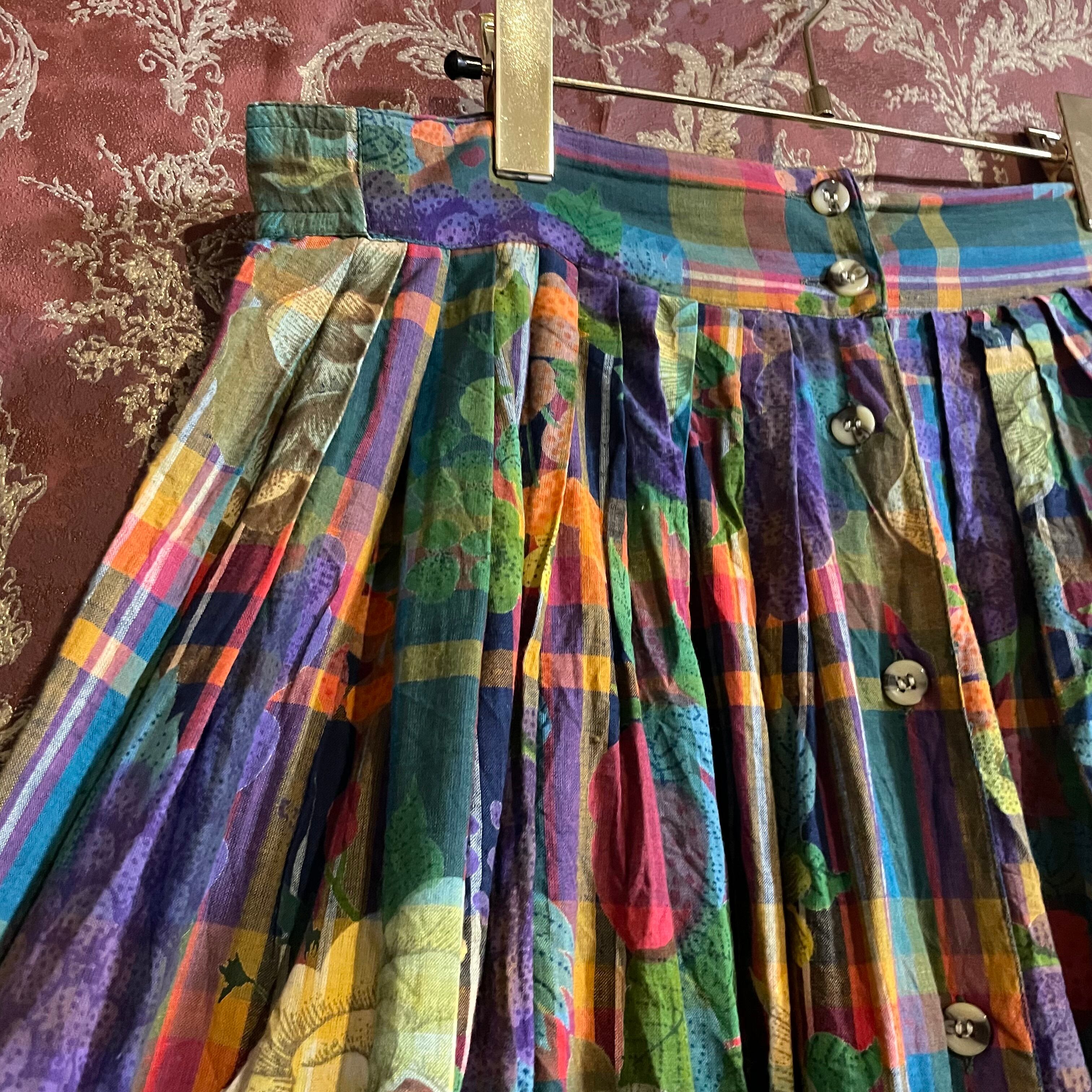 たくさんの色が使われたチェック柄と、花柄、フルーツ柄が美しく混ざりあったスカートです。