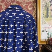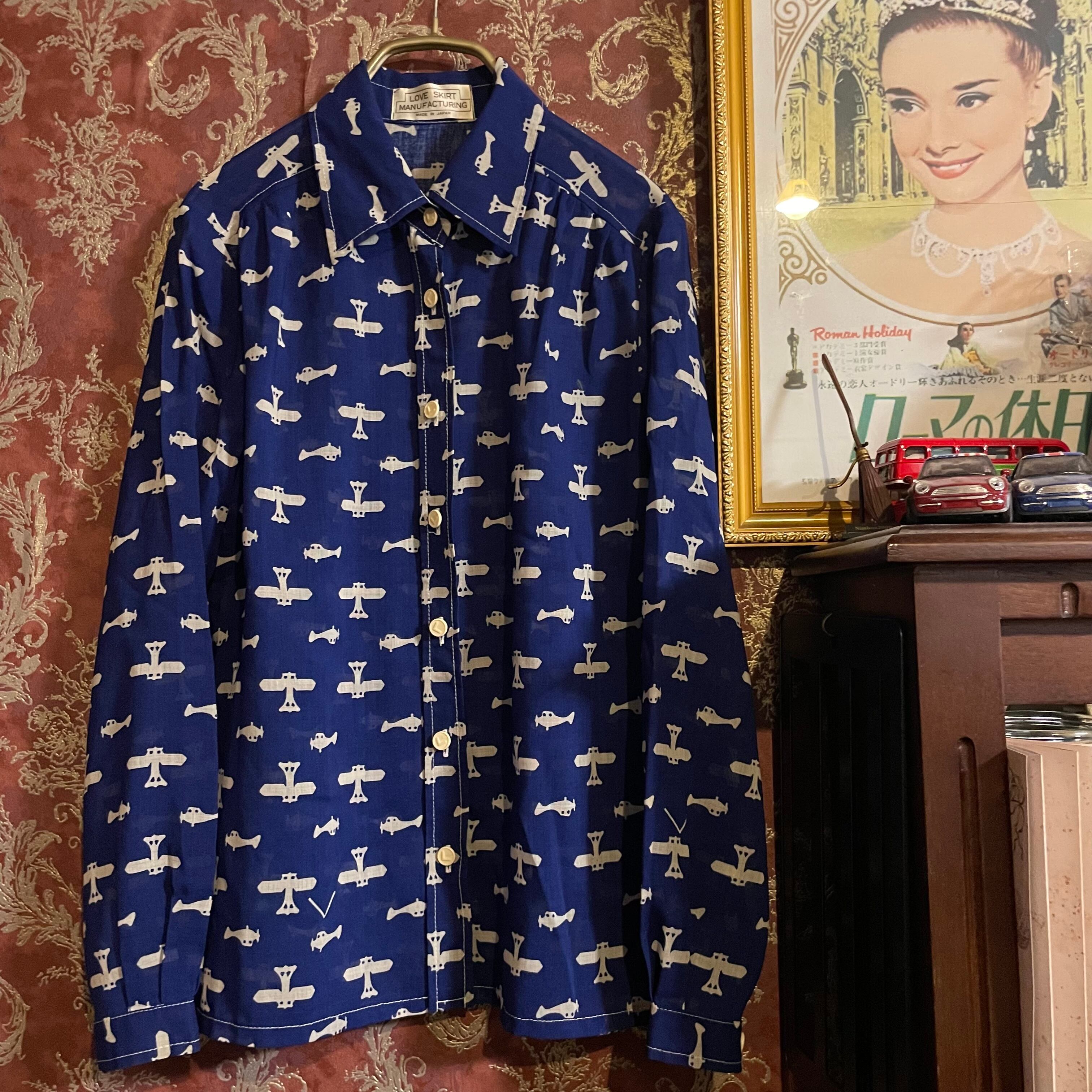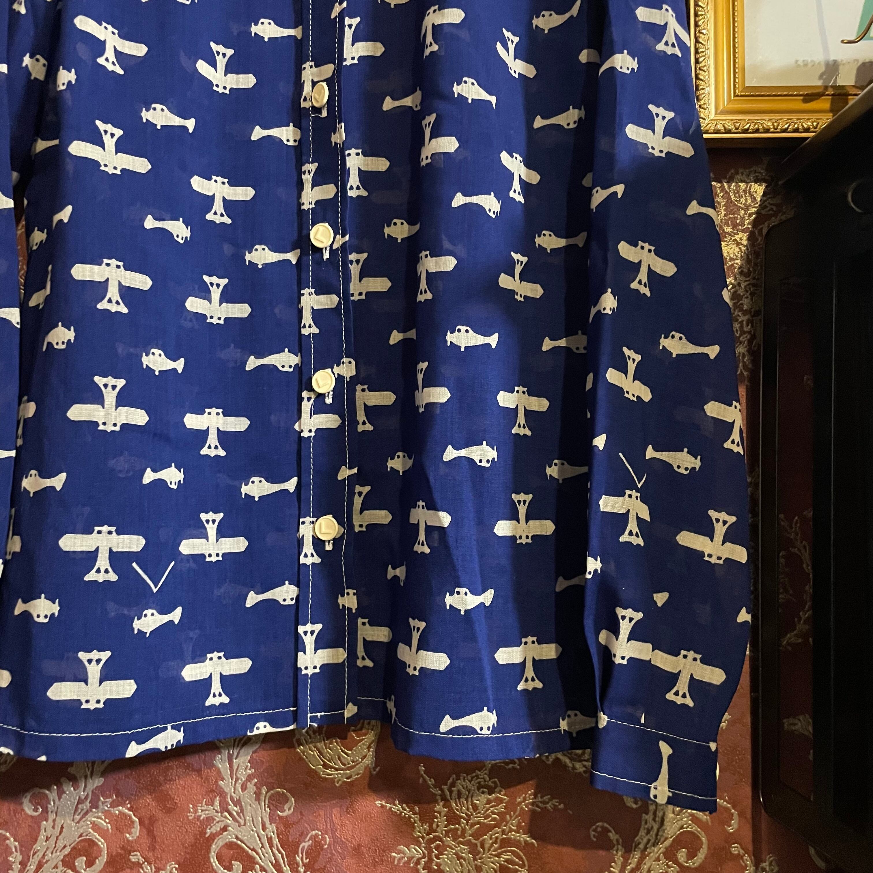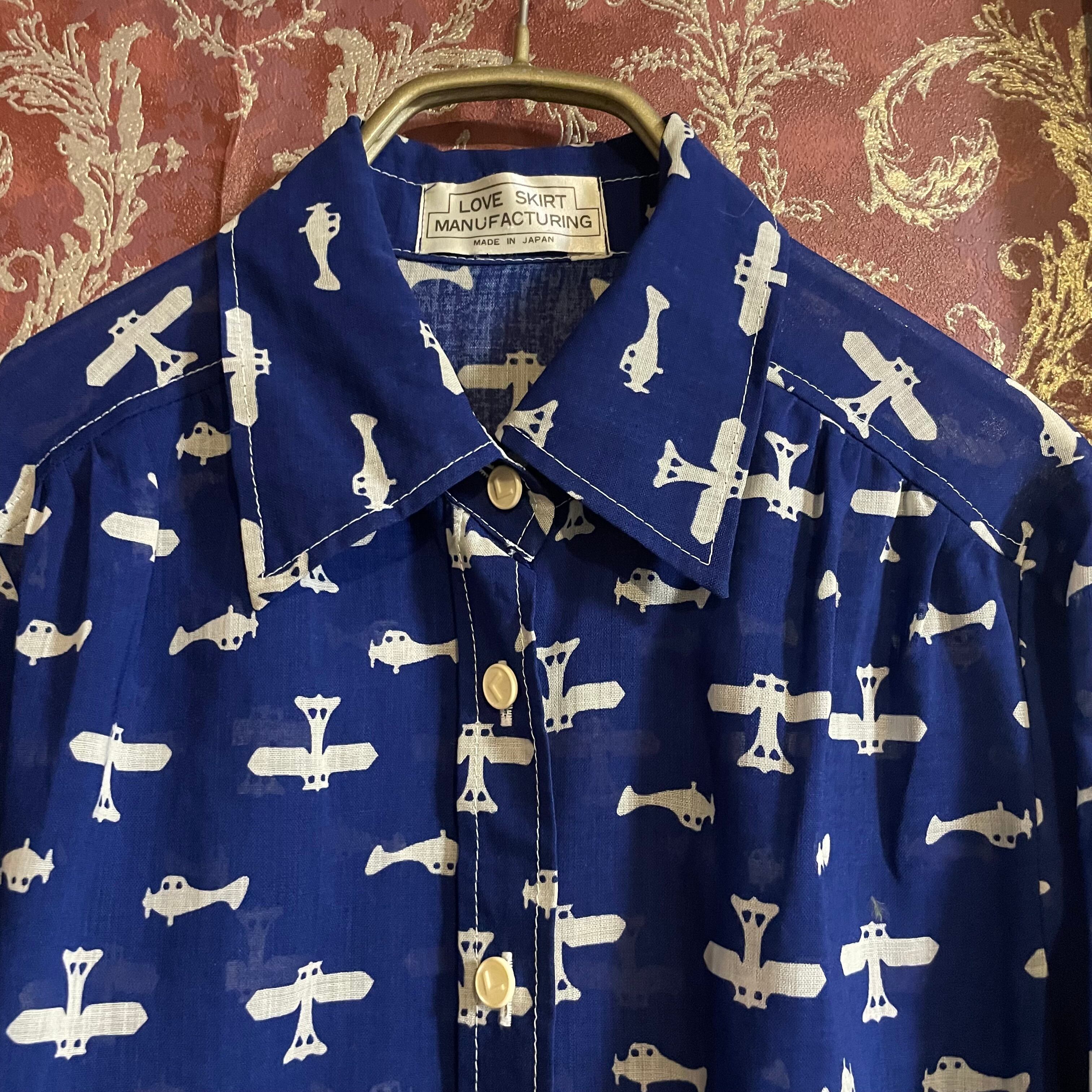 紺青をベースに白の飛行機柄がレトロなデザインのブラウスです。