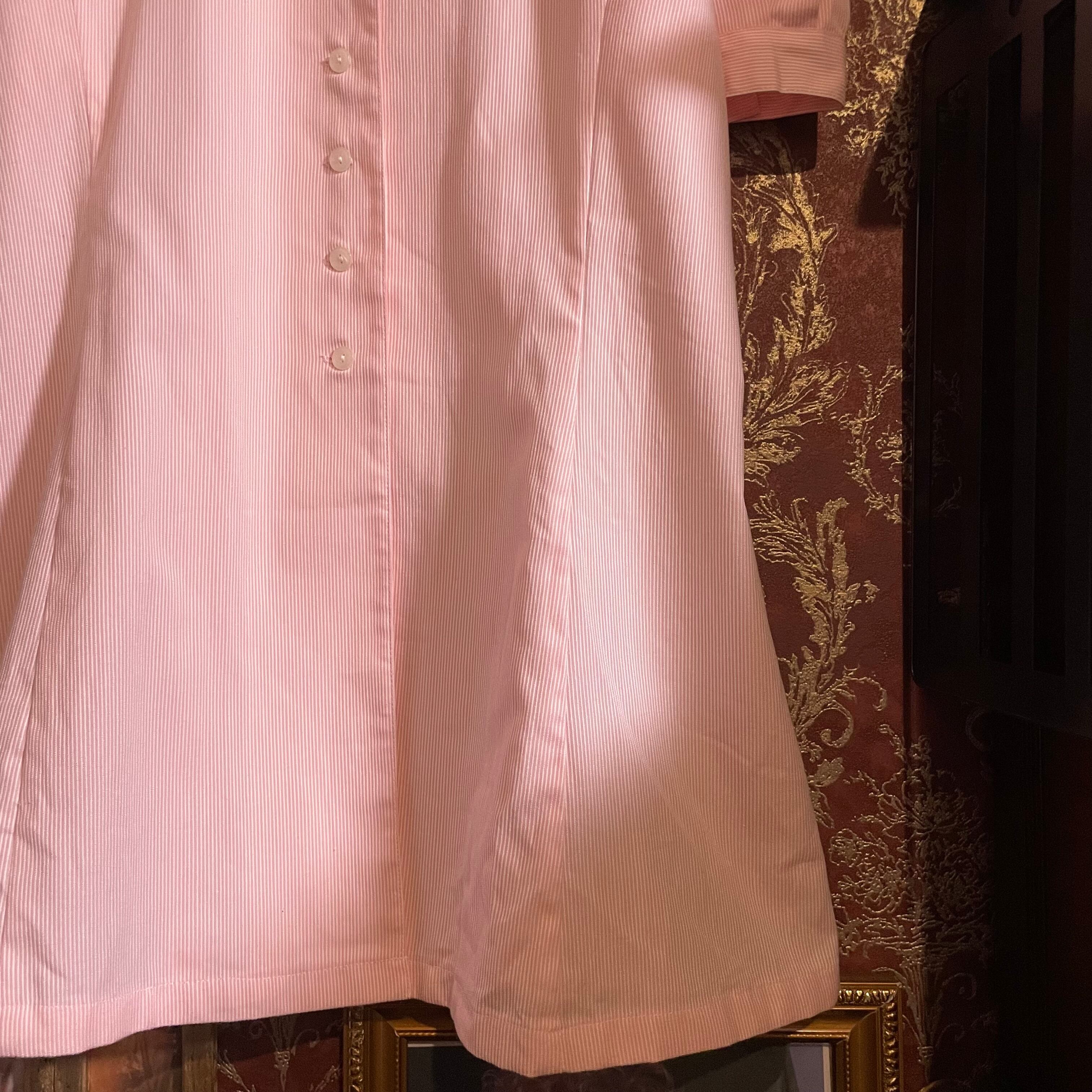 細かなピンストライプが女性らしさを引き立て、ウエスト背面のリボンがアクセントになっています。