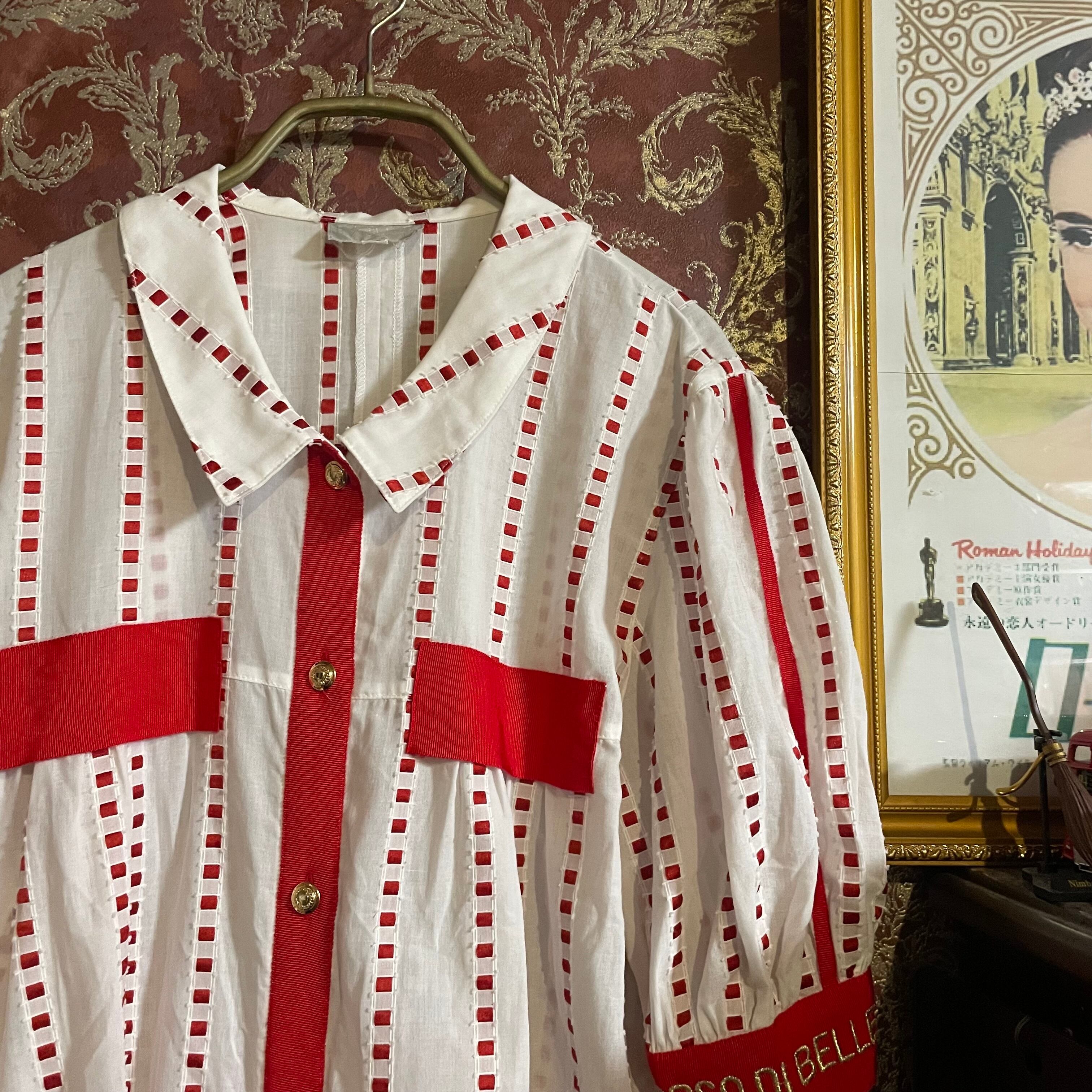 白をベースに、全体に赤のはしごリボンのようなデザインのブラウスです。