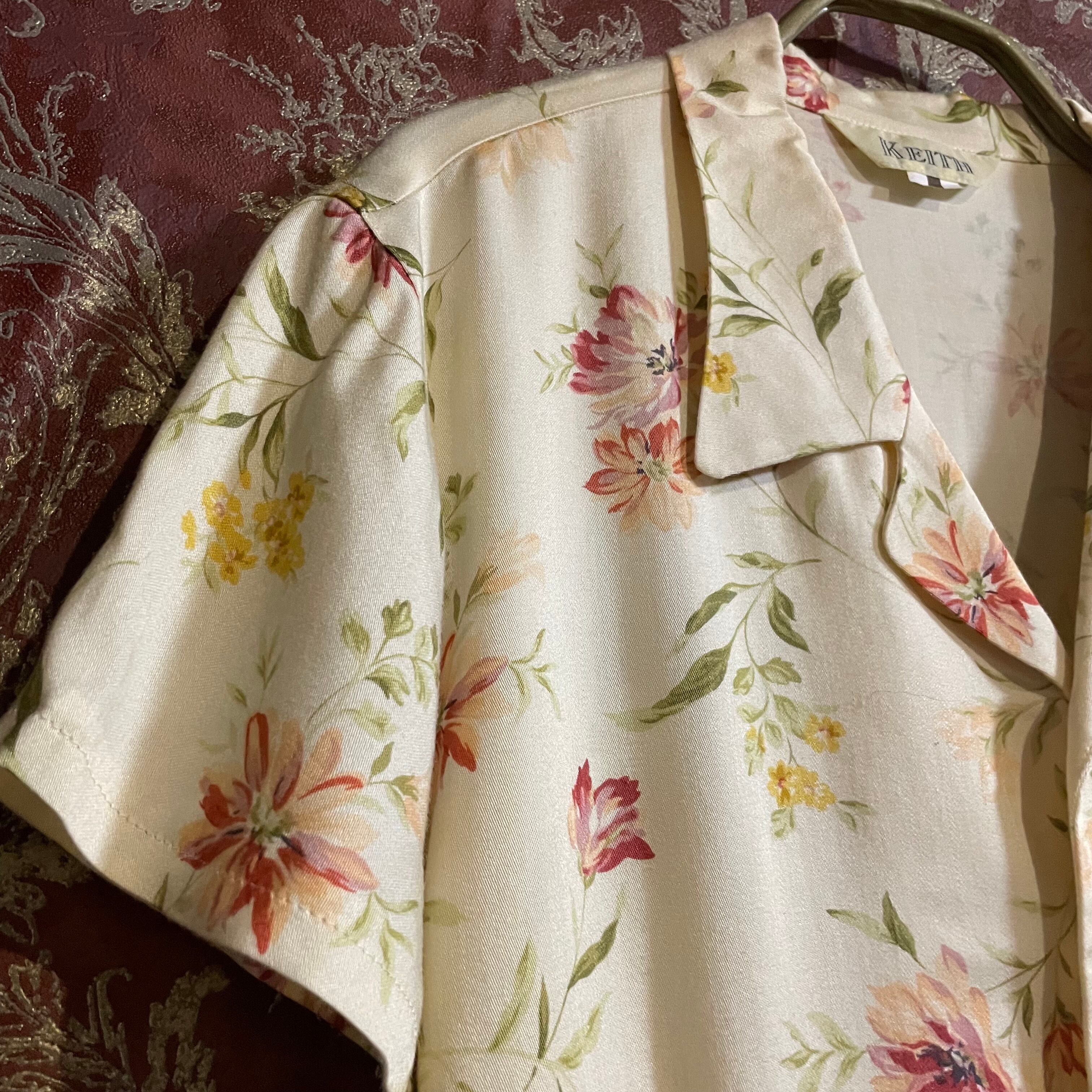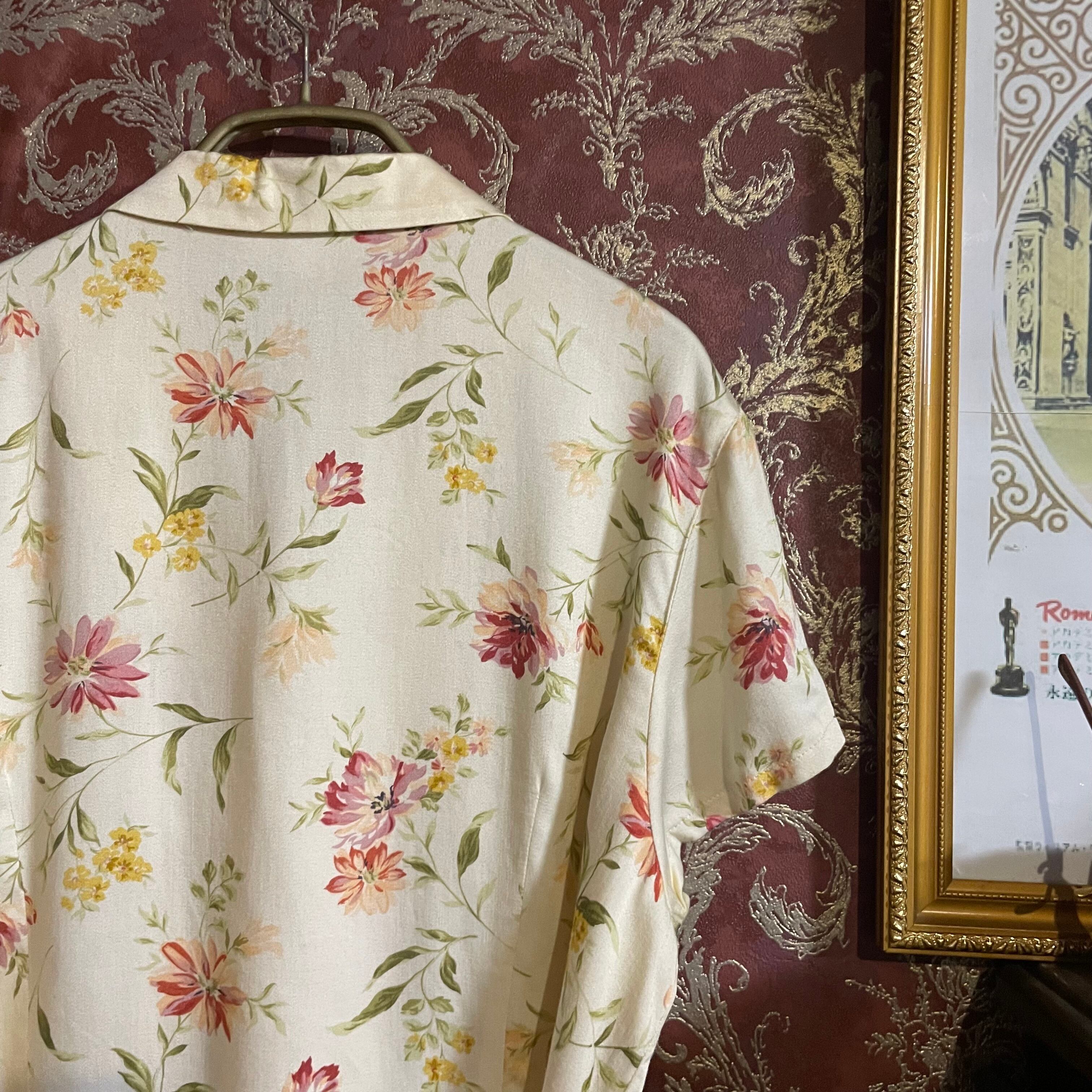 ベージュの上品な色合いに、リアルな花柄が描かれたブラウスです。