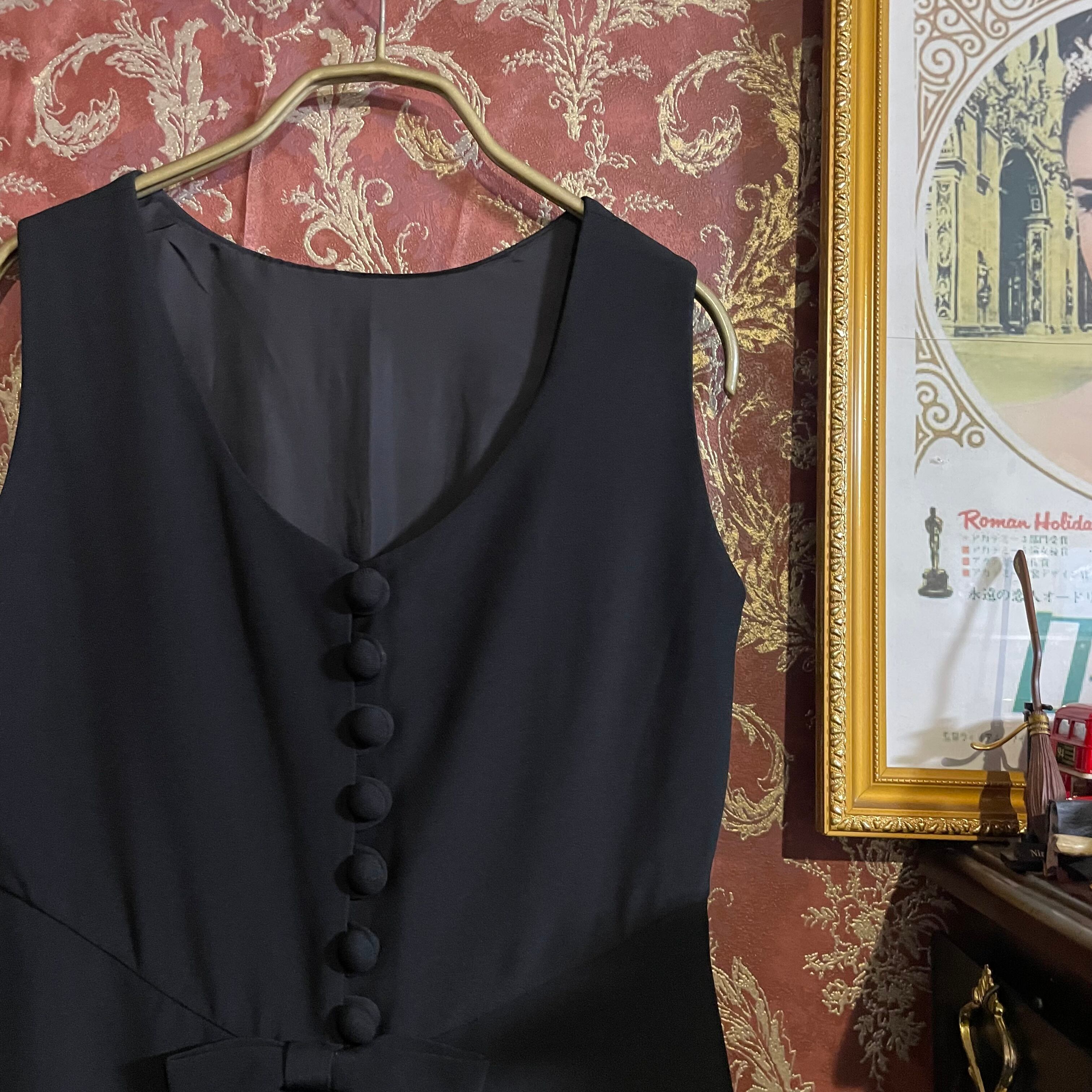 フロントはシンプルなデザインながら、背面にはボタンとリボンの装飾が施され、背中が大胆に開いています。