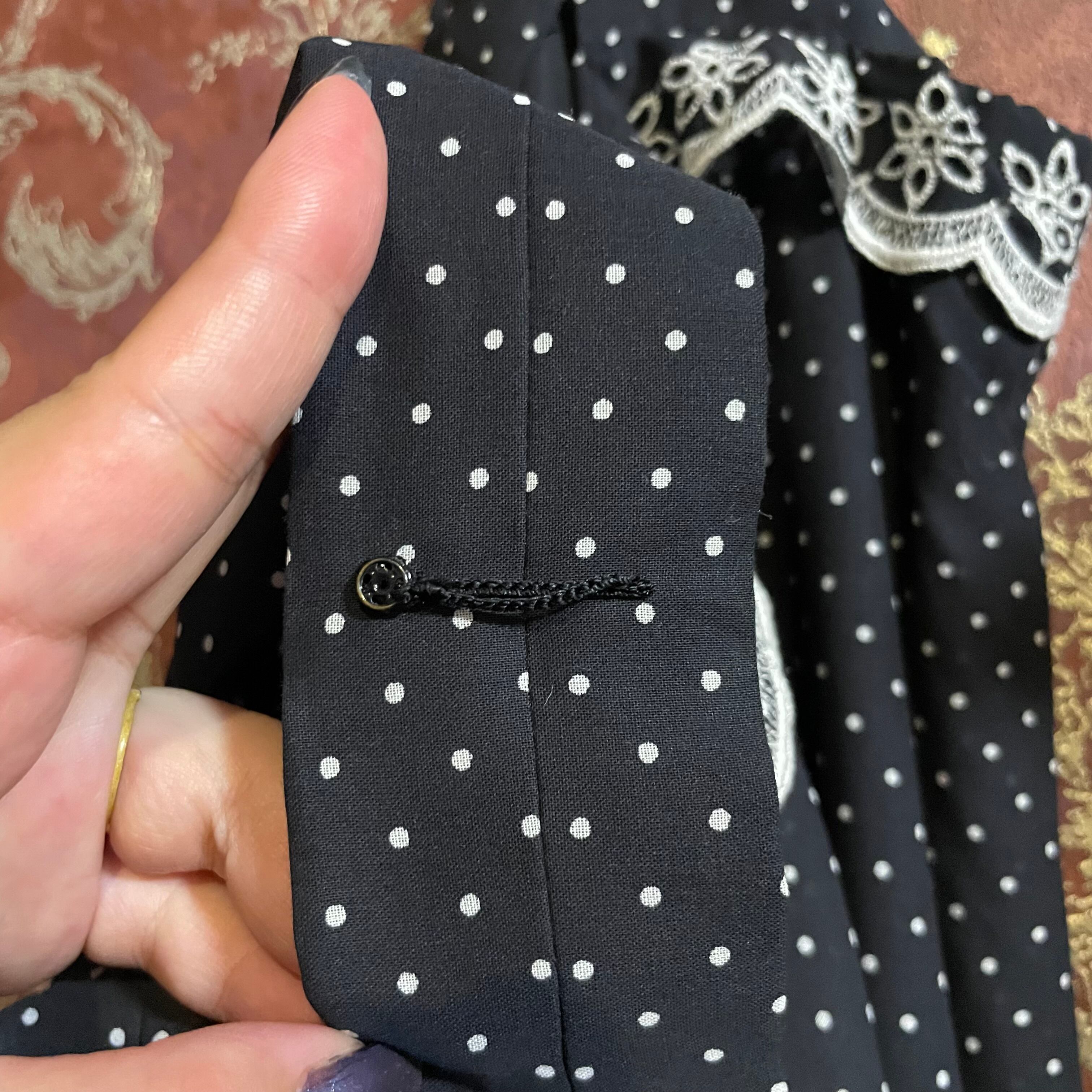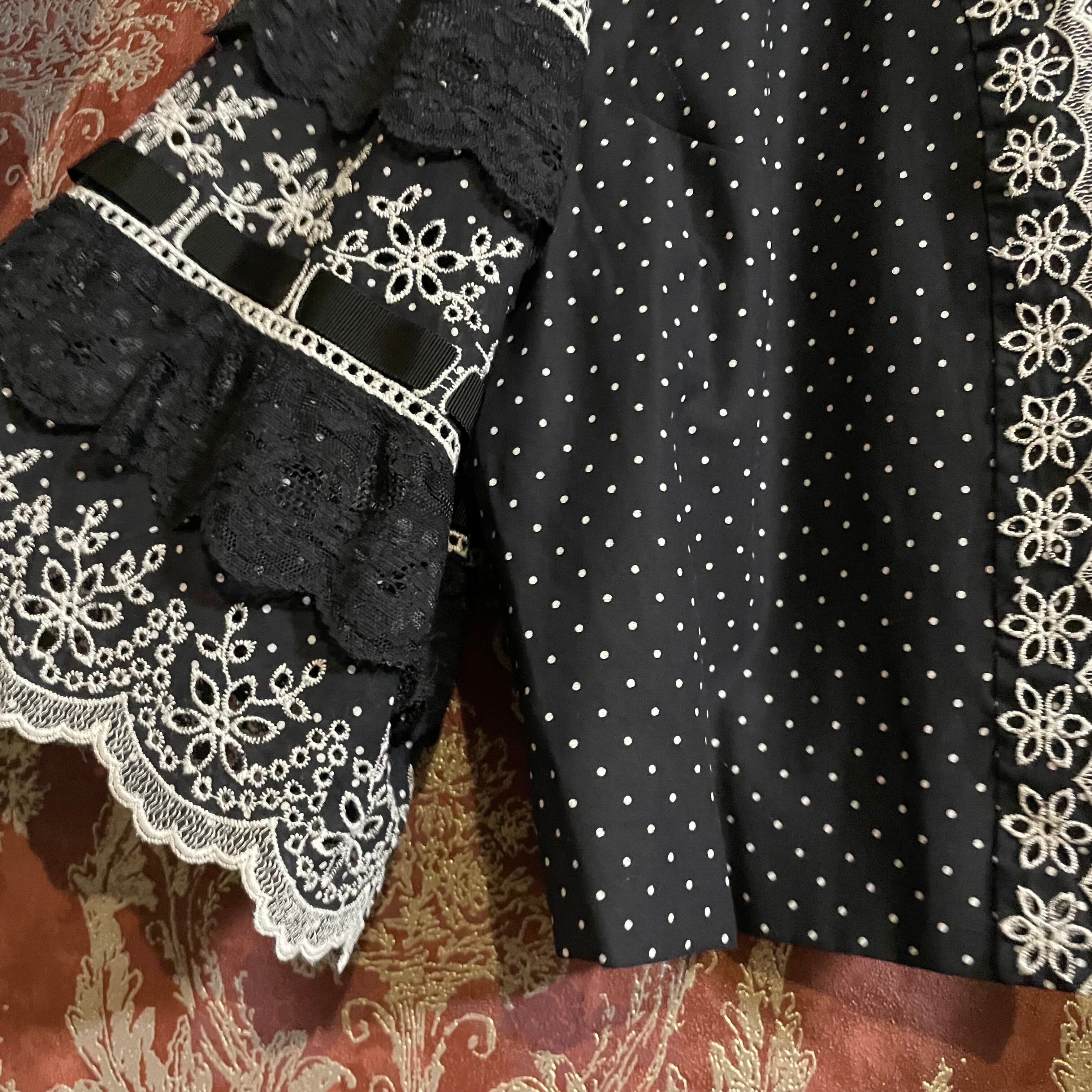 黒地に白のドット柄が目を引くワンピースと羽織りのアンサンブルです。