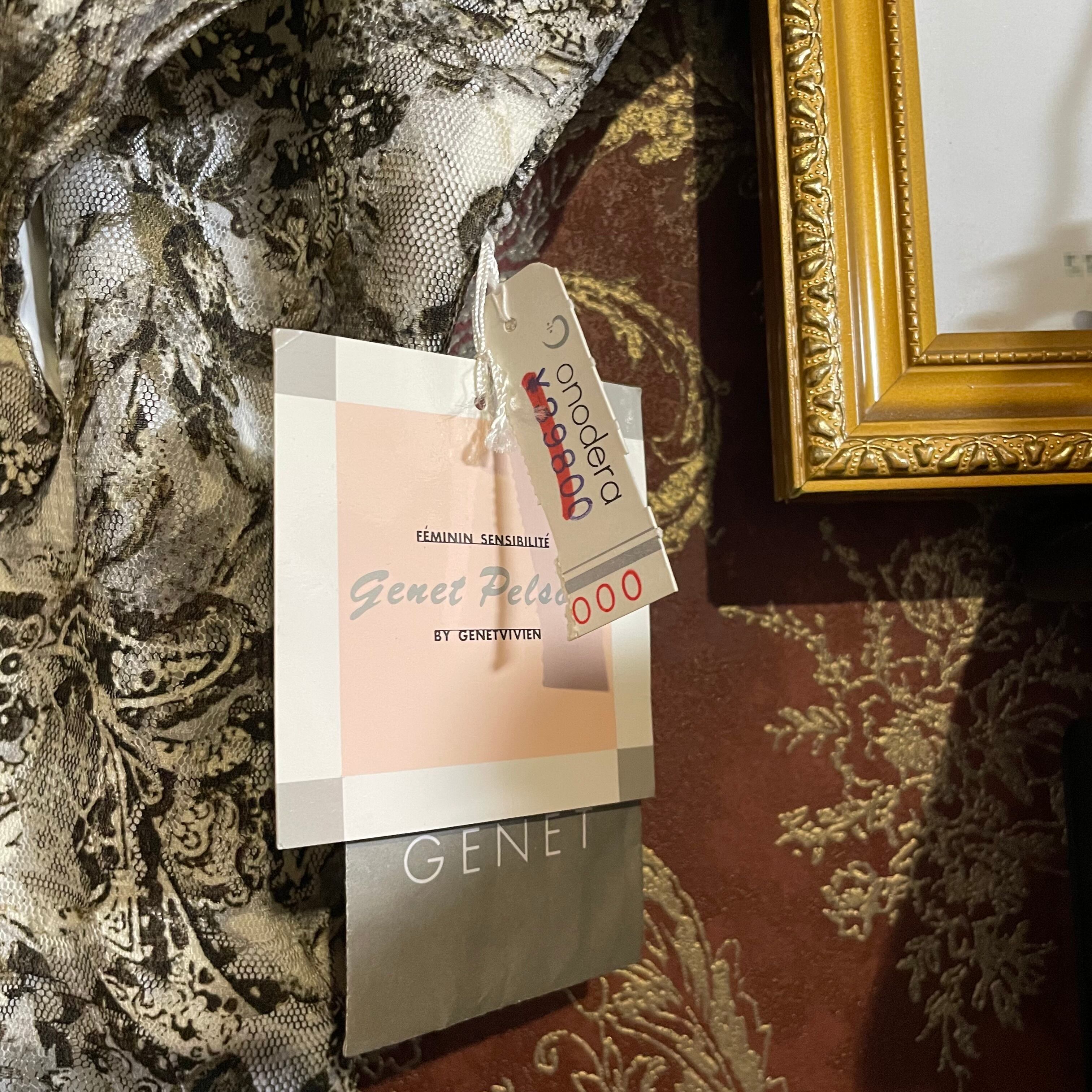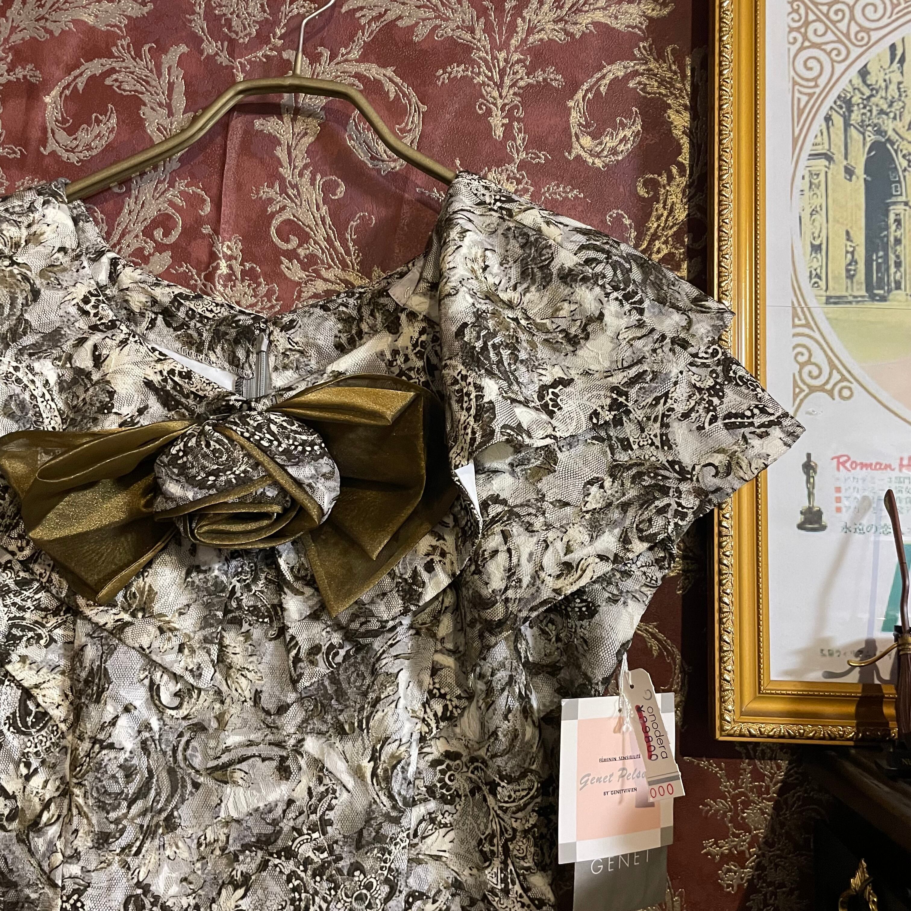 二重襟のようなデザインで、首元にエレガントな花モチーフが付いています。