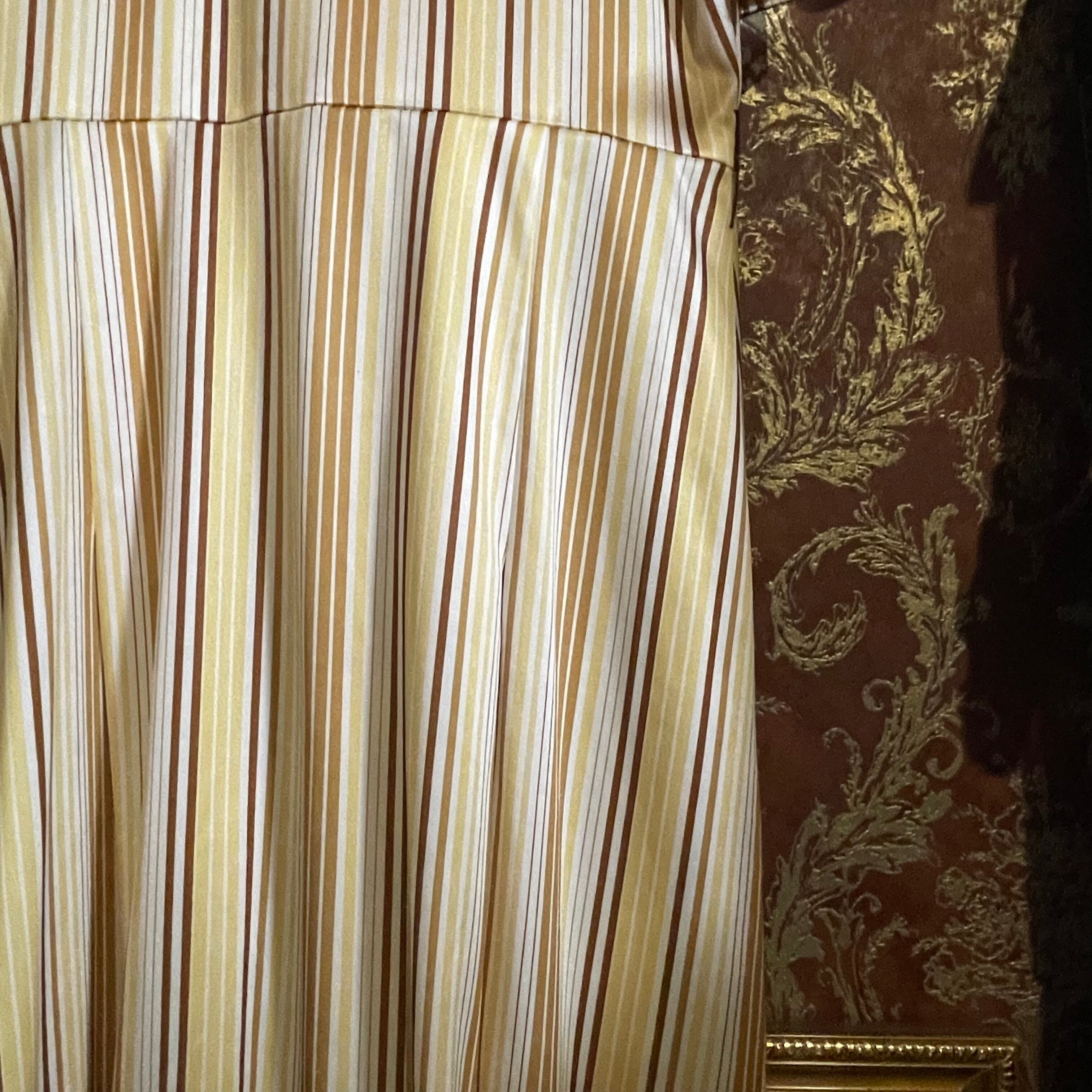 白をベースに茶色やベージュ、黄色のストライプ柄のヴィンテージ感満載のアイテムとなっています。