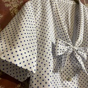 白をベースに青いドット柄が華やかな、ボウタイブラウスです。