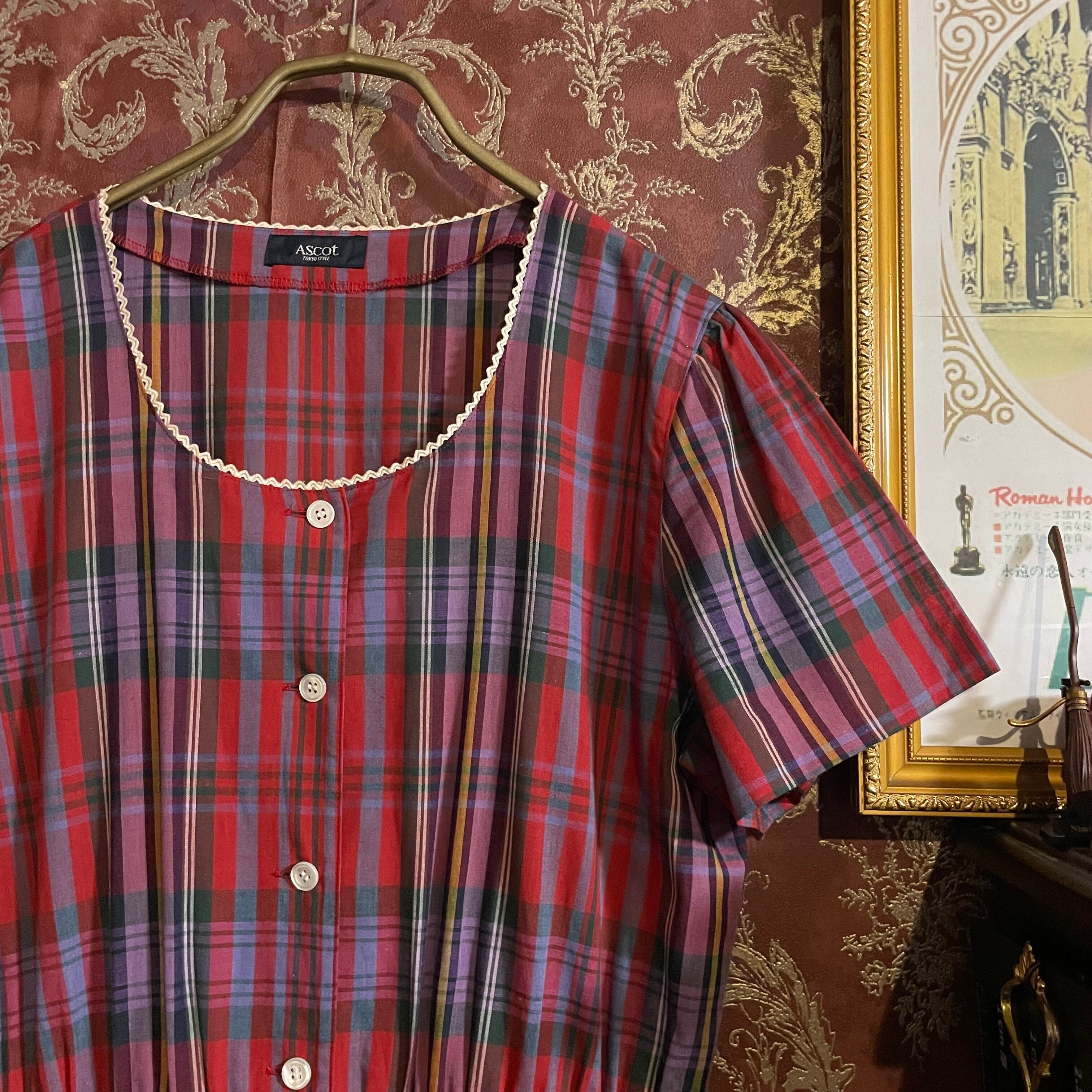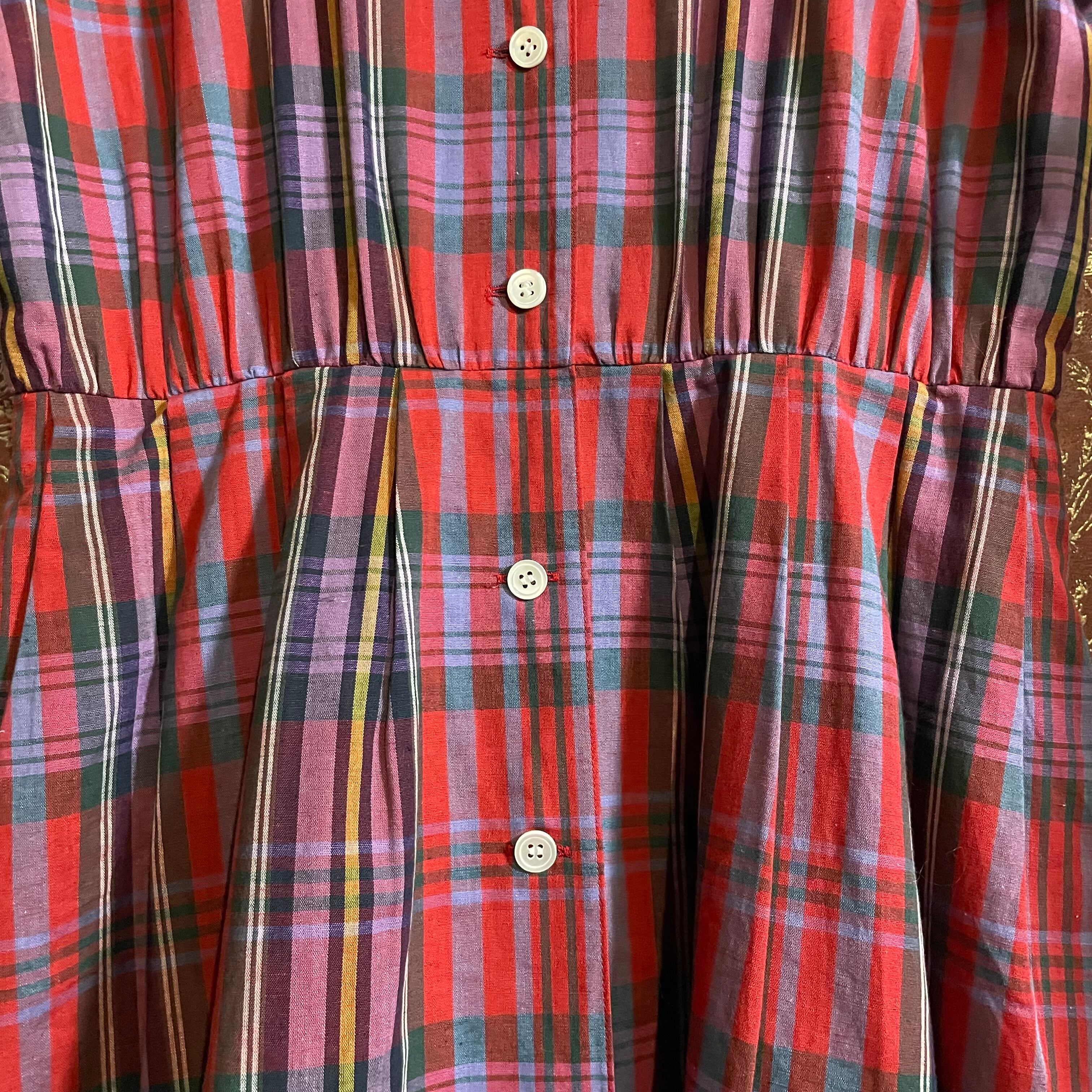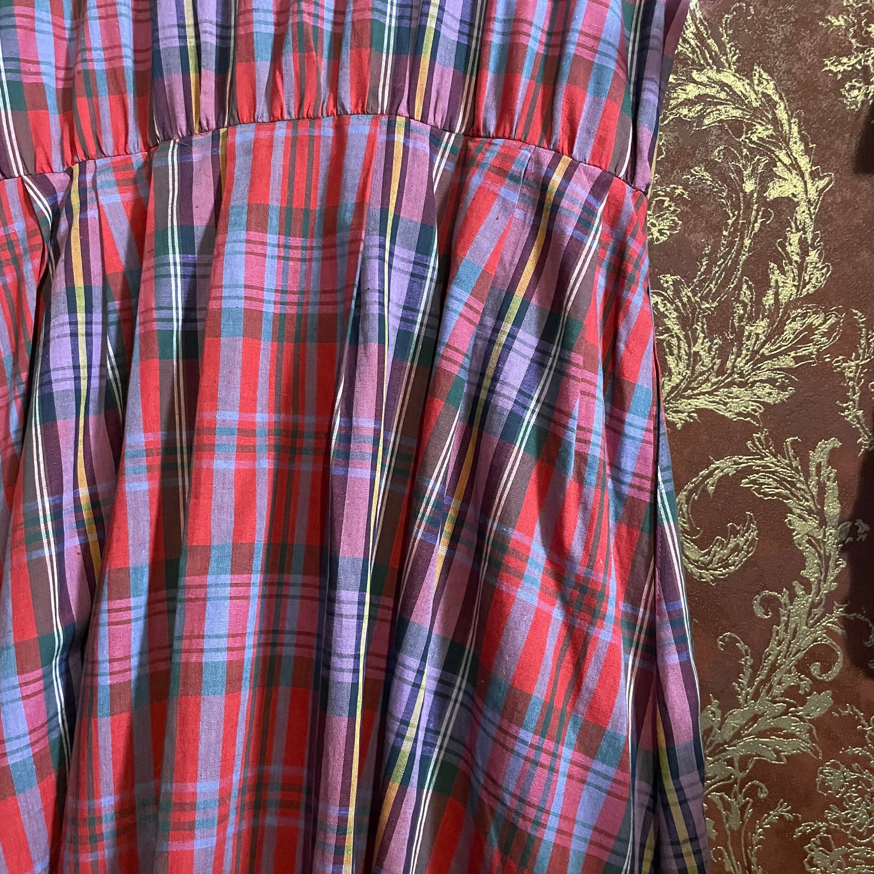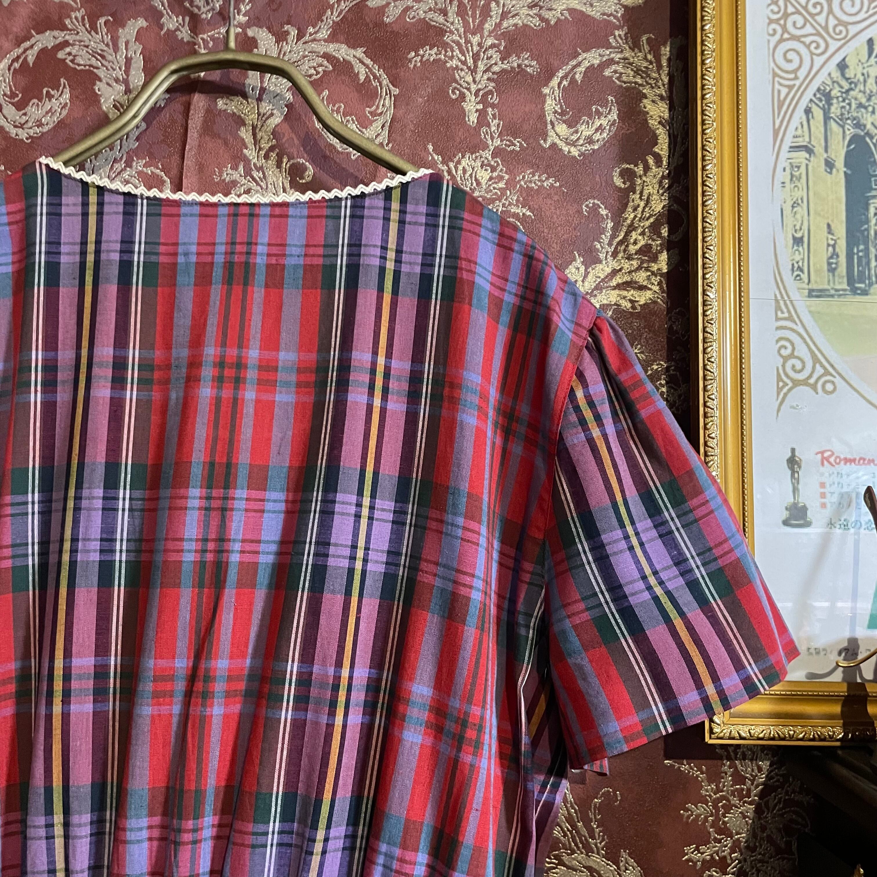 赤、紫、黄、緑など様々なカラーのチェック柄が目を引くワンピースです。