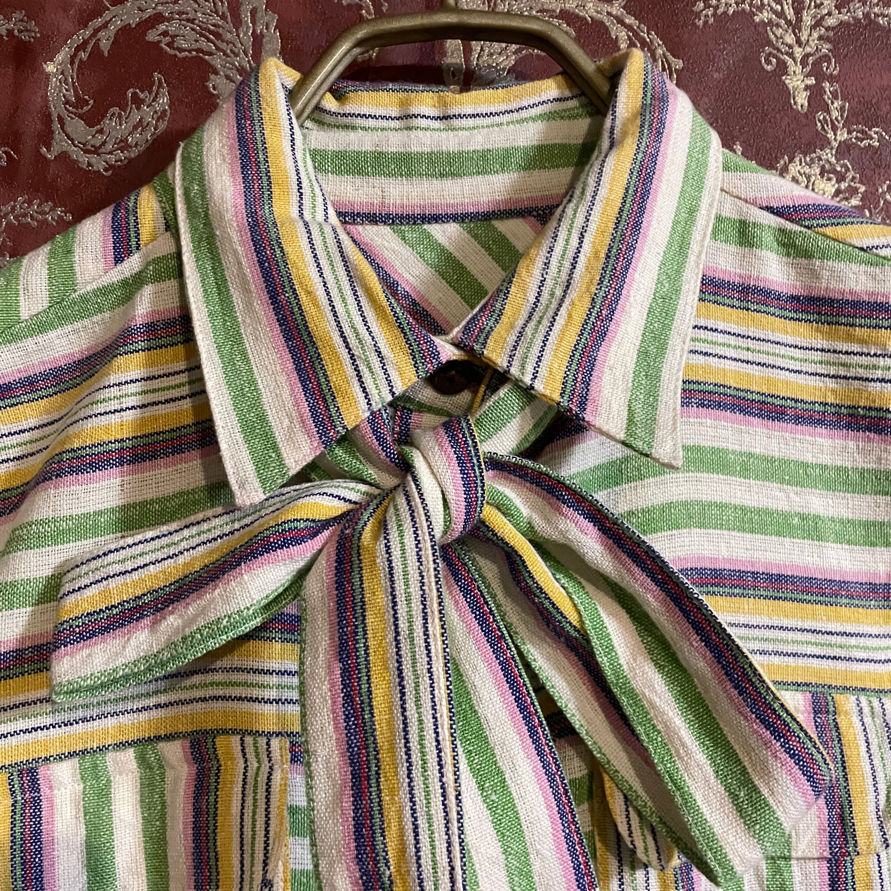 白地に様々な色のストライプが施されたデザインは、明るく華やかな印象を与えます。