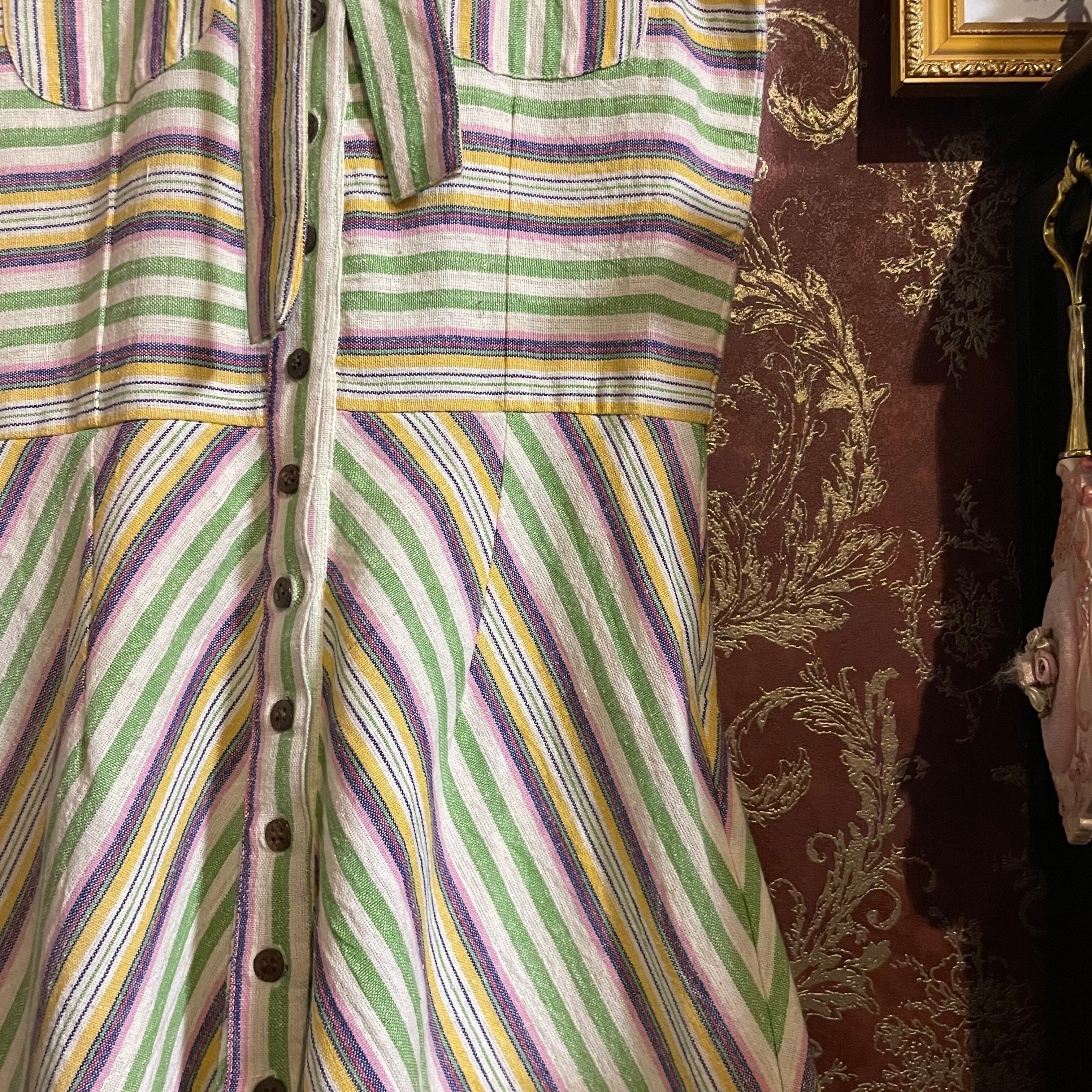 カラフルなマルチストライプが目を引く、夏にぴったりのワンピースです。