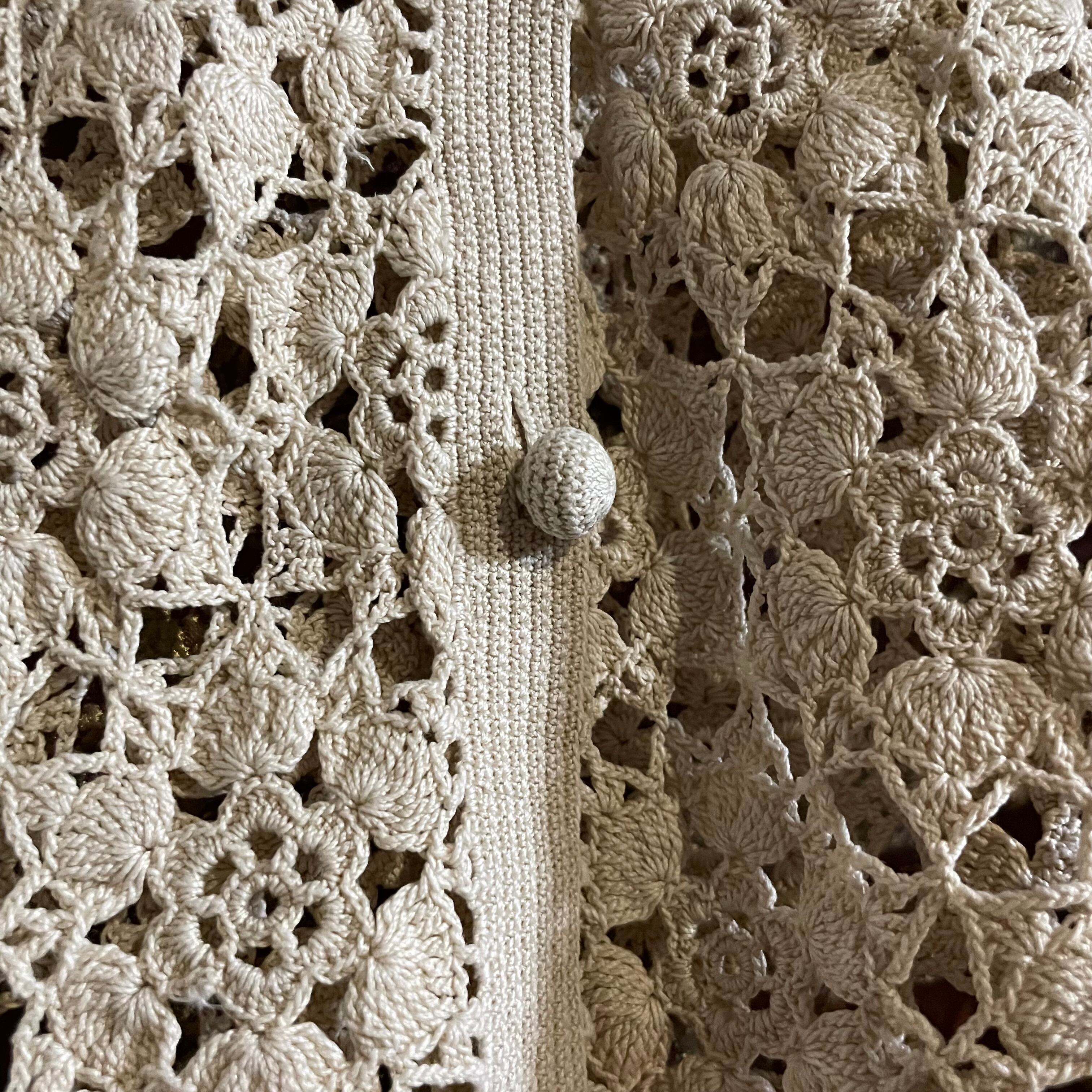 アイボリーの細い糸で丁寧に編まれていて、手編みならではのしっかりとした質感です。