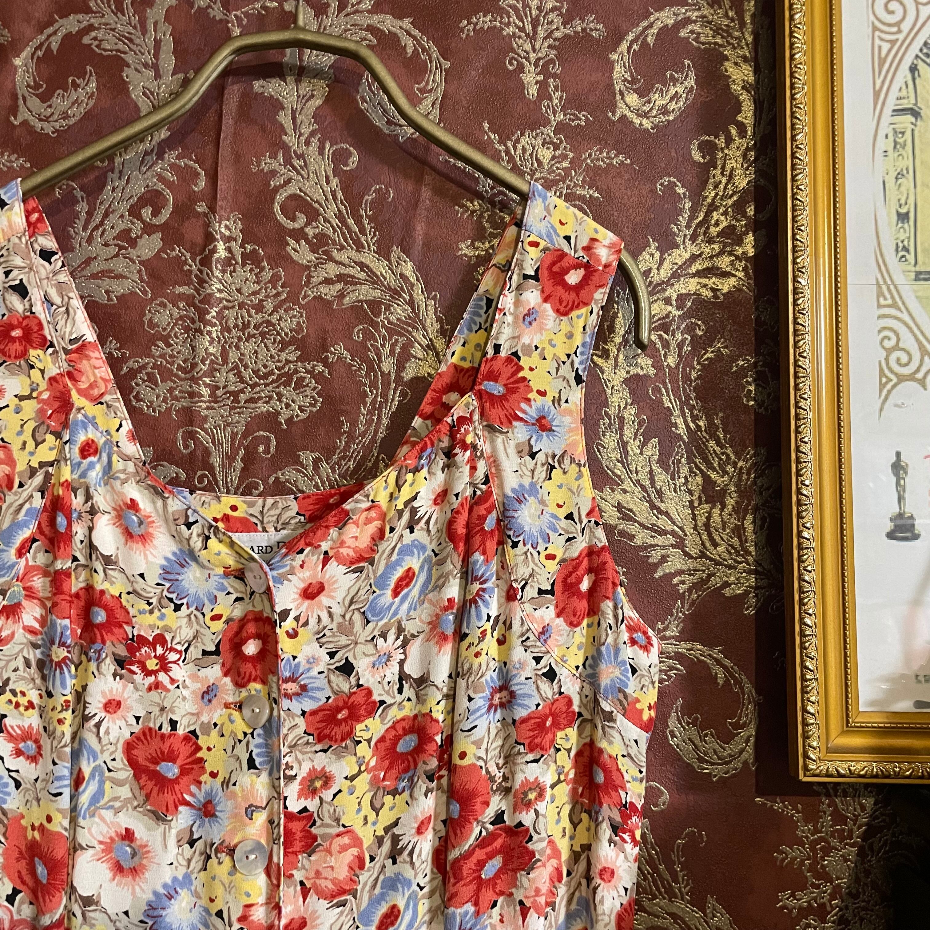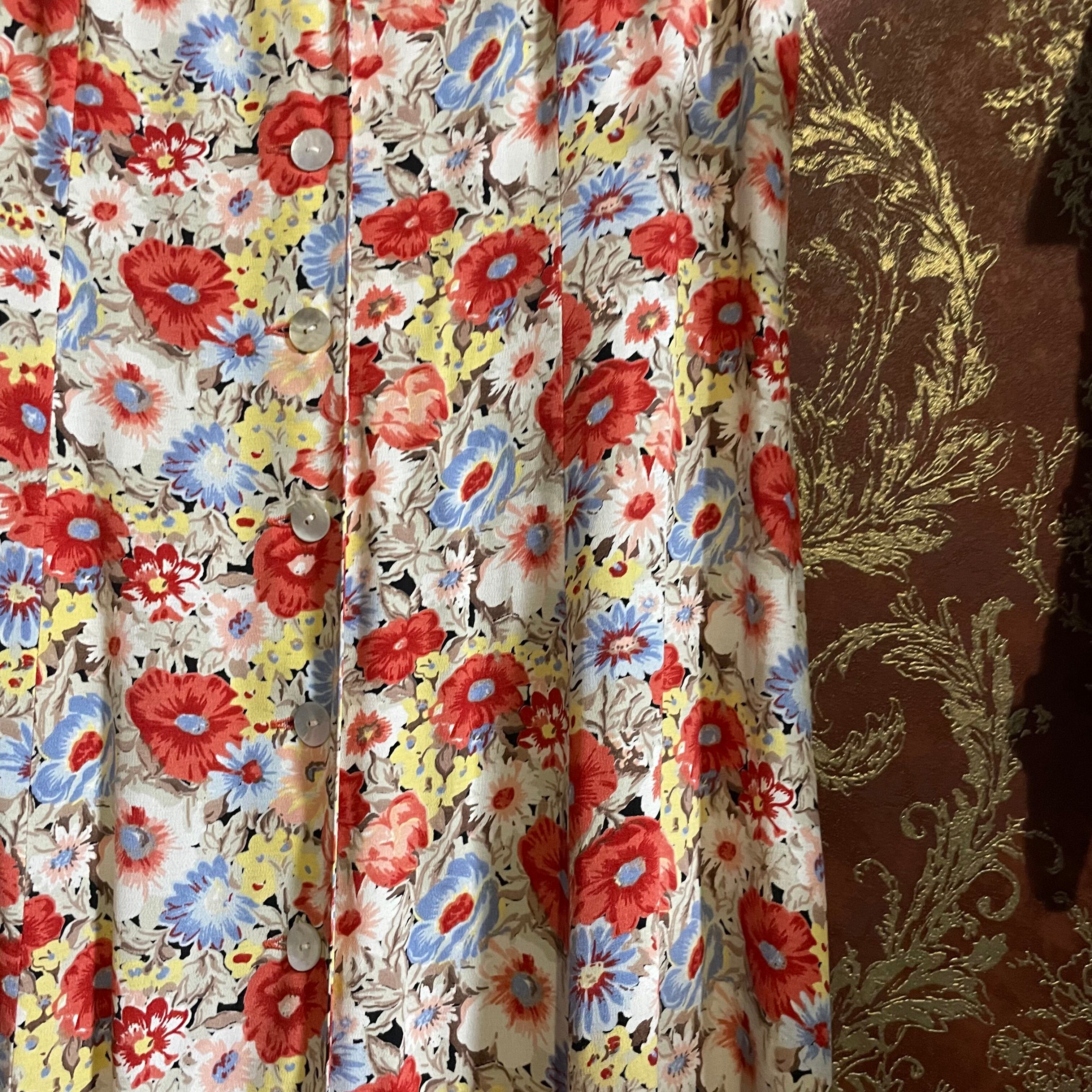 赤、黄、ピンク、水色の花柄ワンピースです。