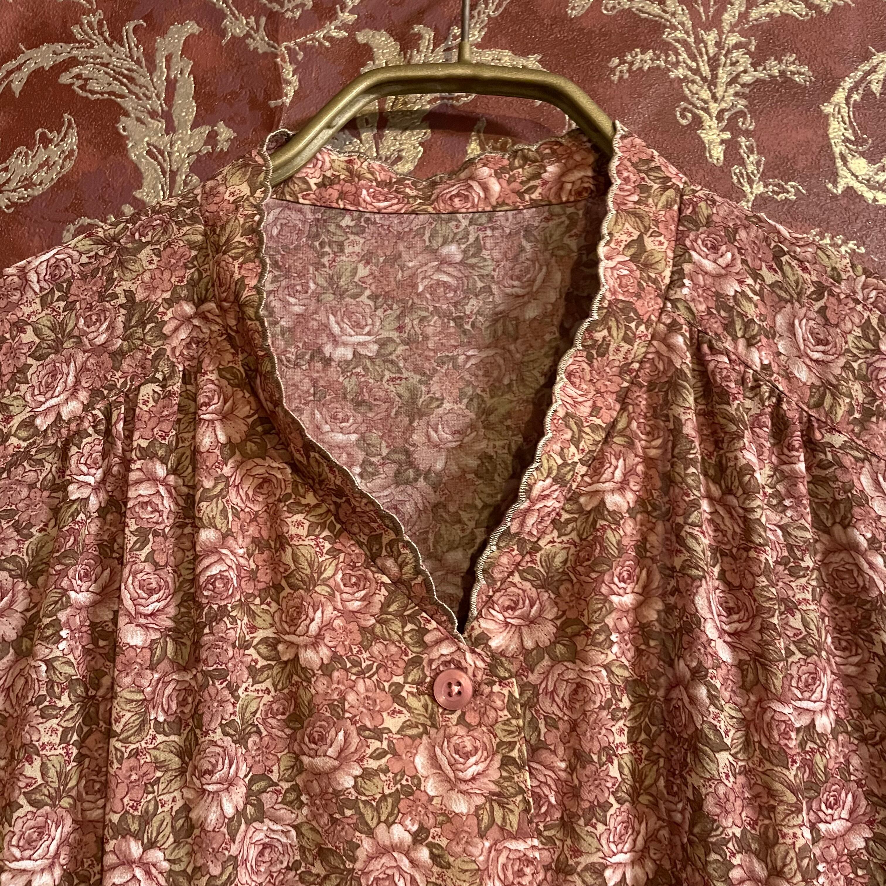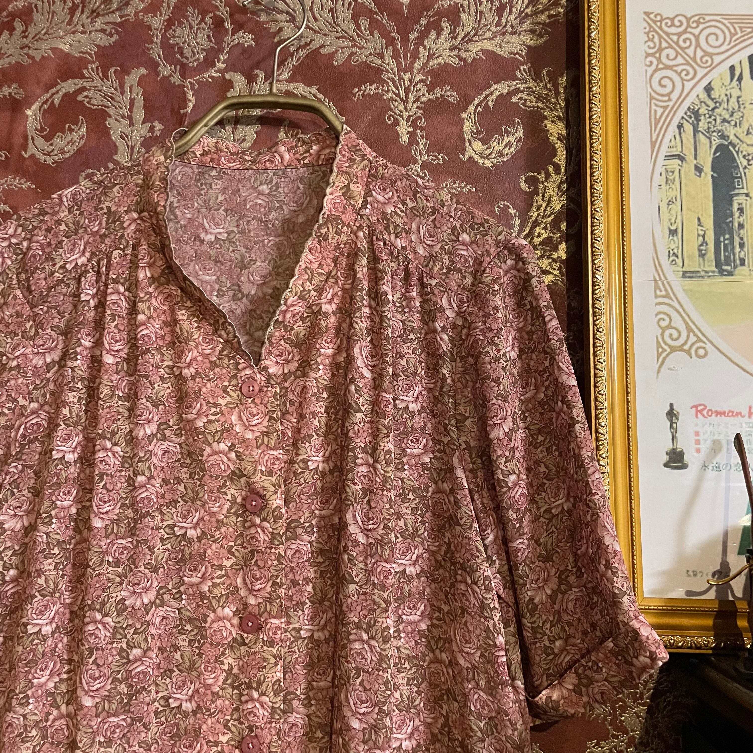 全体はピンクのバラと、セピアのようなくすんだ緑の葉柄の生地で作られています。