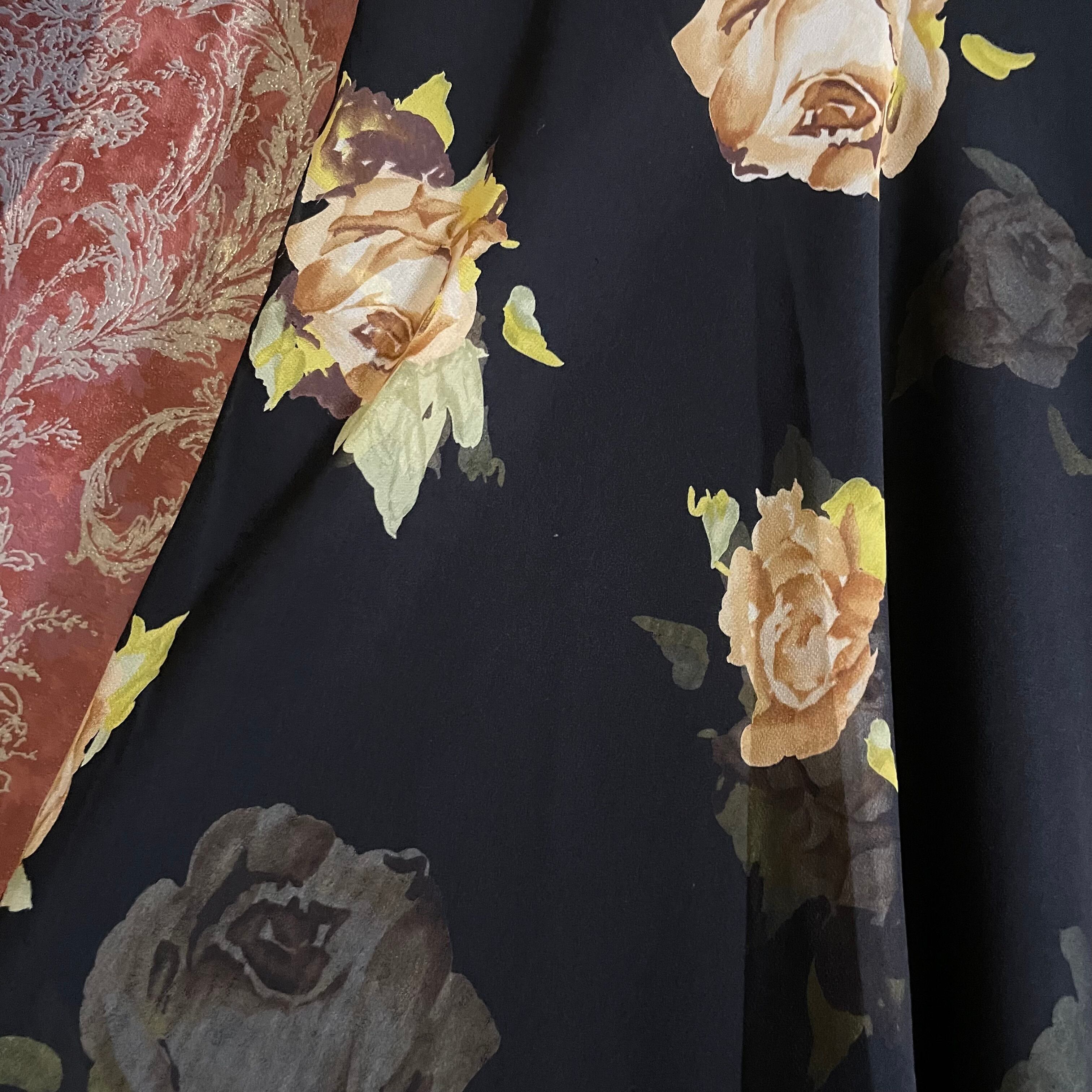 生地はシフォン素材の柔らかな質感で、二重のバラ柄が透けていて奥行きのあるデザインです。
