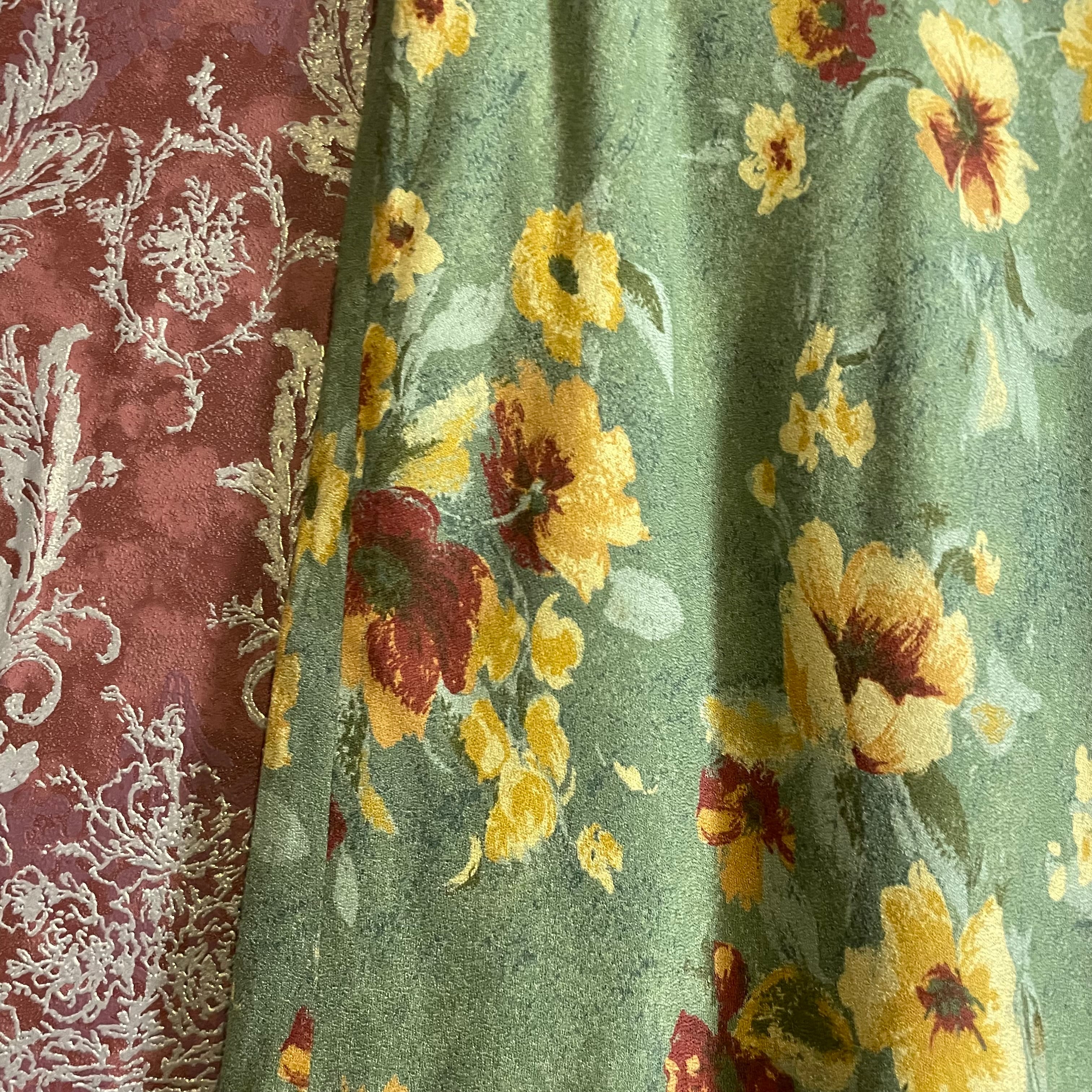 枝豆色をベースに、油絵のようなタッチの黄色い花柄が鮮やかな一枚です。