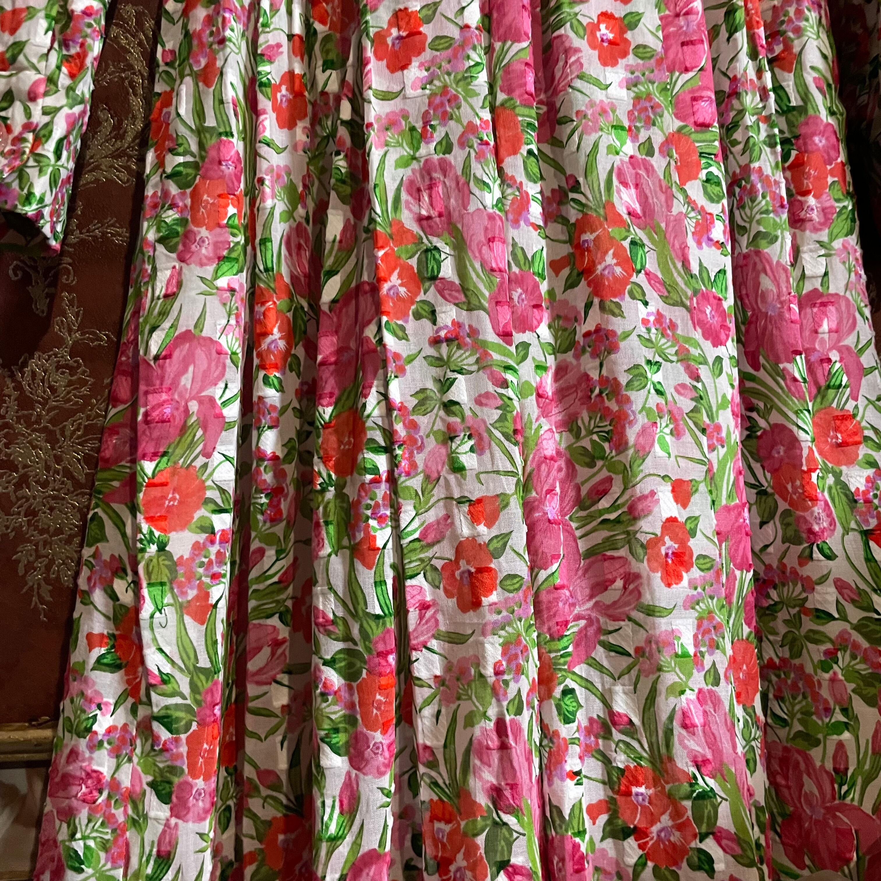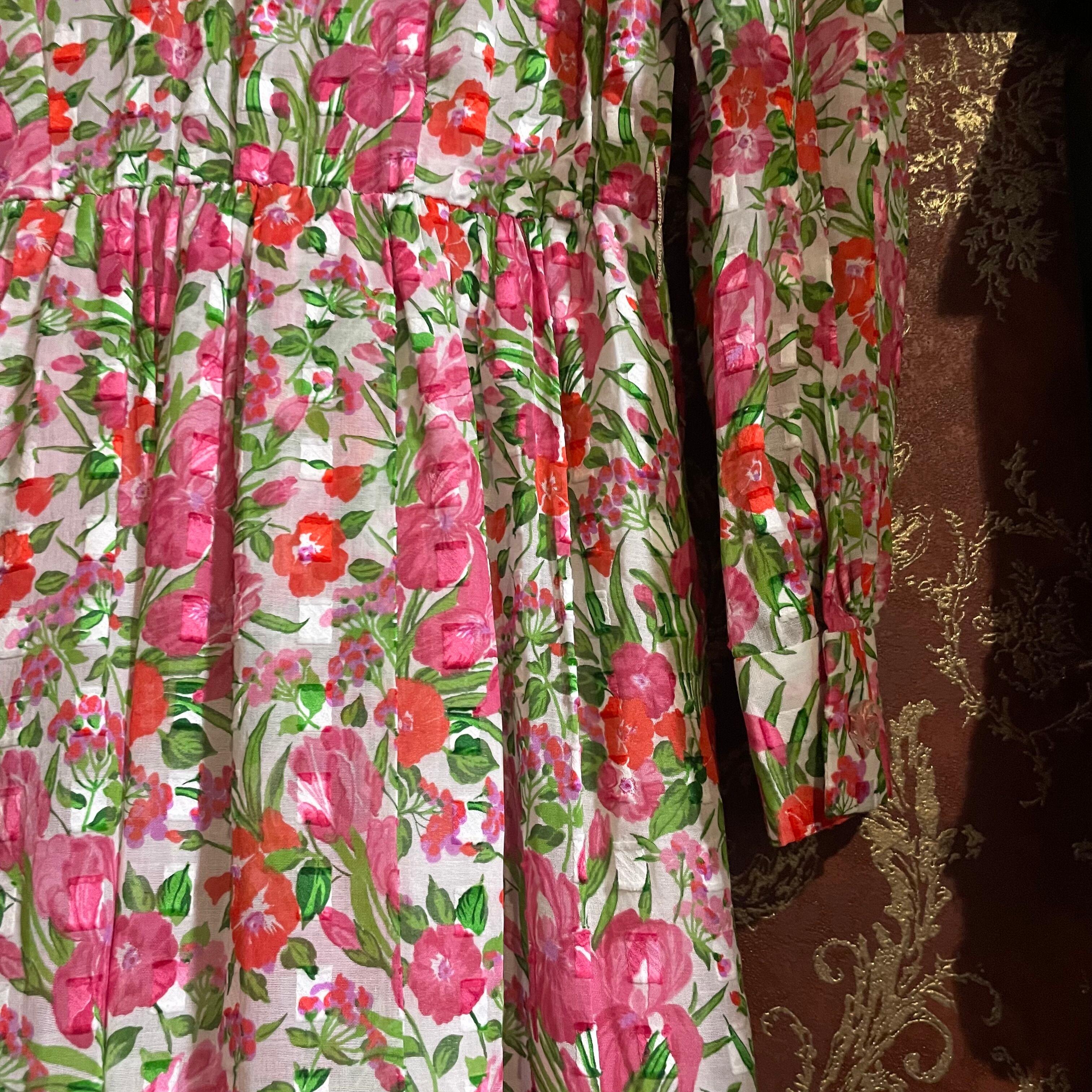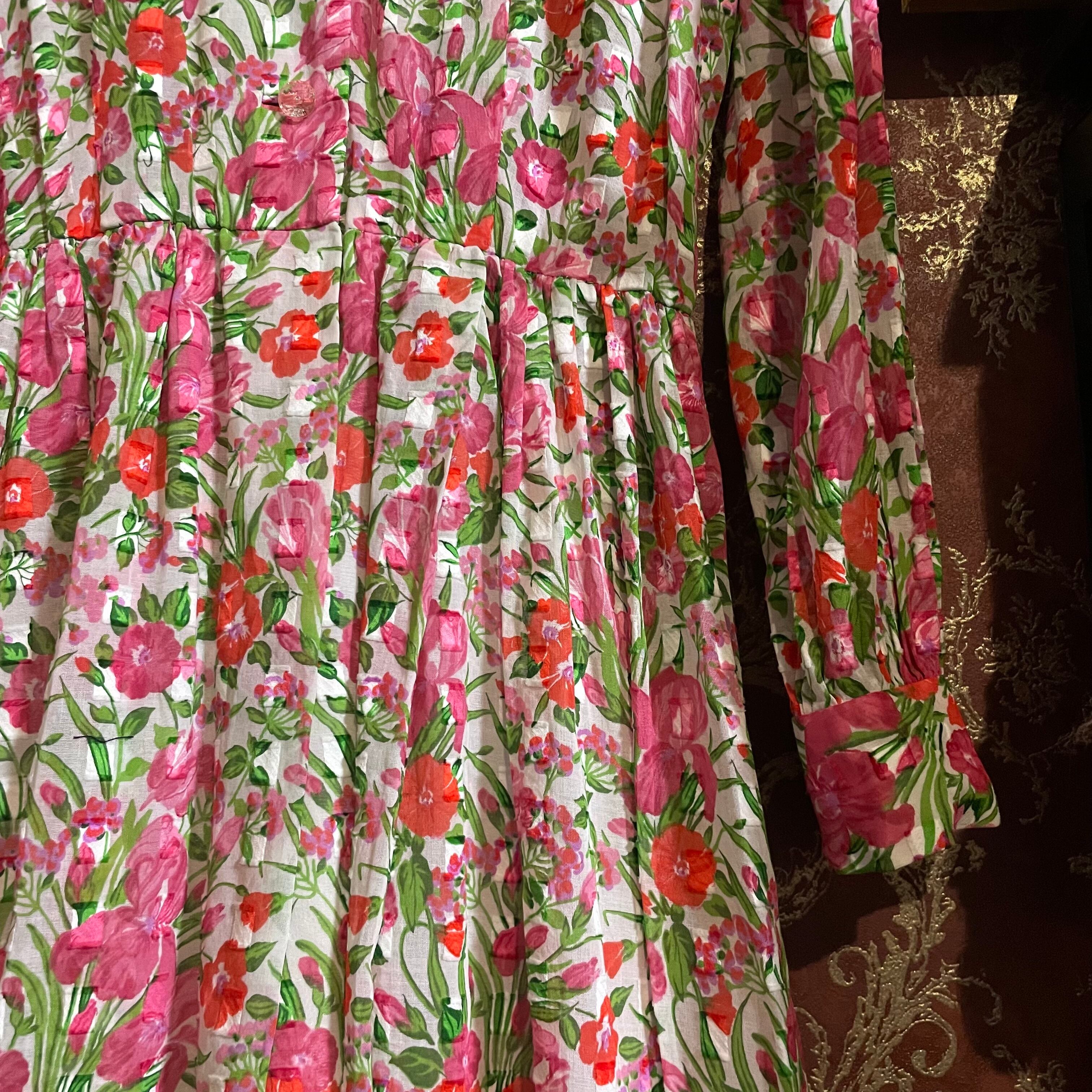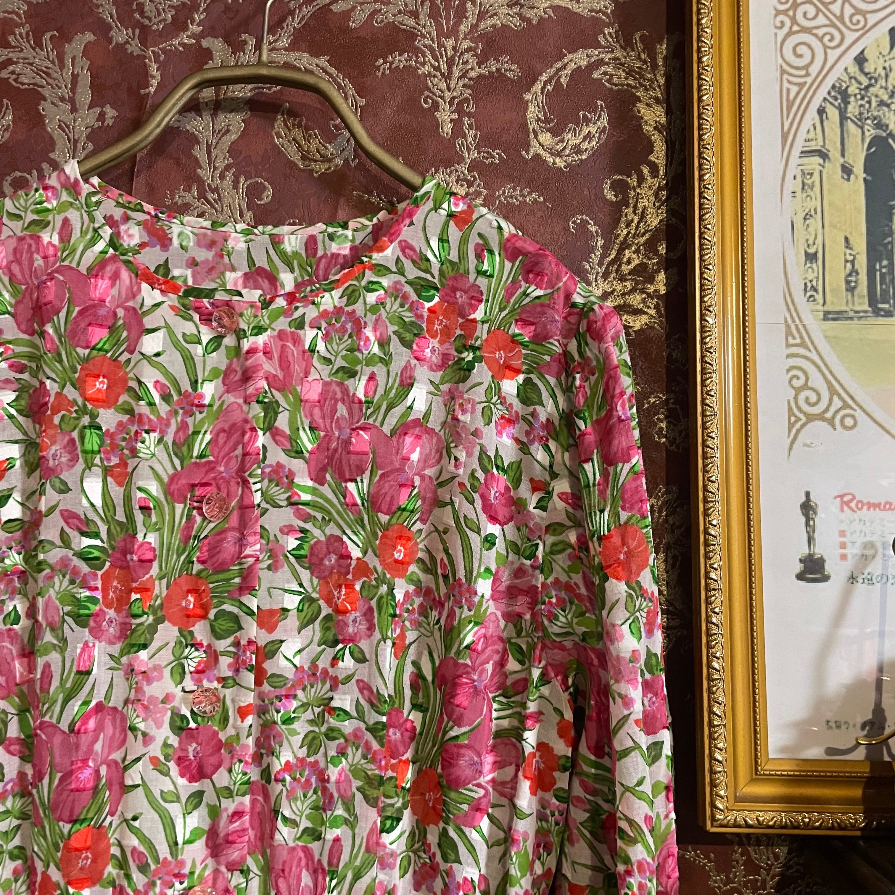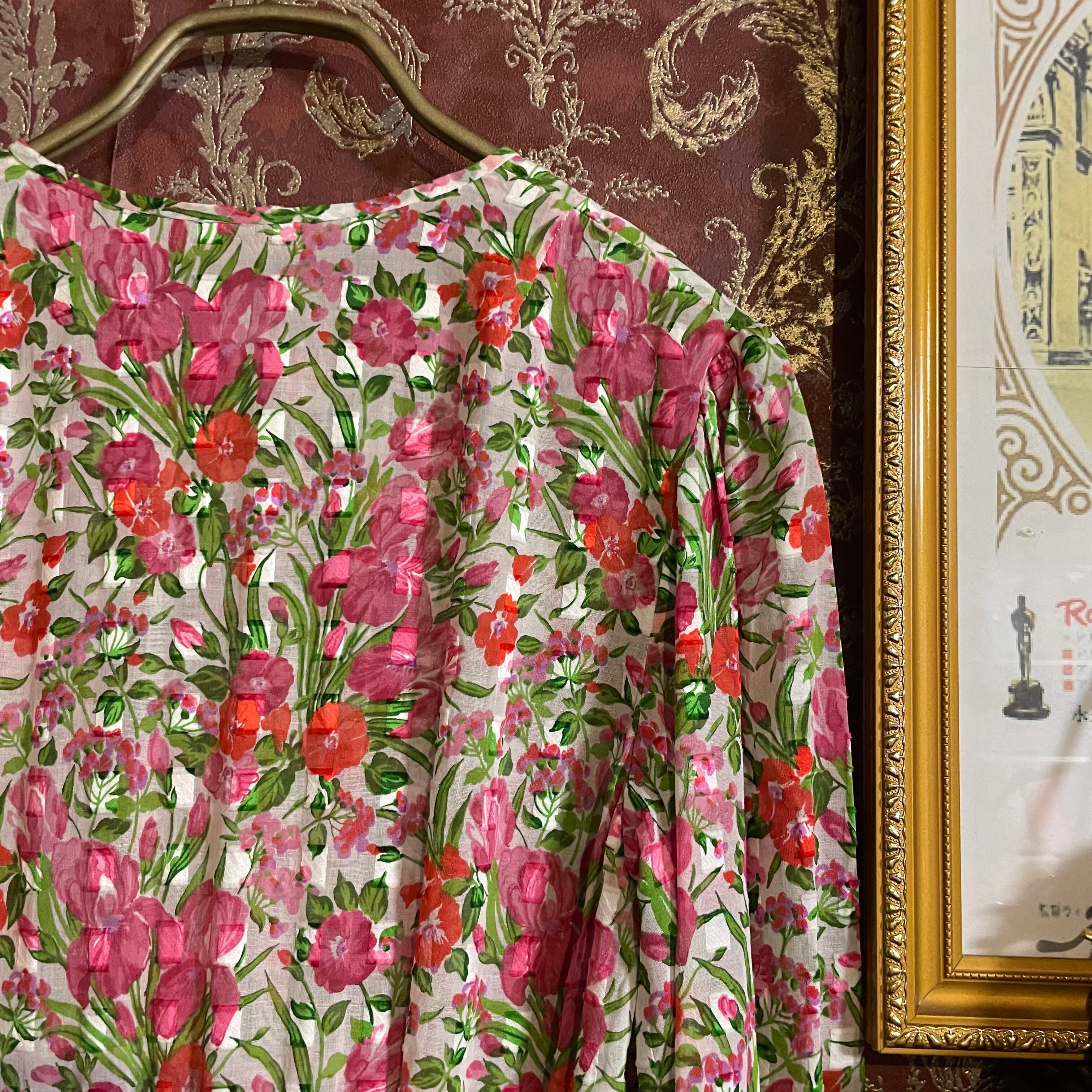 白地に鮮やかなピンクの花柄が目を引くワンピースです。